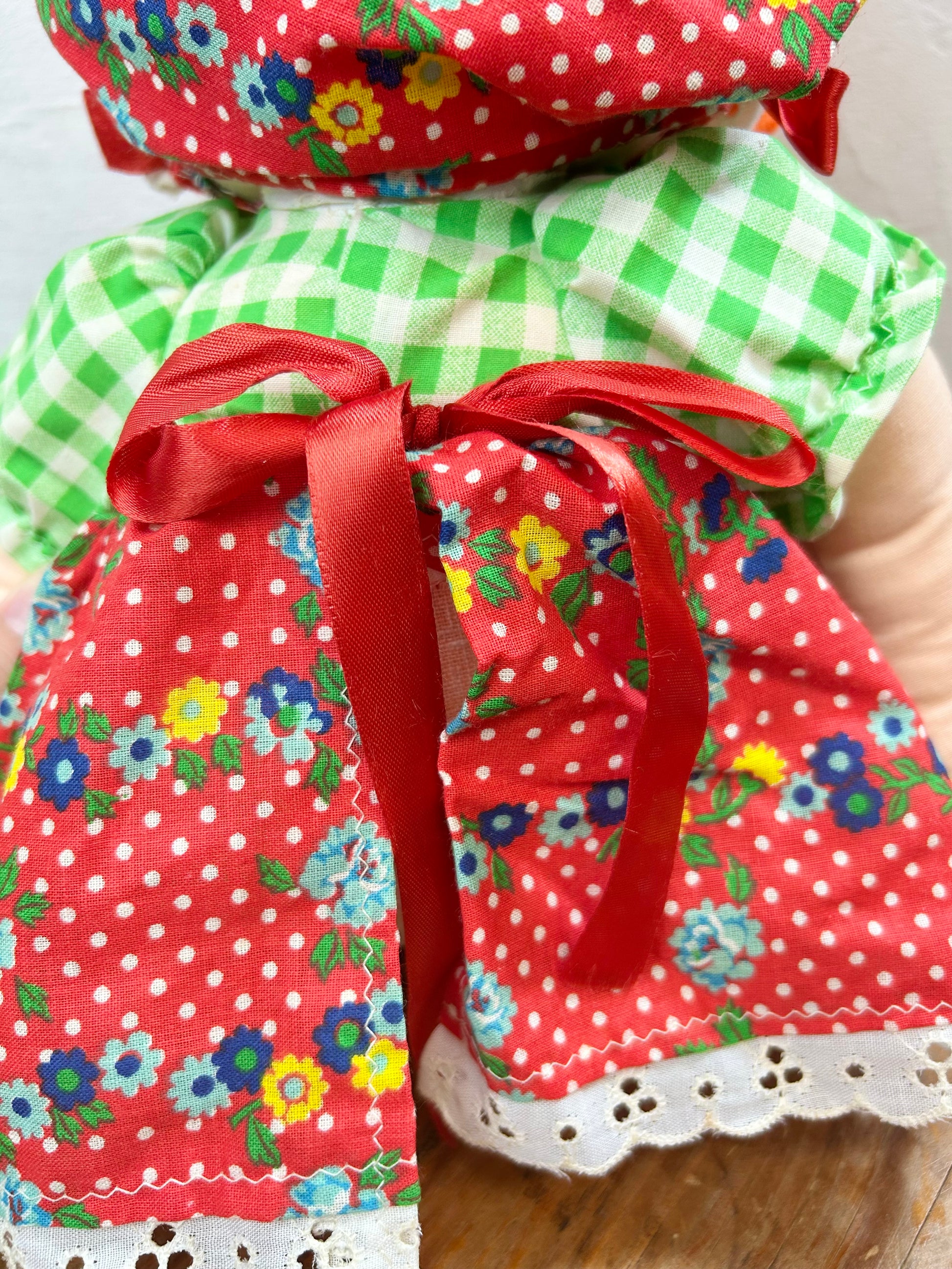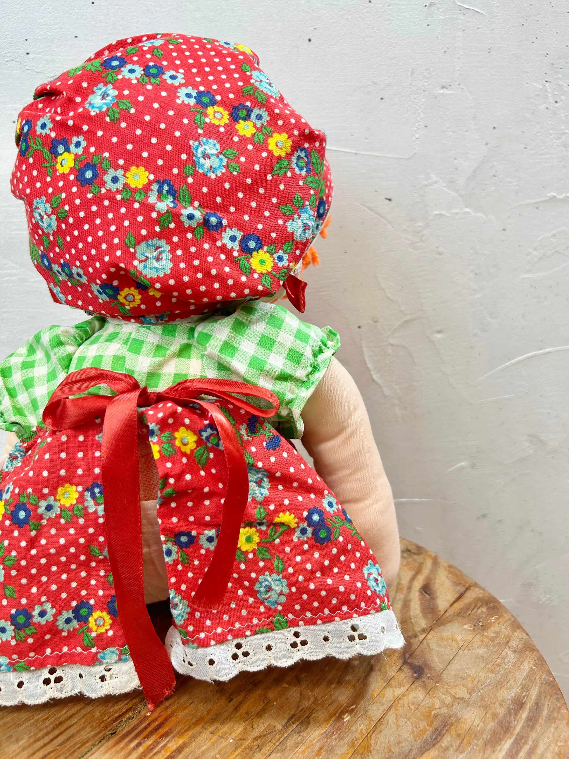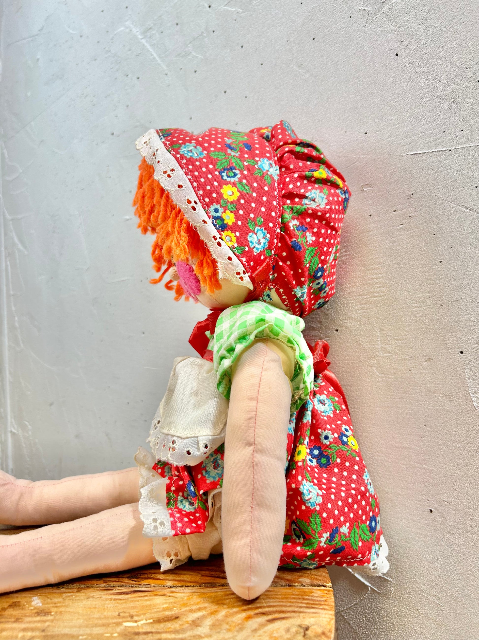 この時代らしい花柄とギンガムチェックのワンピースにボンネットを着た女の子のぬいぐるみです。
