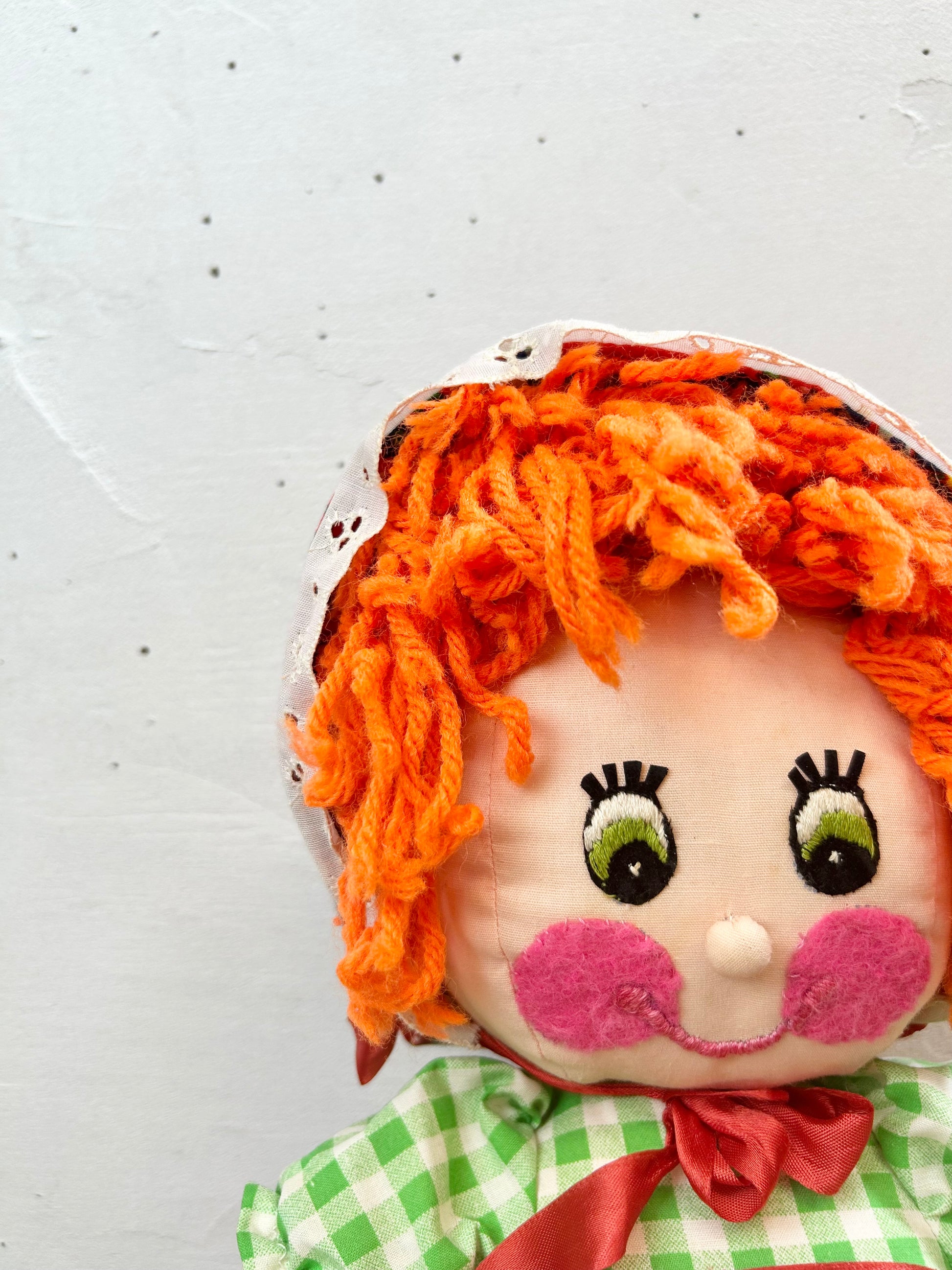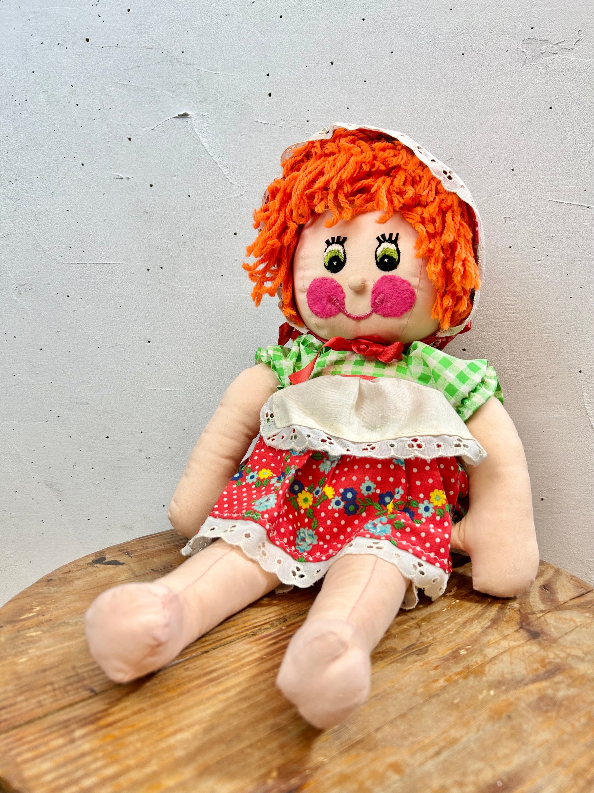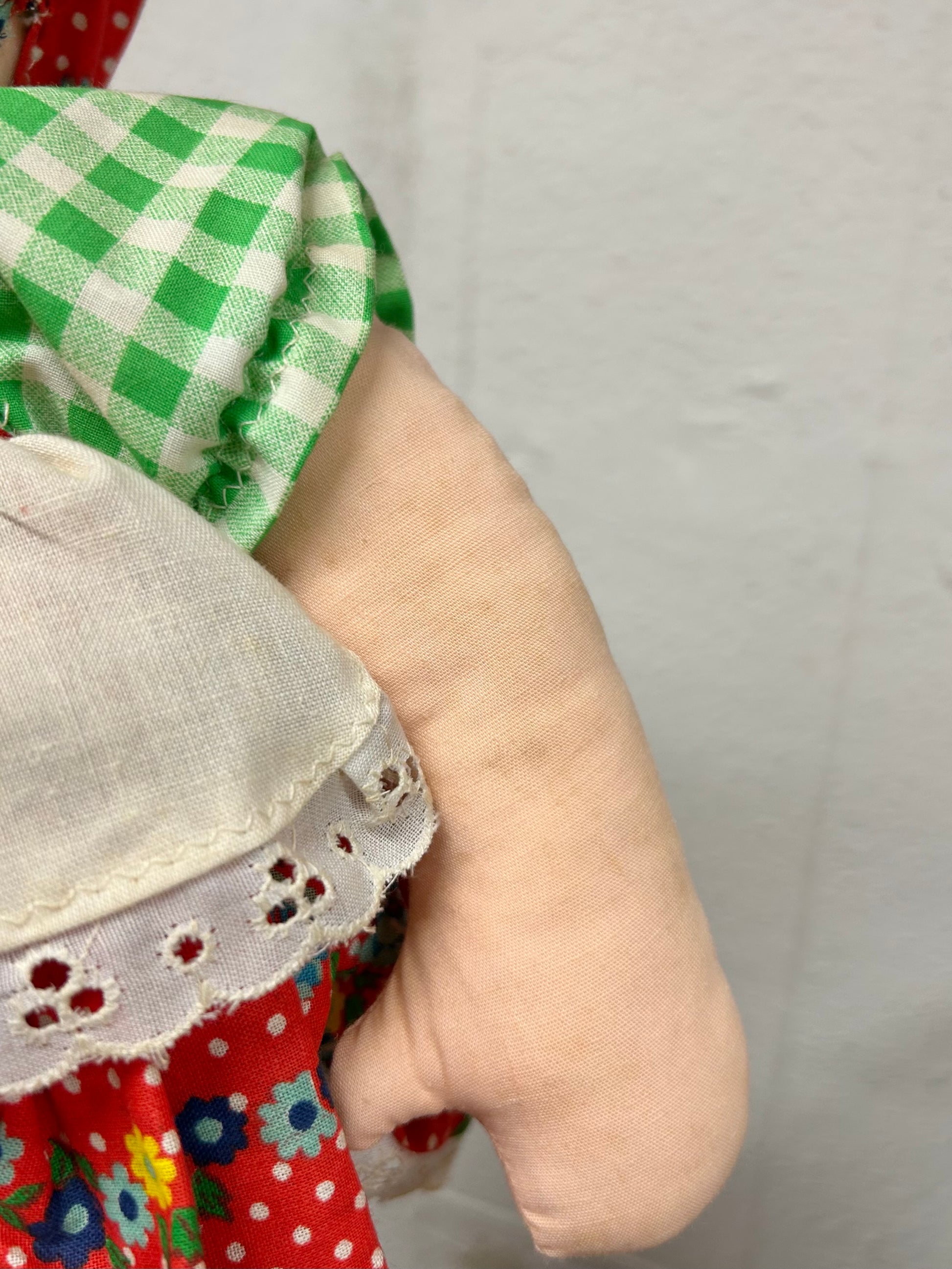 この時代らしい花柄とギンガムチェックのワンピースにボンネットを着た女の子のぬいぐるみです。
