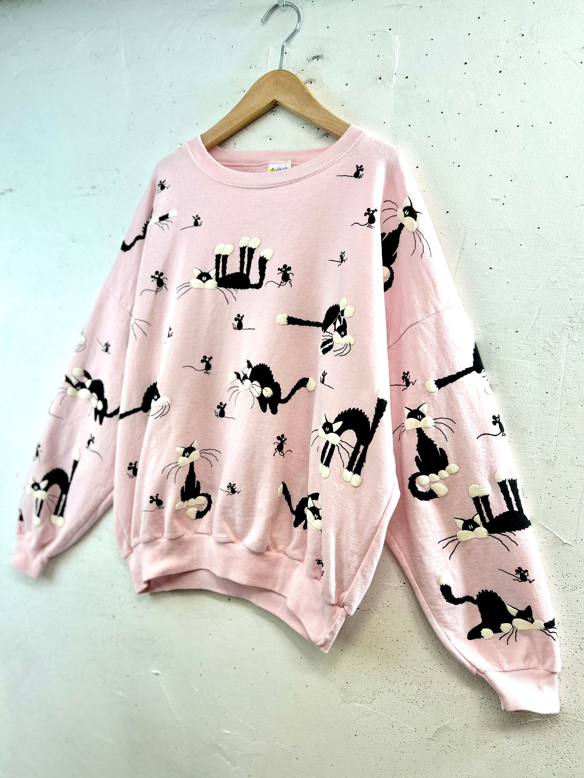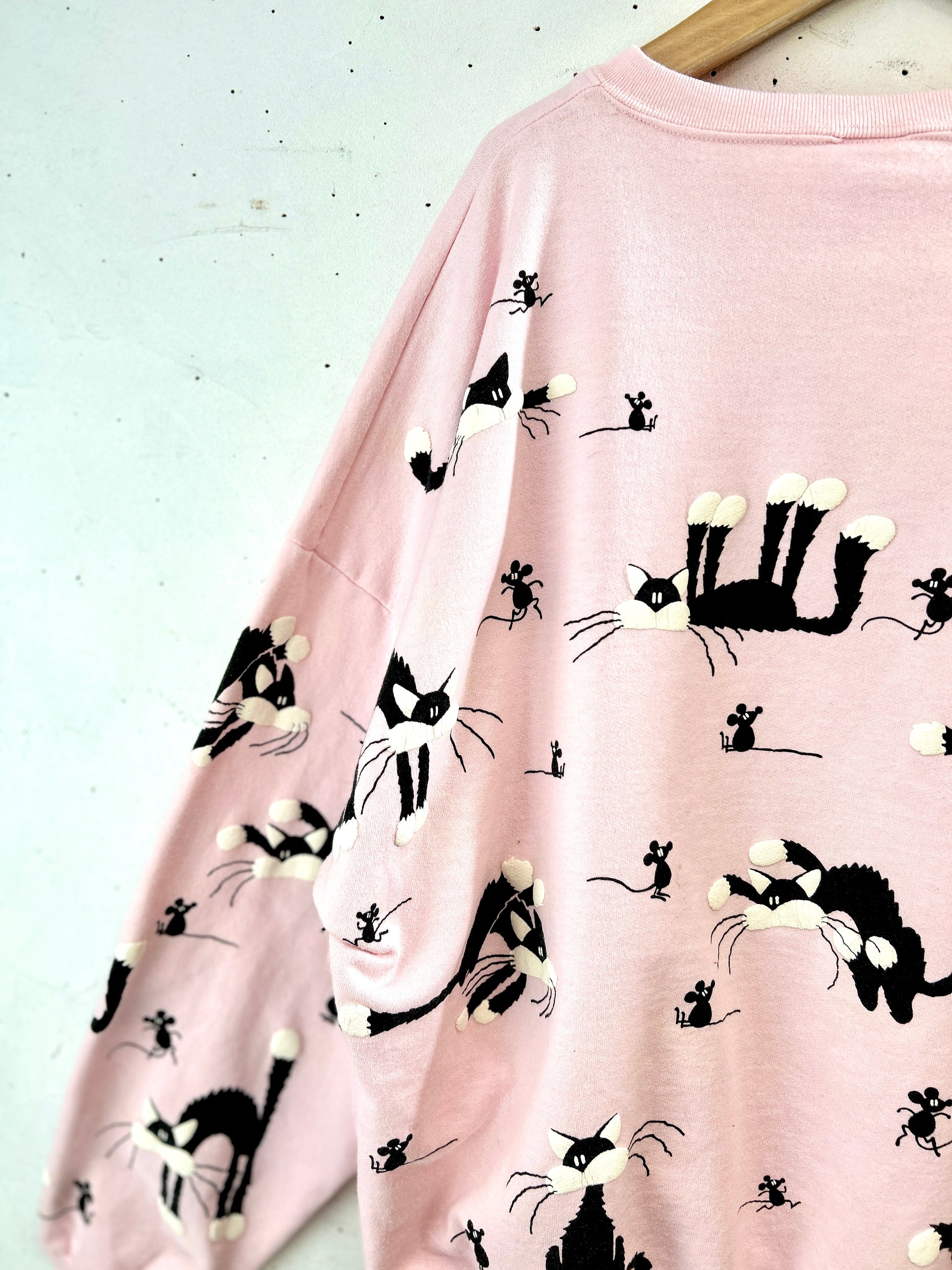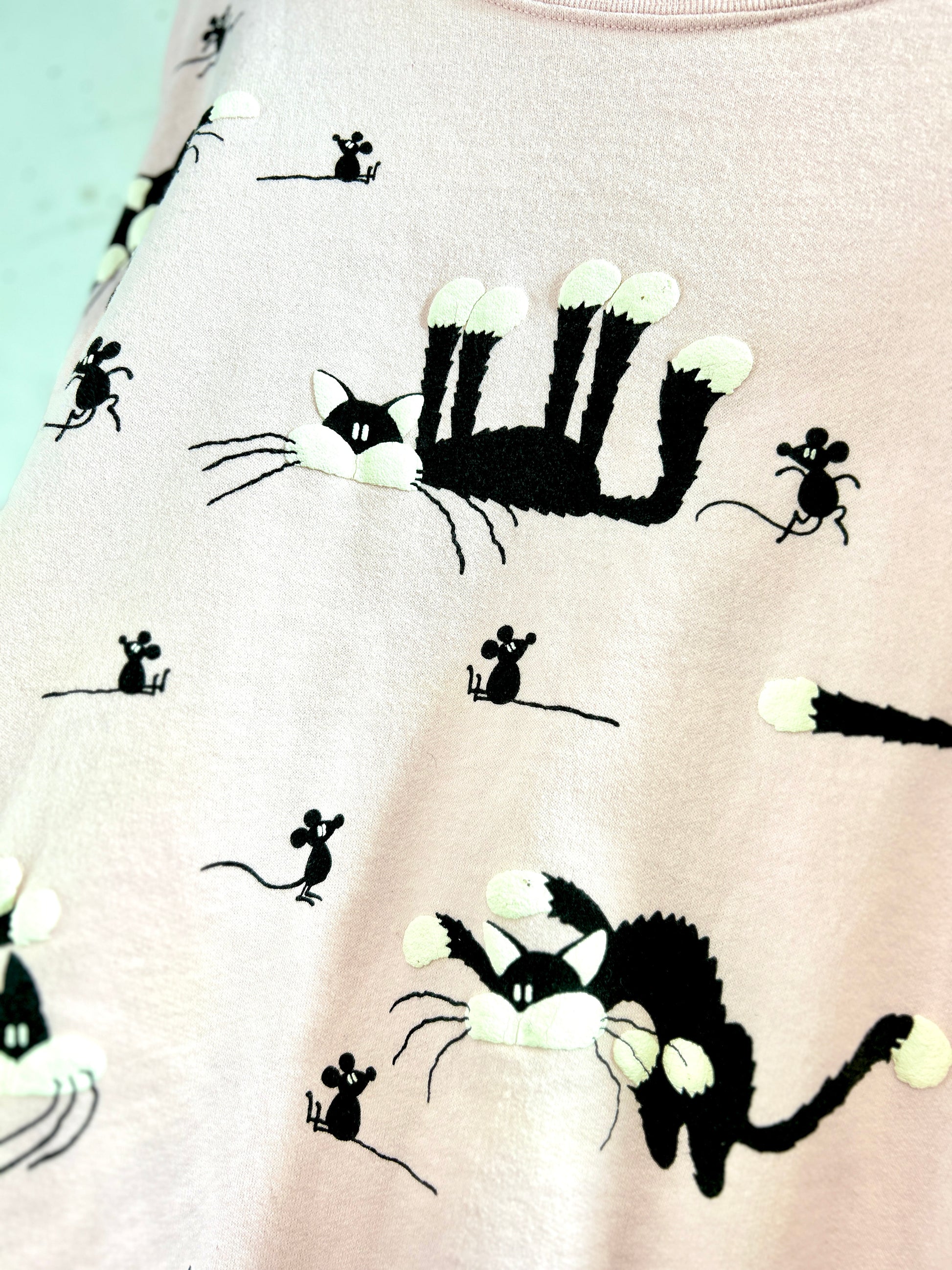 薄いピンクボディにネズミと猫の追いかけっこプリントが可愛らしい一着。