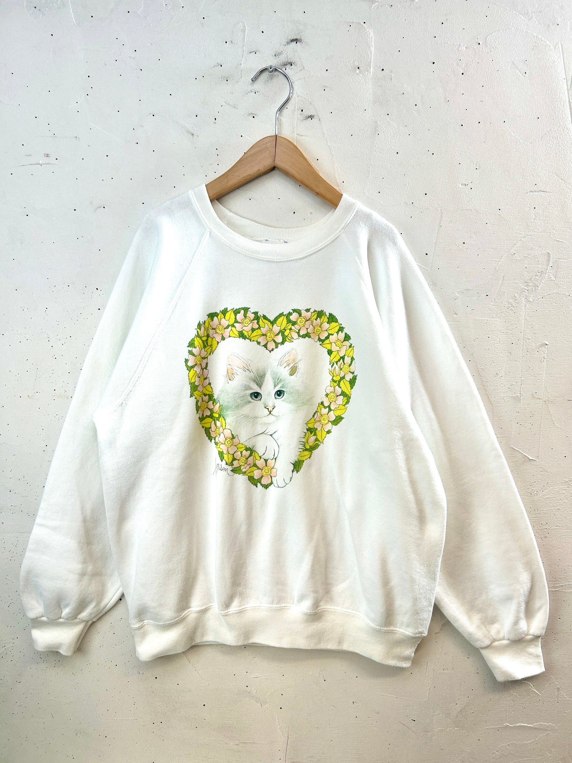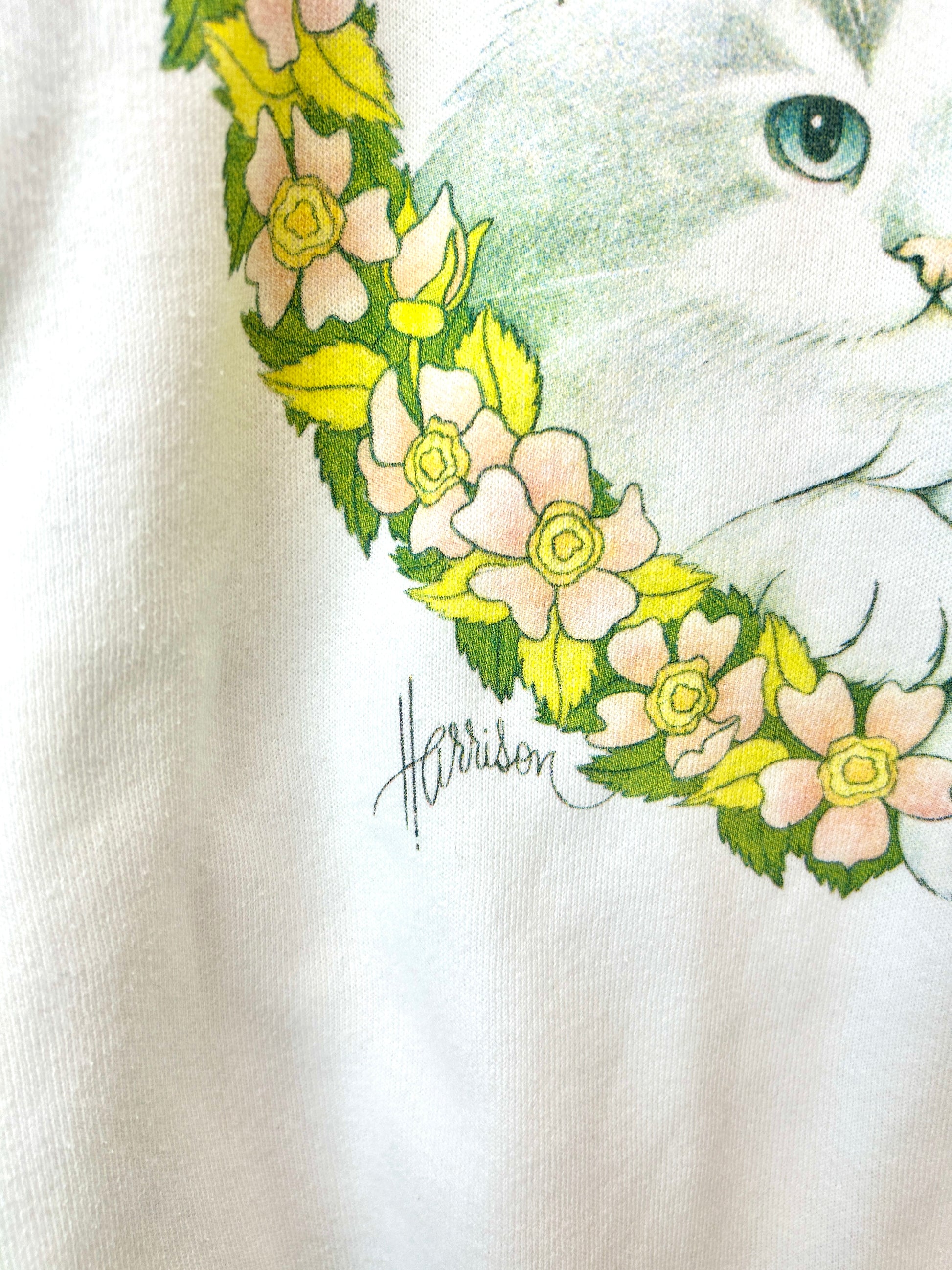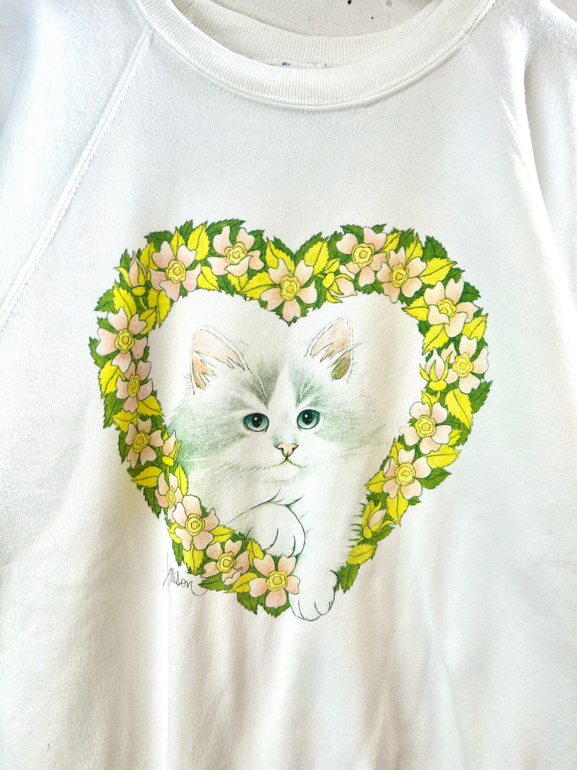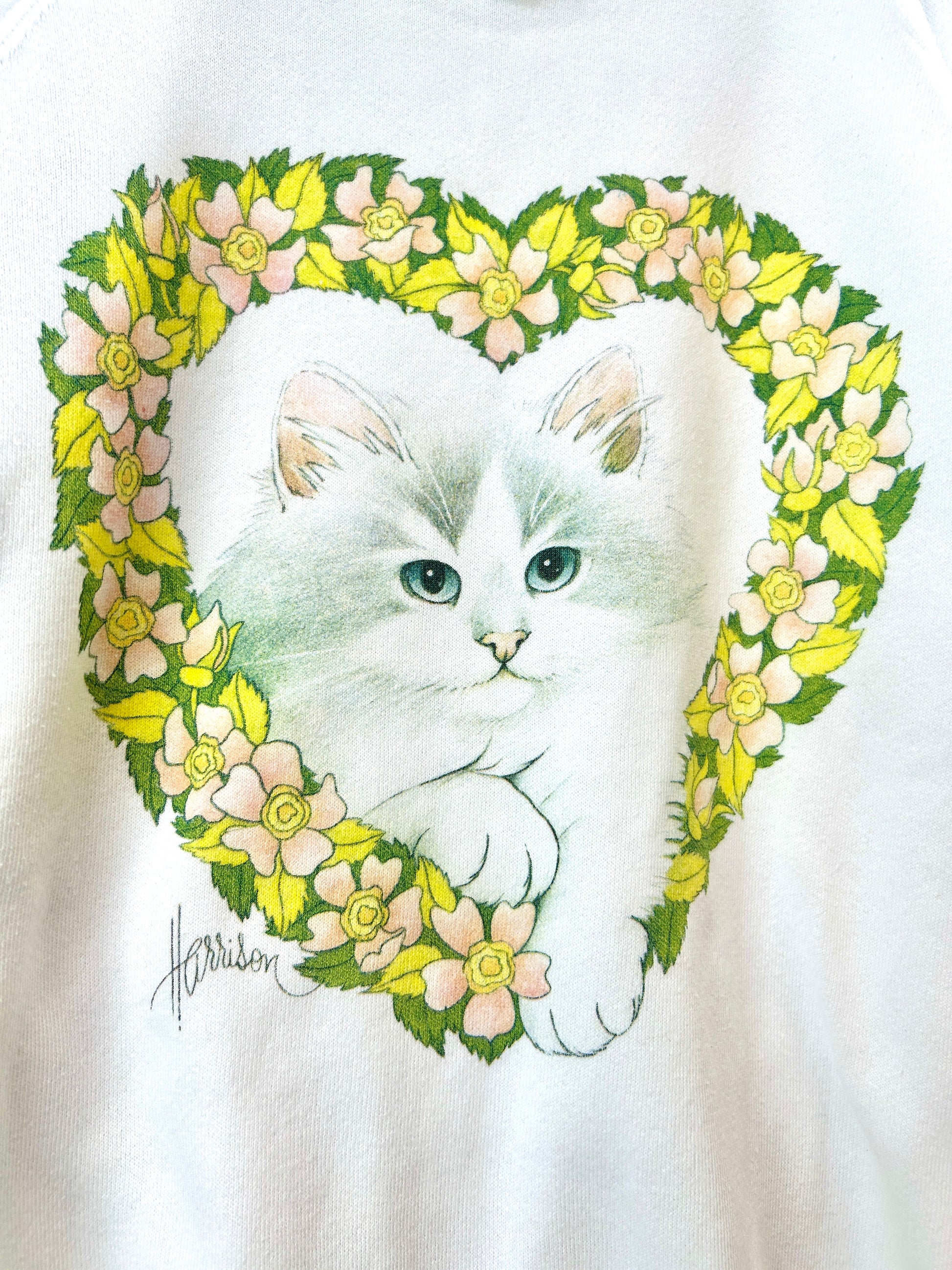 ホワイトボディ、フラワーリーフから覗く猫のプリントが可愛いアイテム。