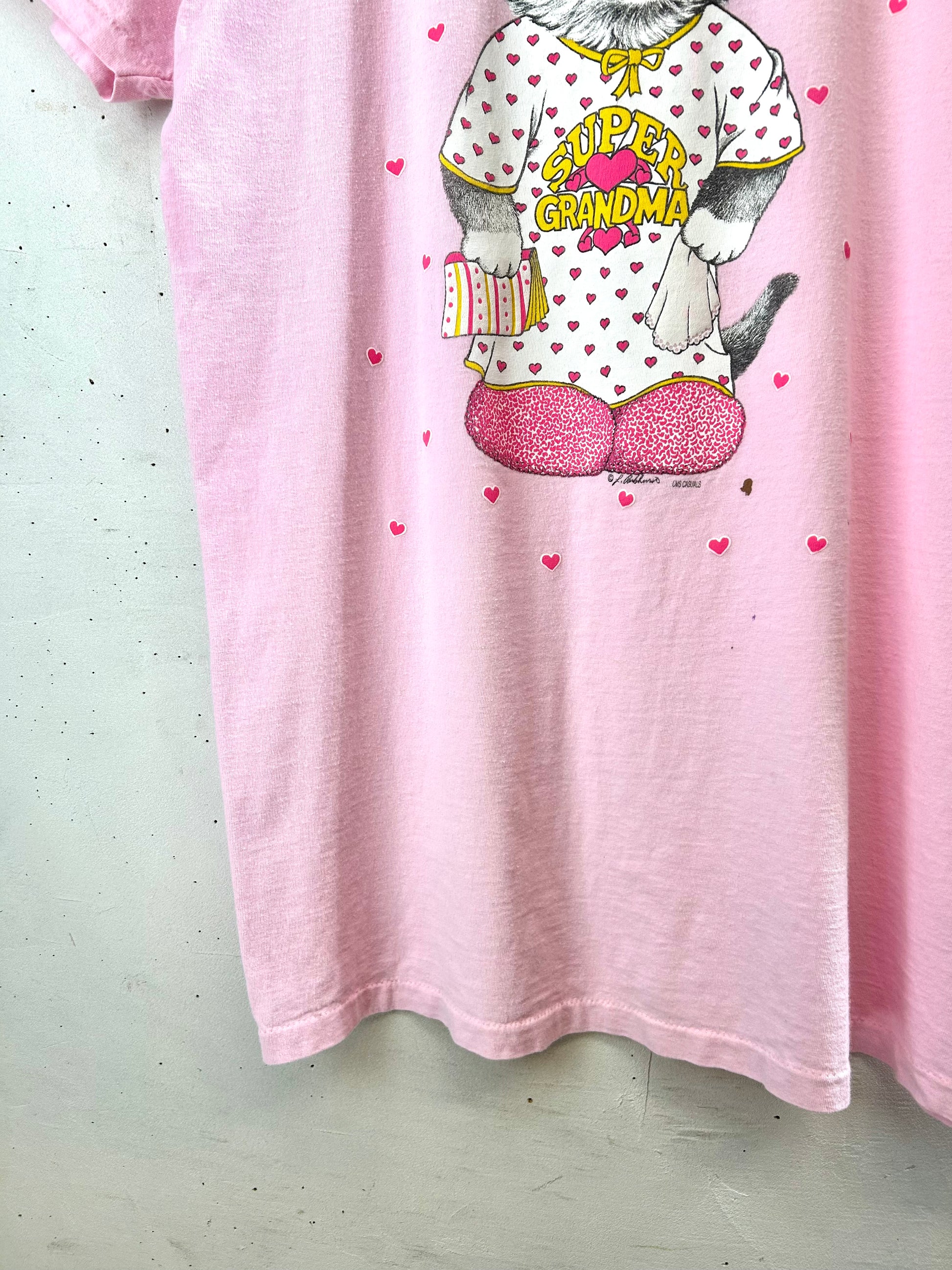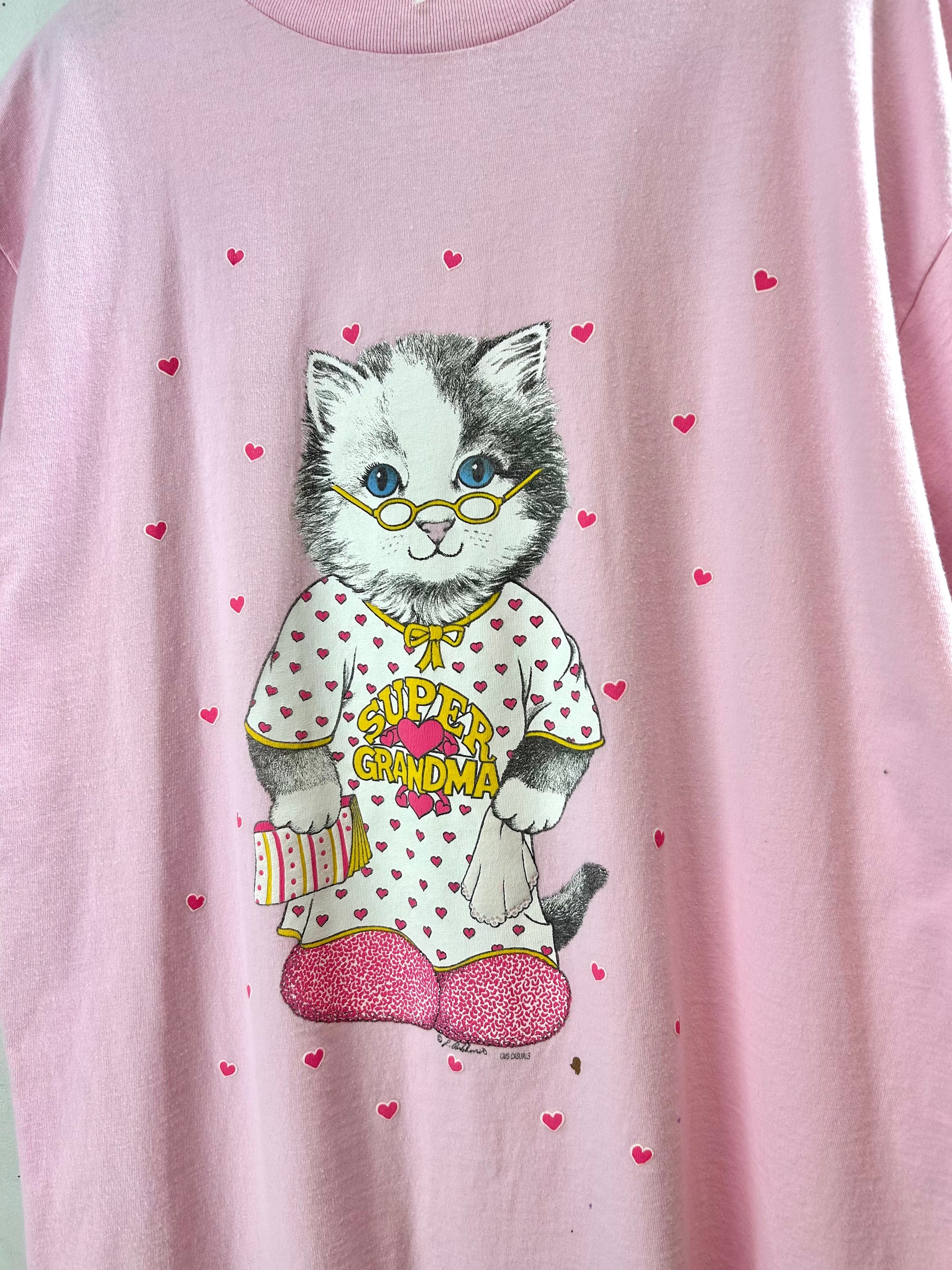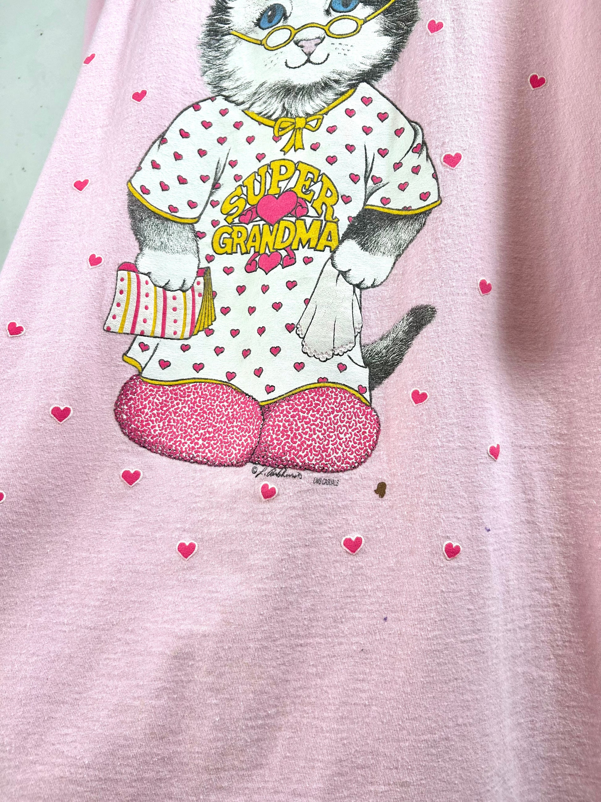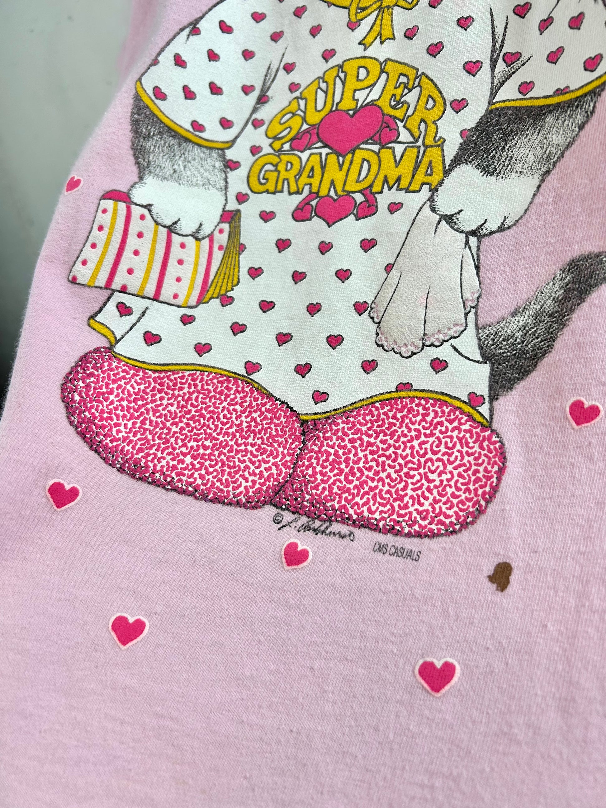 ピンクボディ、スーパーグランマと書かれたキュートな服を着たおばあちゃんネコのプリントが可愛い一着。