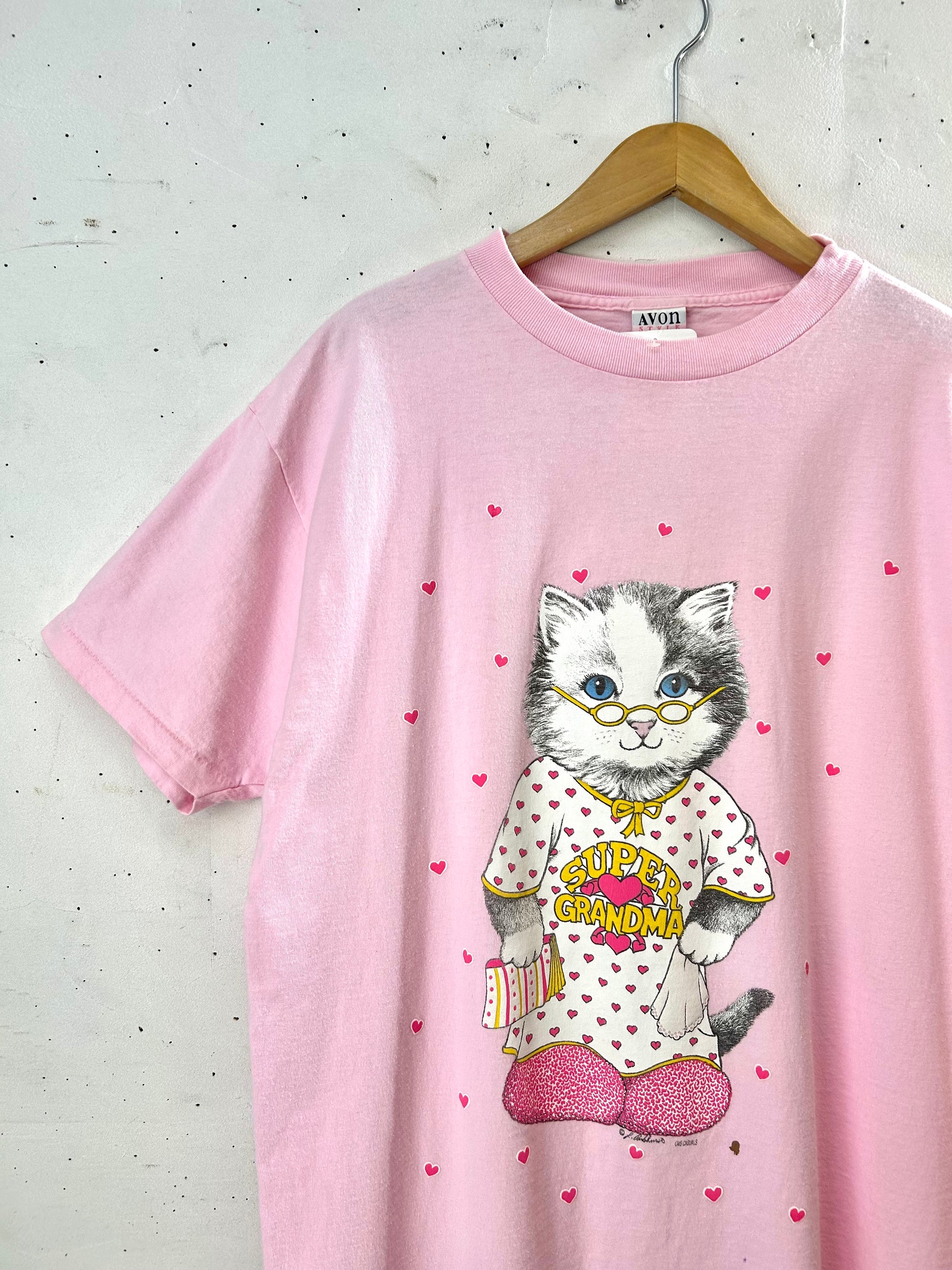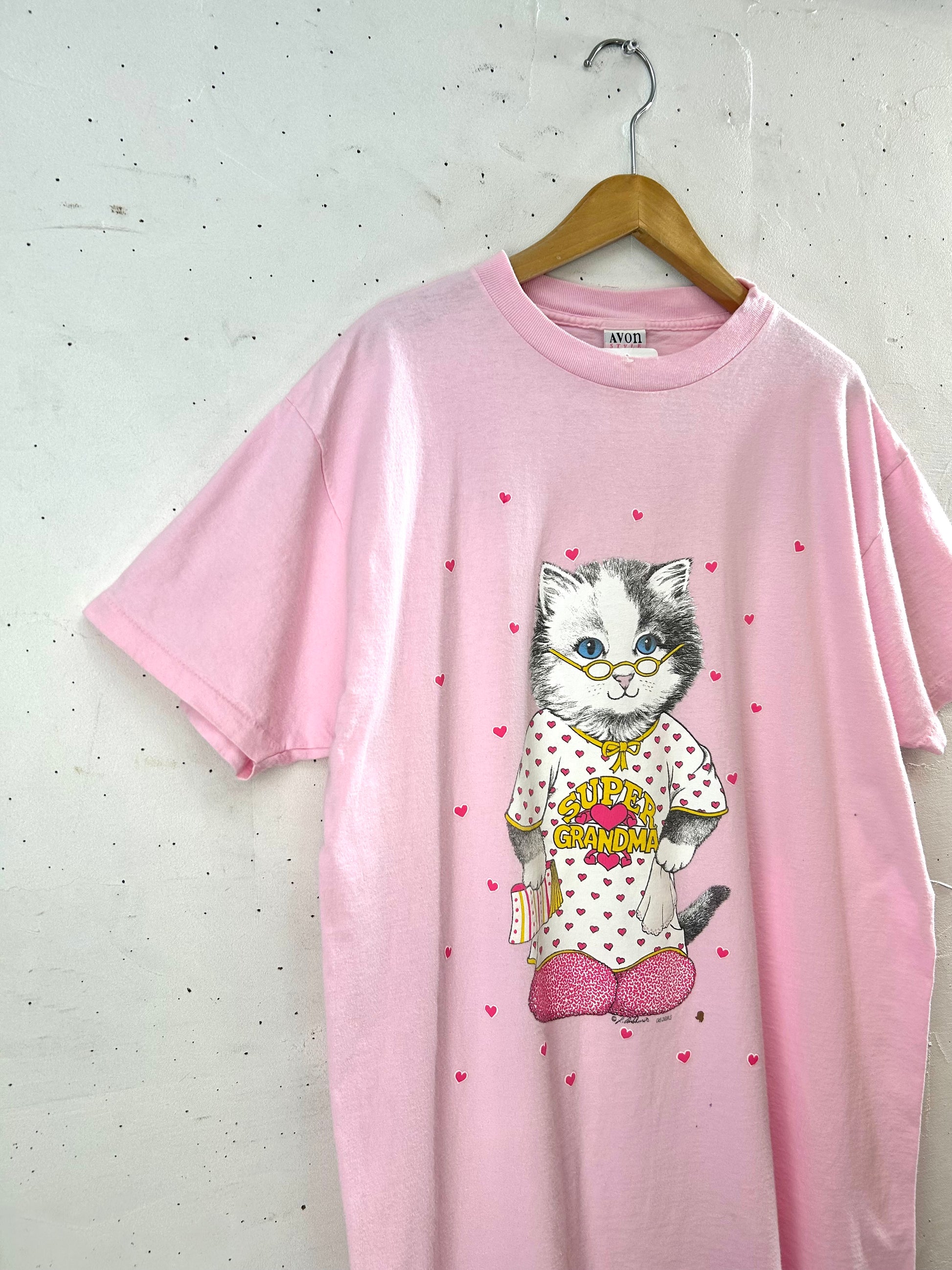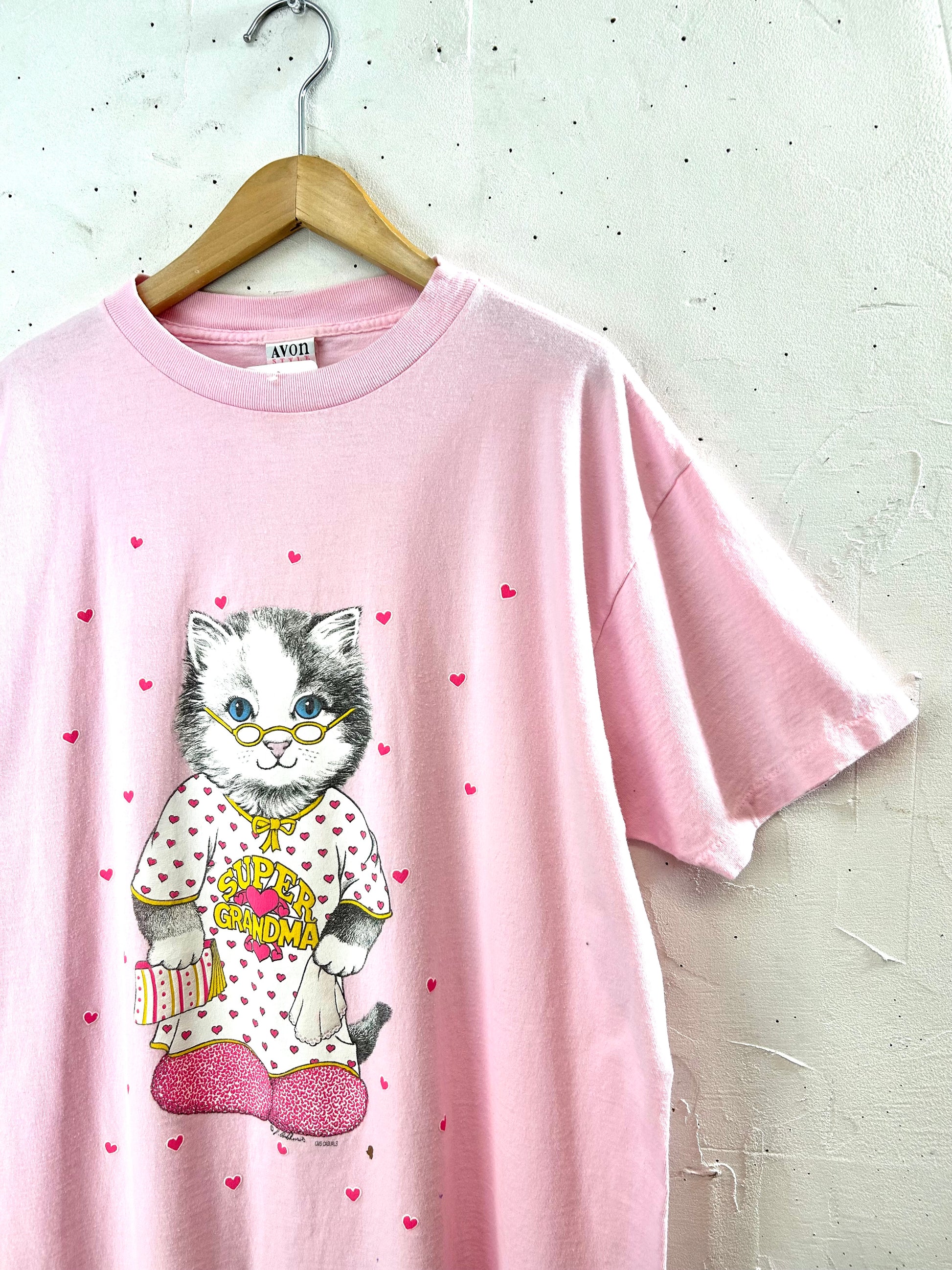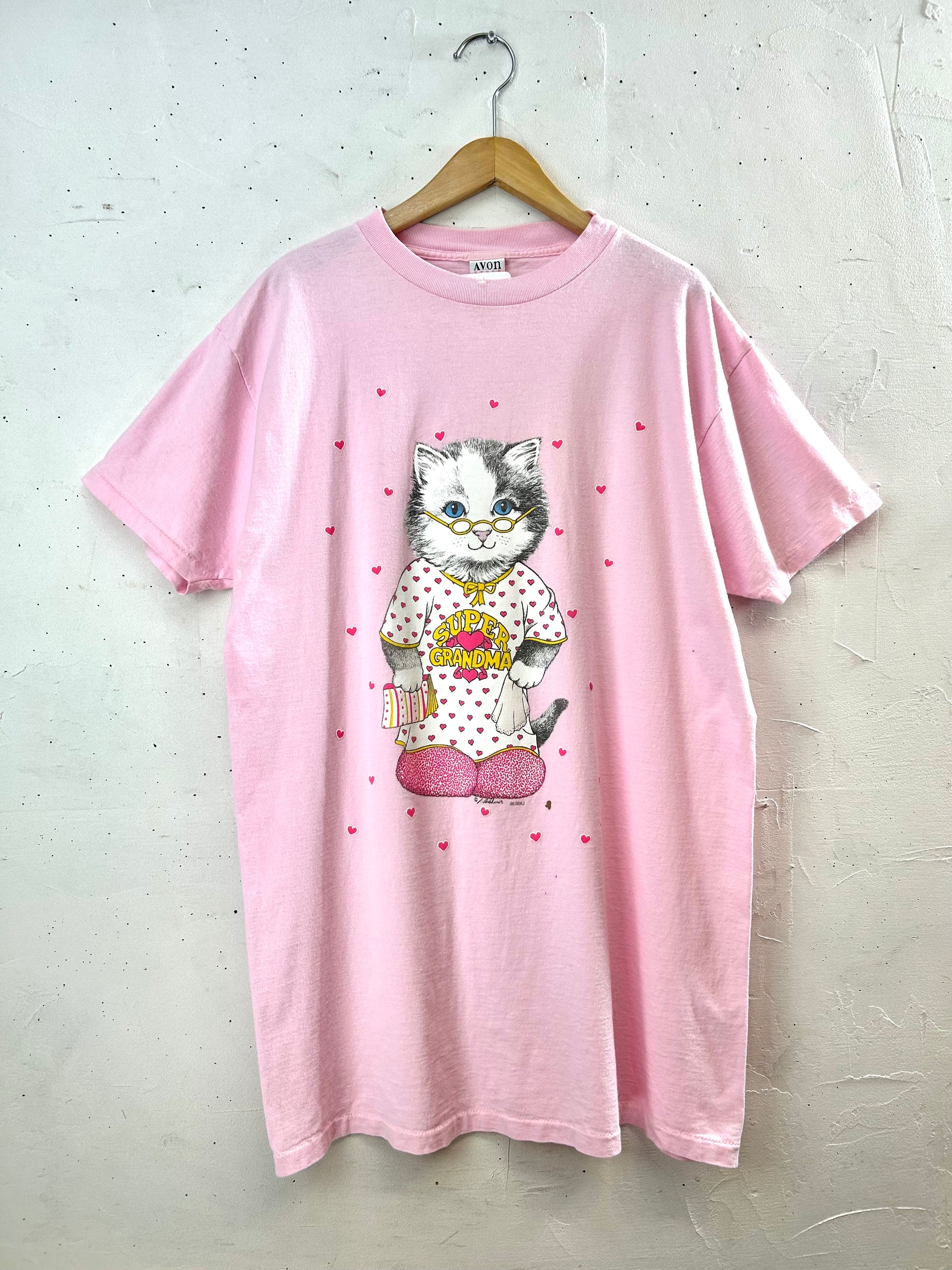 ピンクボディ、スーパーグランマと書かれたキュートな服を着たおばあちゃんネコのプリントが可愛い一着。