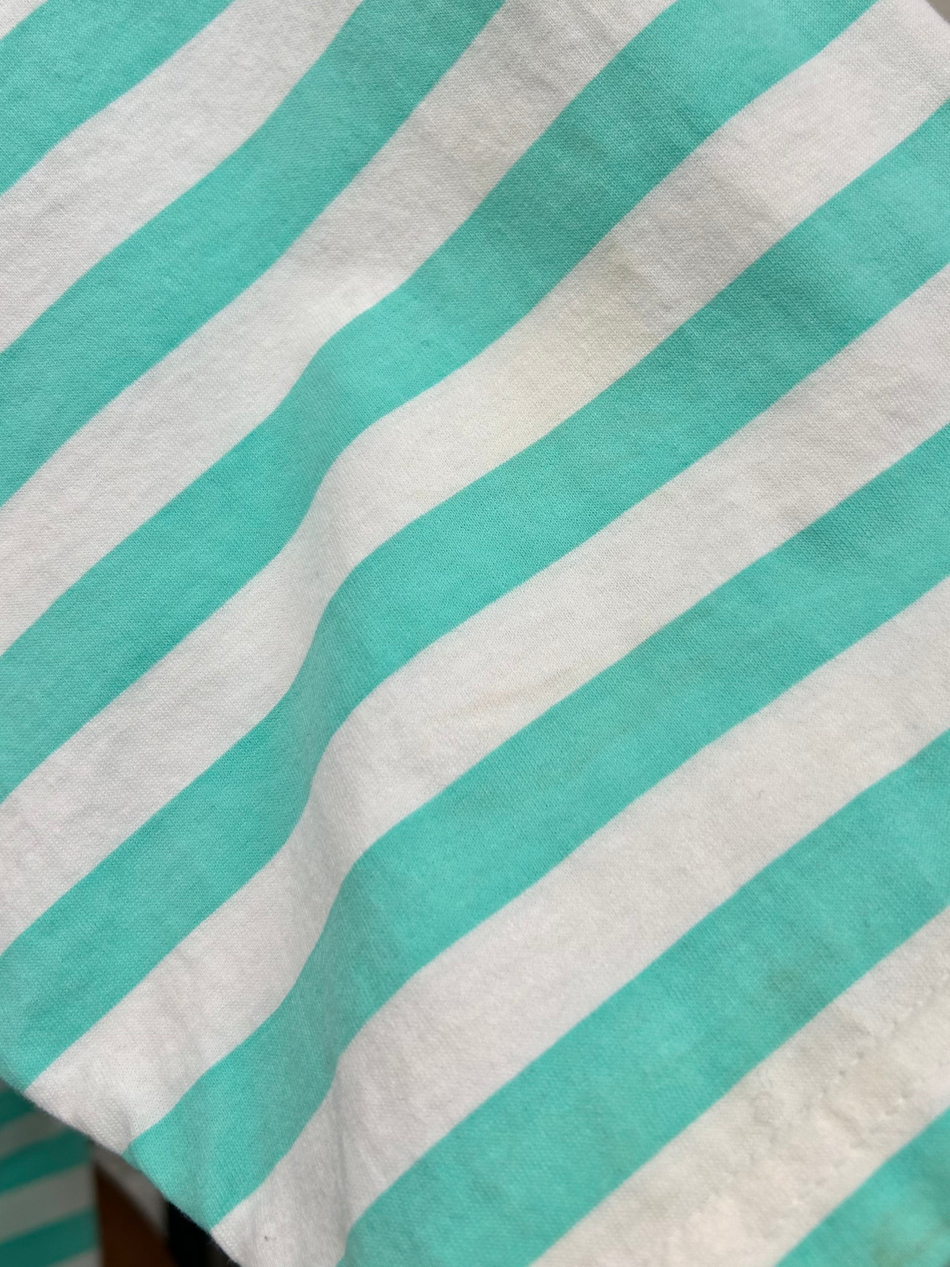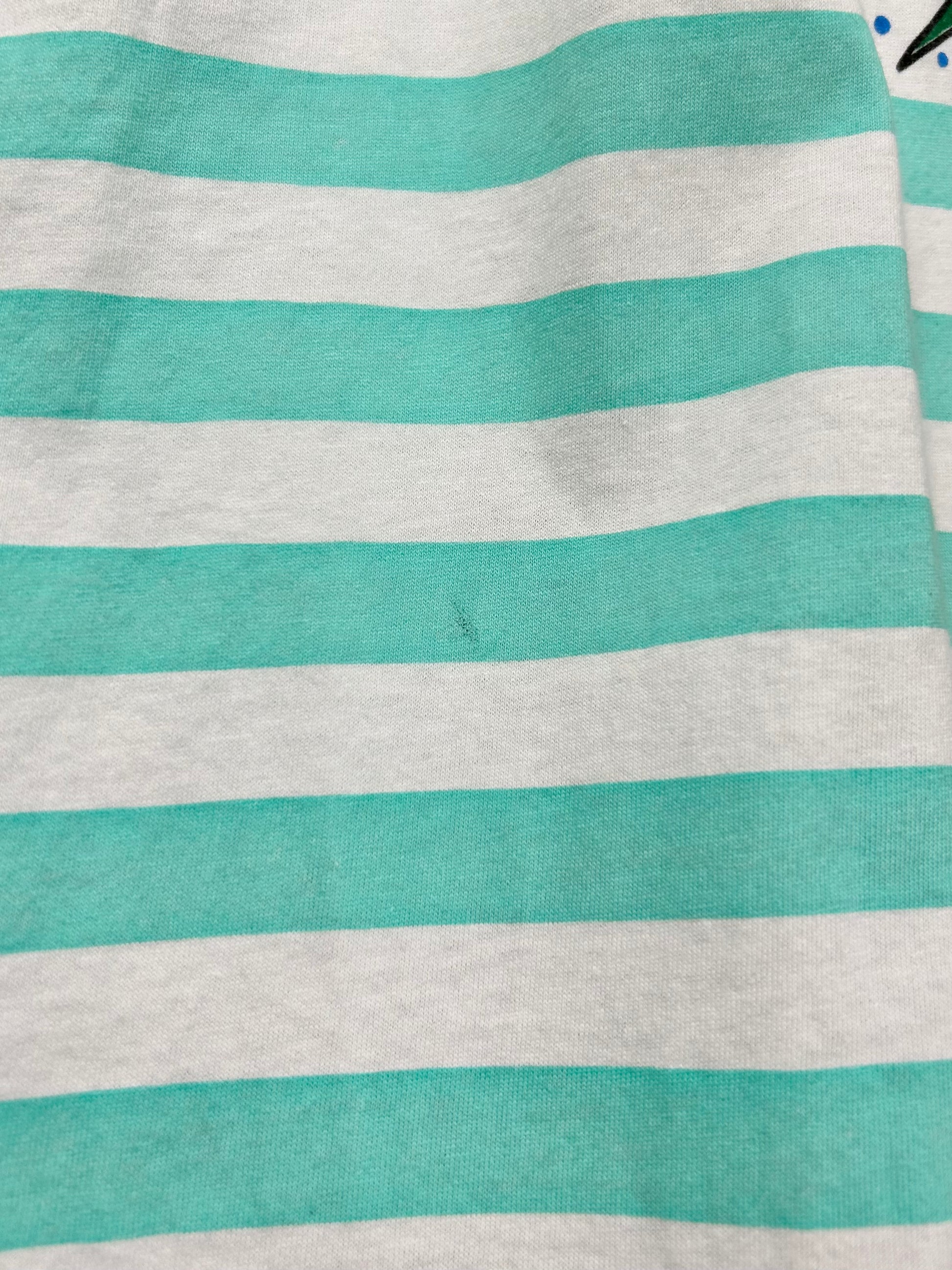 ミントグリーンのボーダーボディにファニーなキャラクターのプリントが目を引く1着。