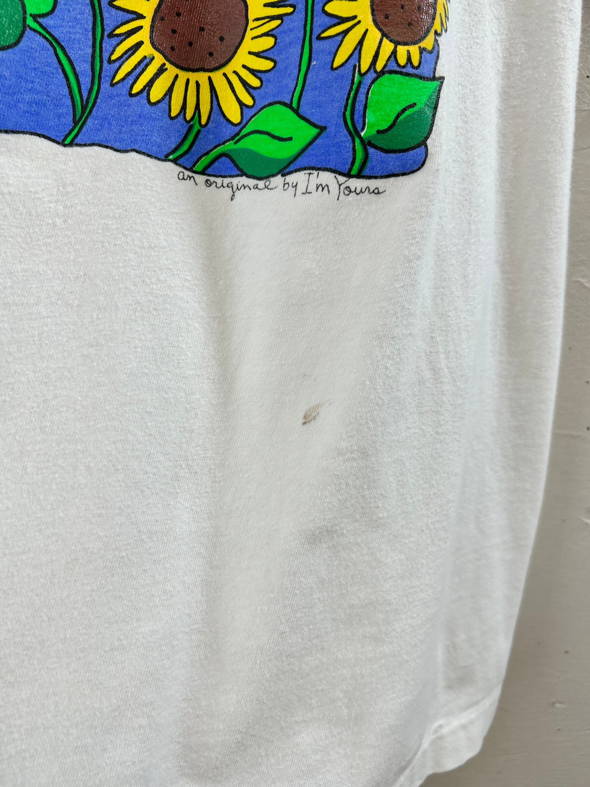 ホワイトボディにカラフルな背景とひまわりのプリントが目を惹く一着。