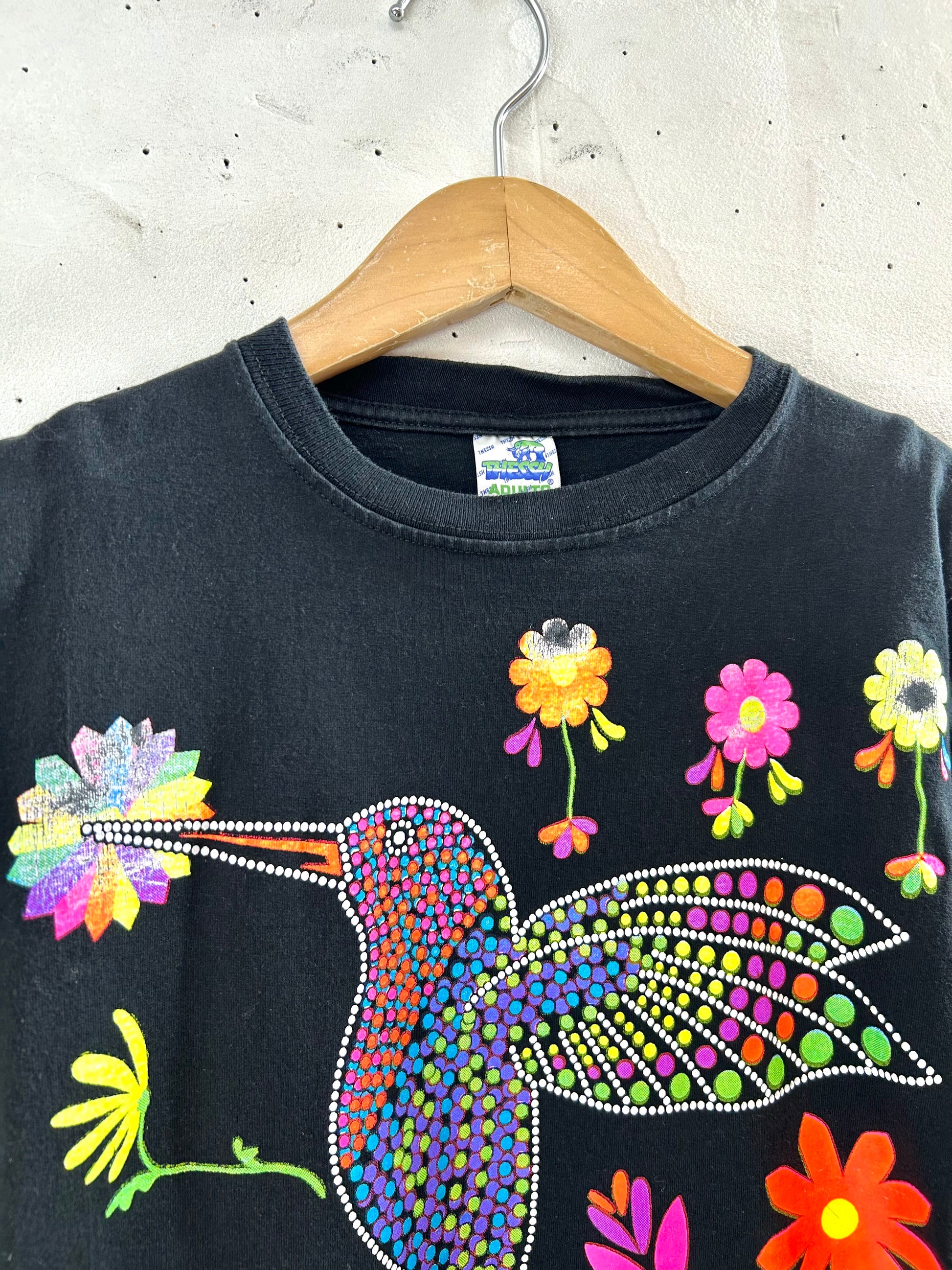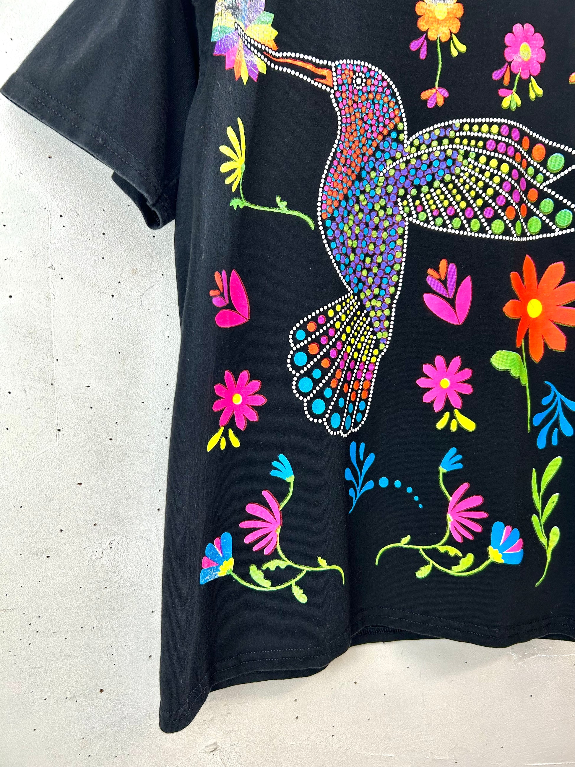 ブラックボディに、ハチドリのビビットなプリントがキュートな1着。