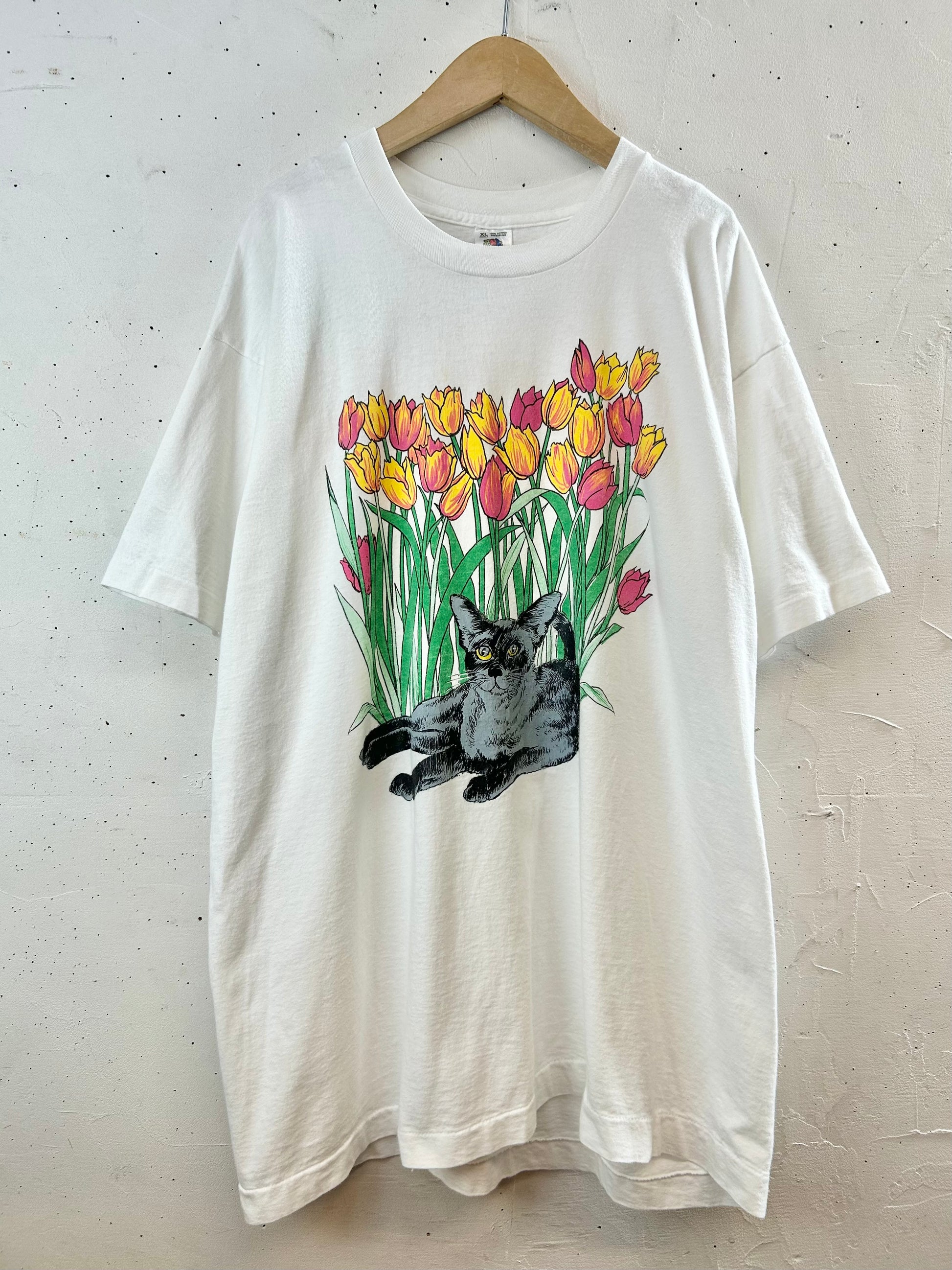 FLUIT OF THE LOOMのボディに、チューリップの前に座っている猫のプリントが可愛い1着。