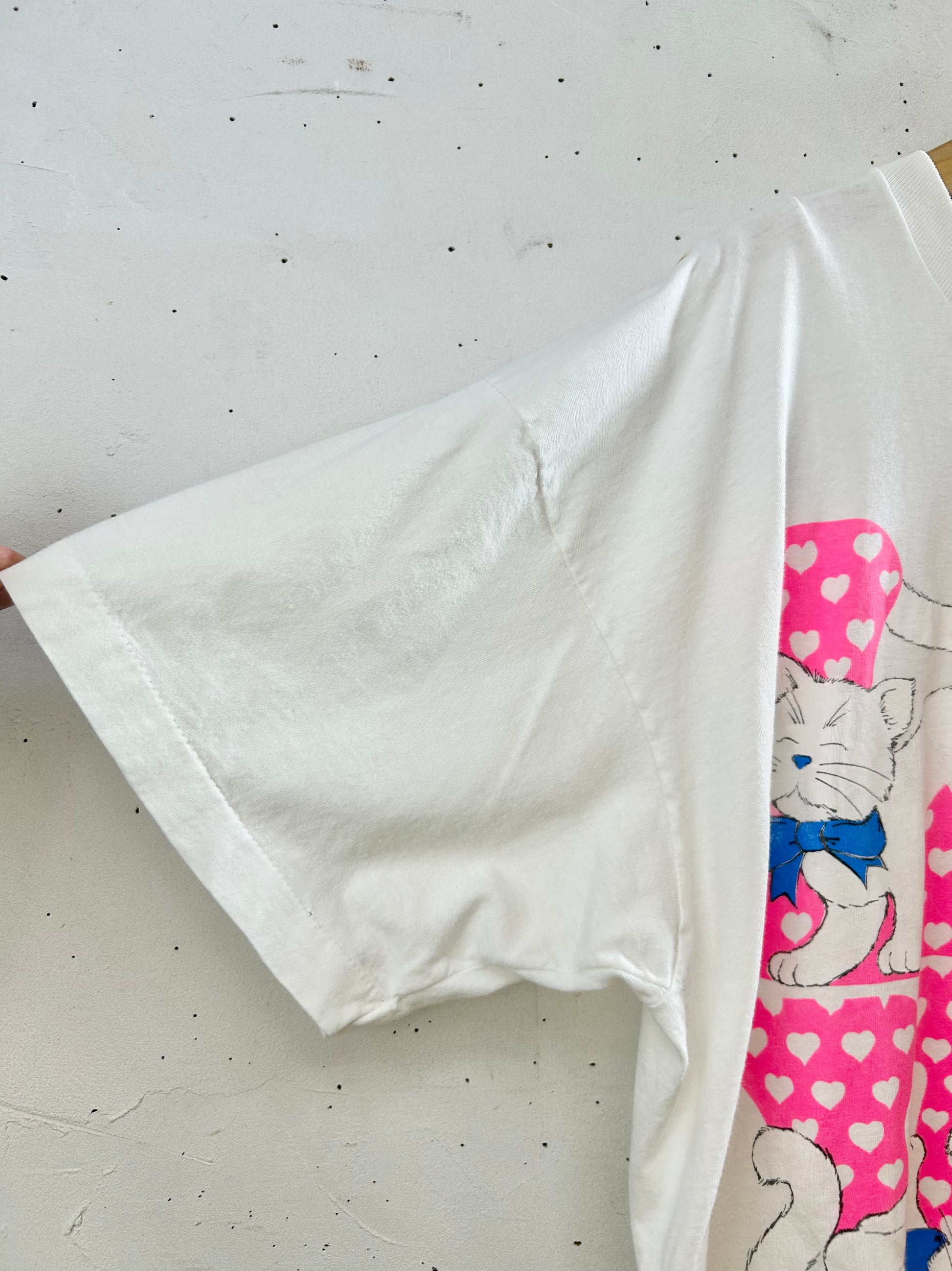ビッグなハート柄のLOVEと戯れる猫のプリントがキュートな一着。