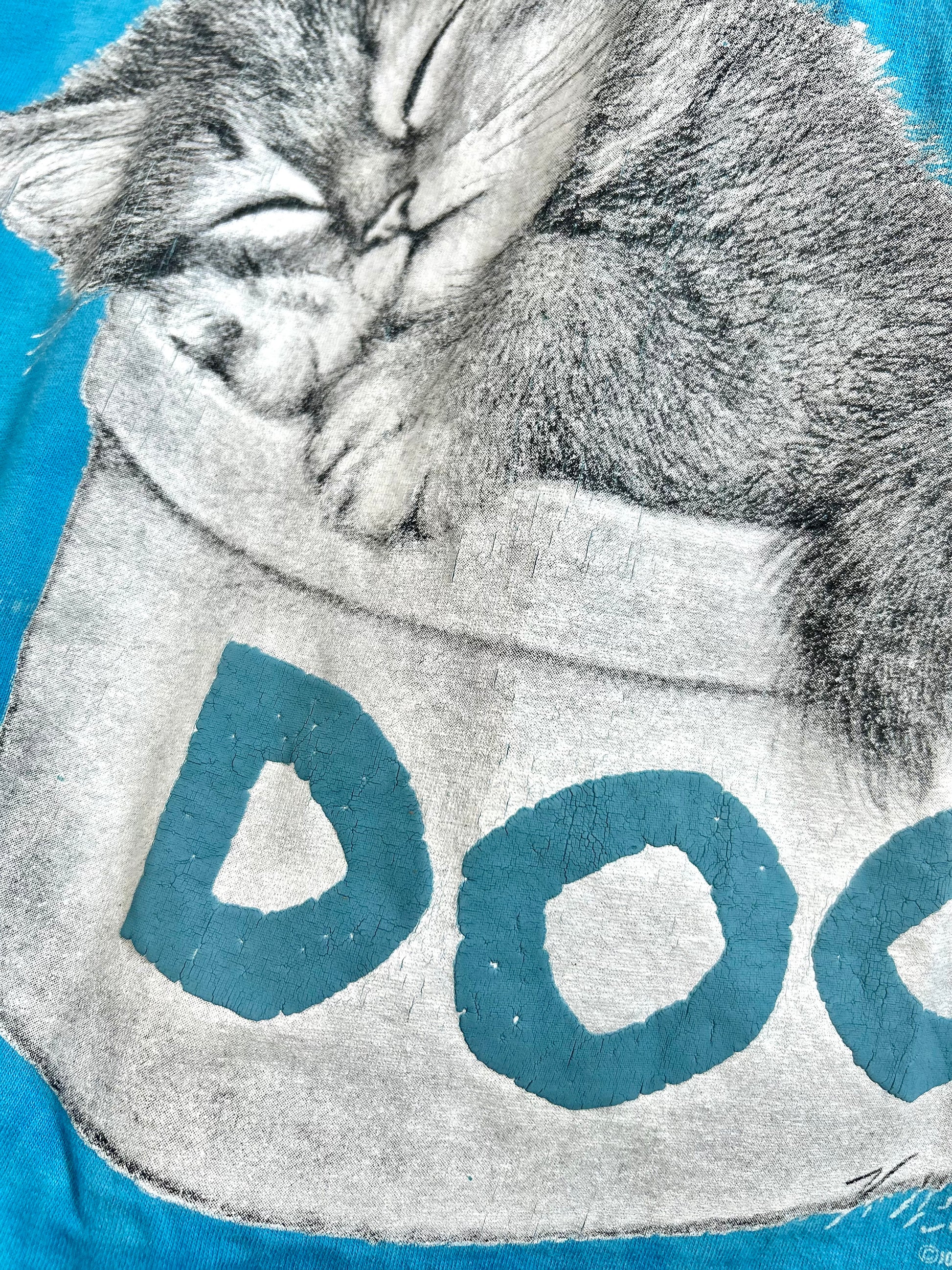 ブルータイダイボディにお休み中の小猫のプリントが可愛い一着。