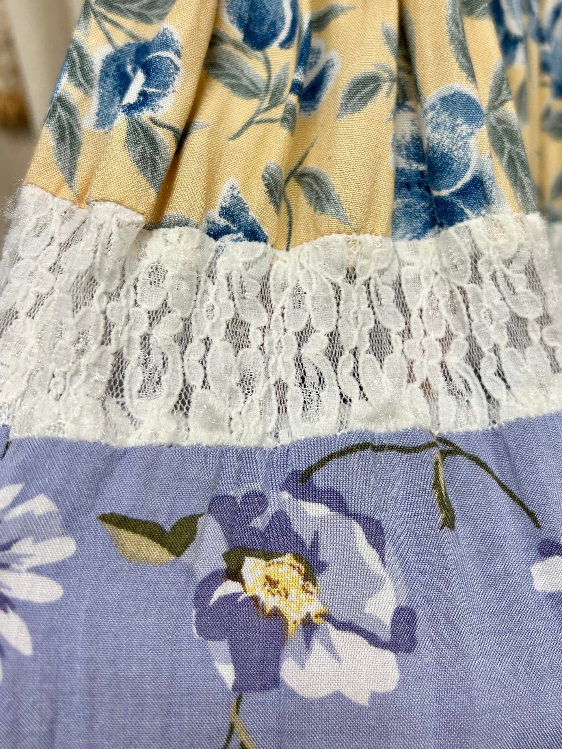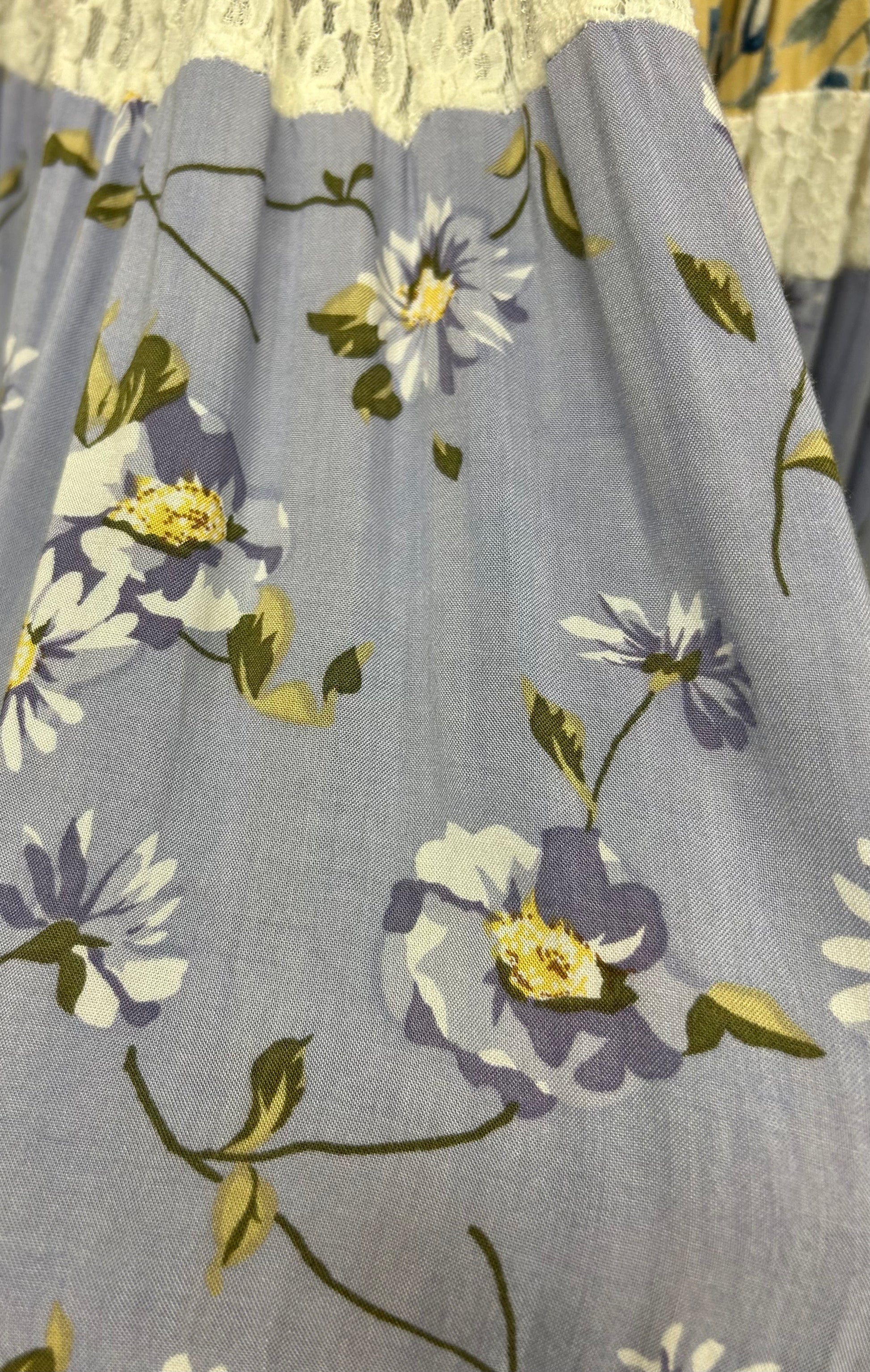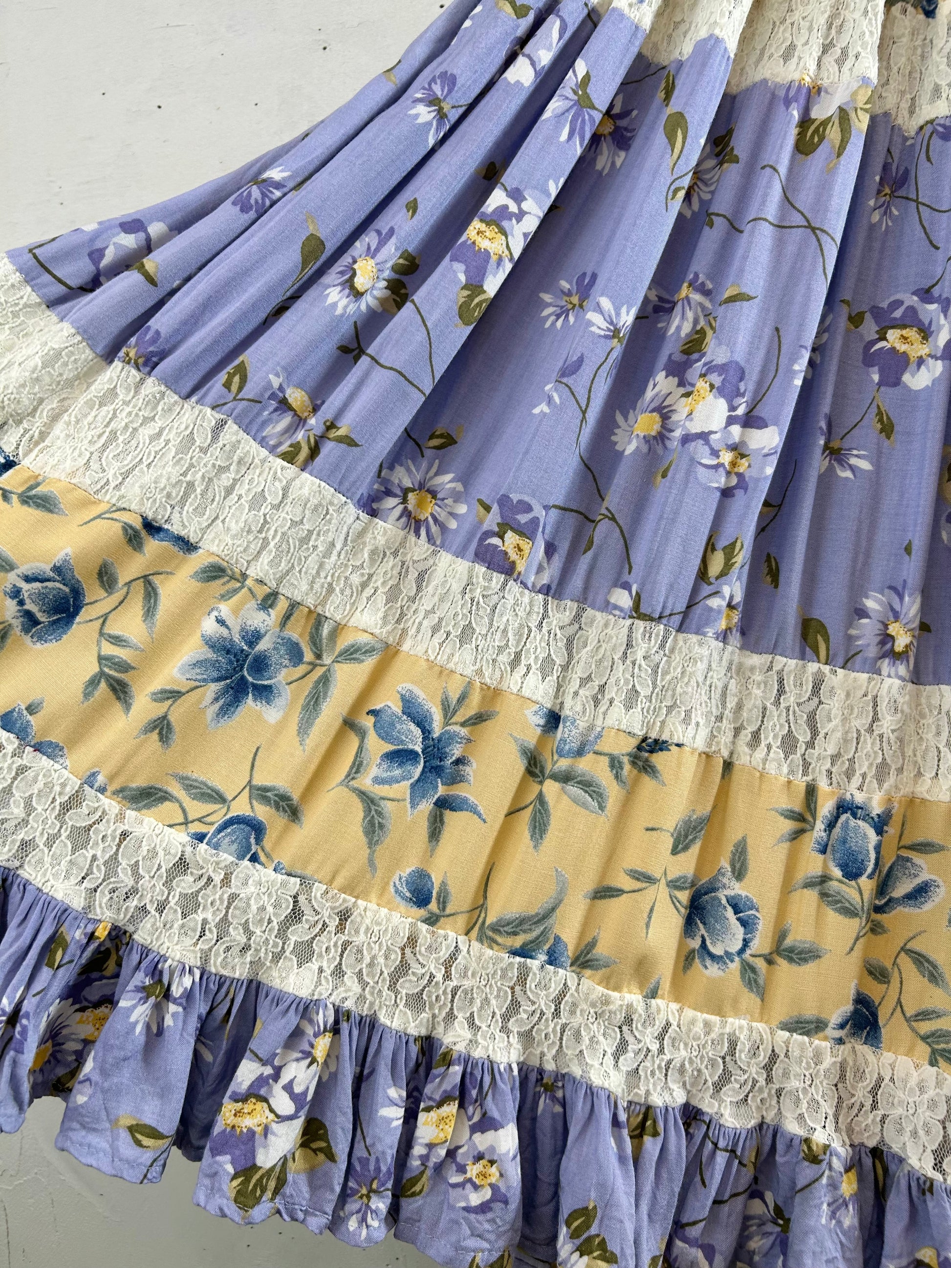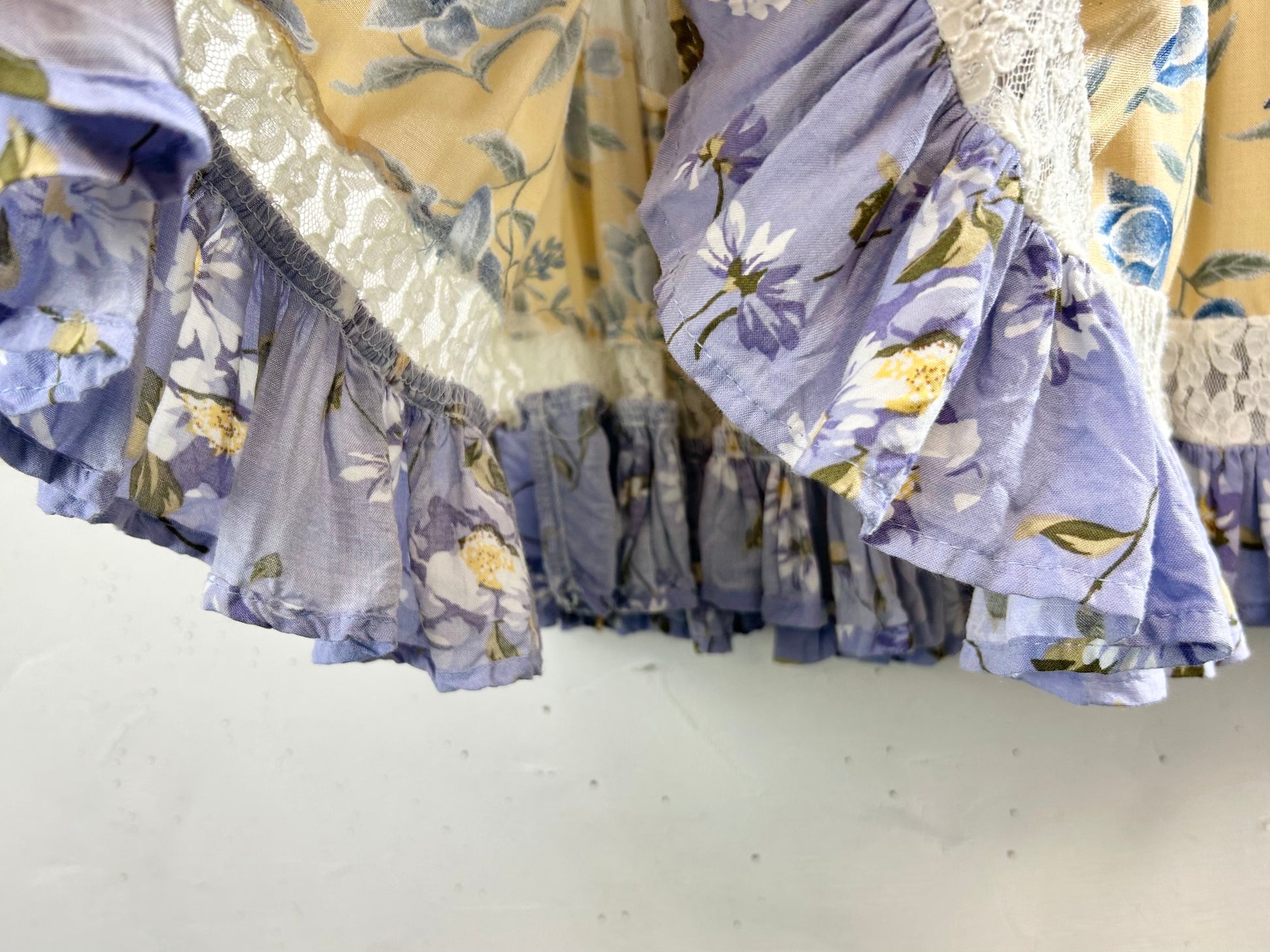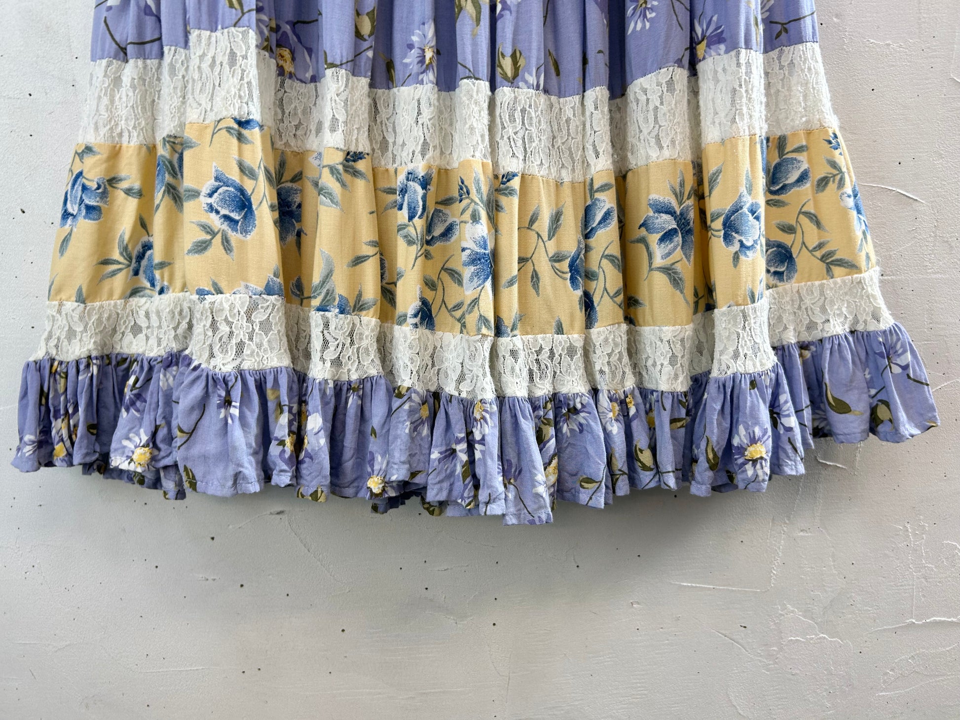 2種類のフラワーパターンとレース生地を組み合わせたティアードデザインが可愛いらしい一着。