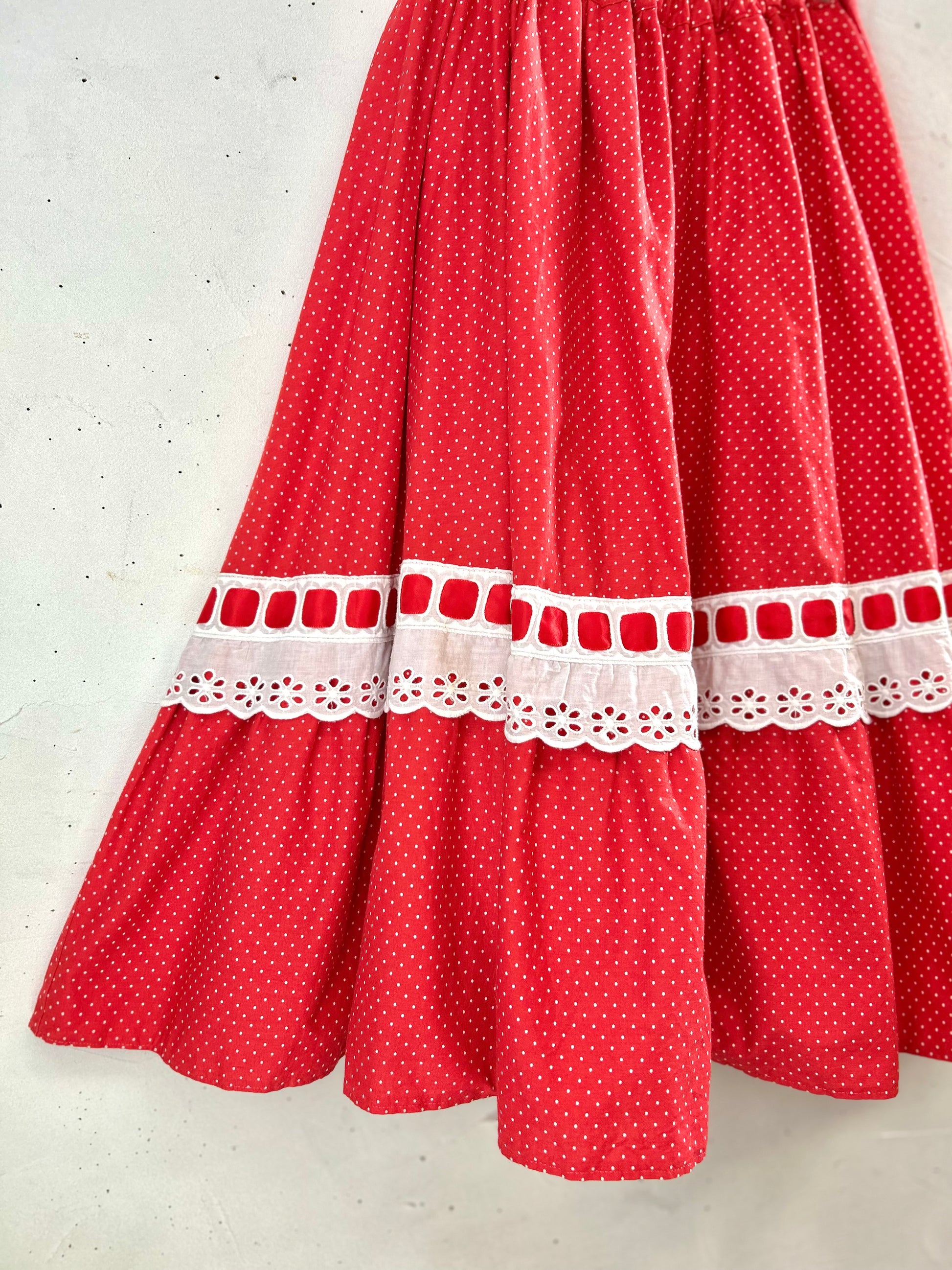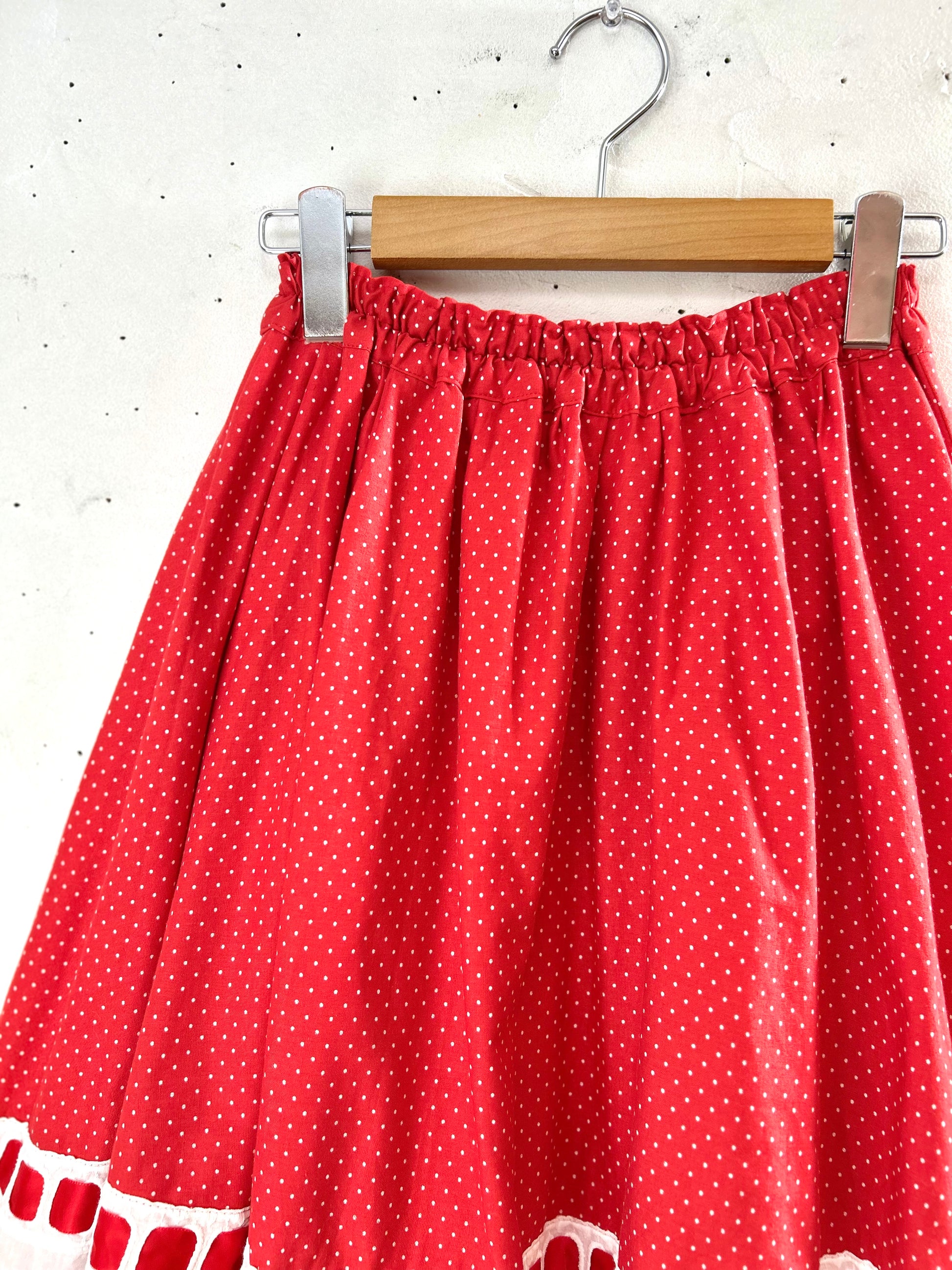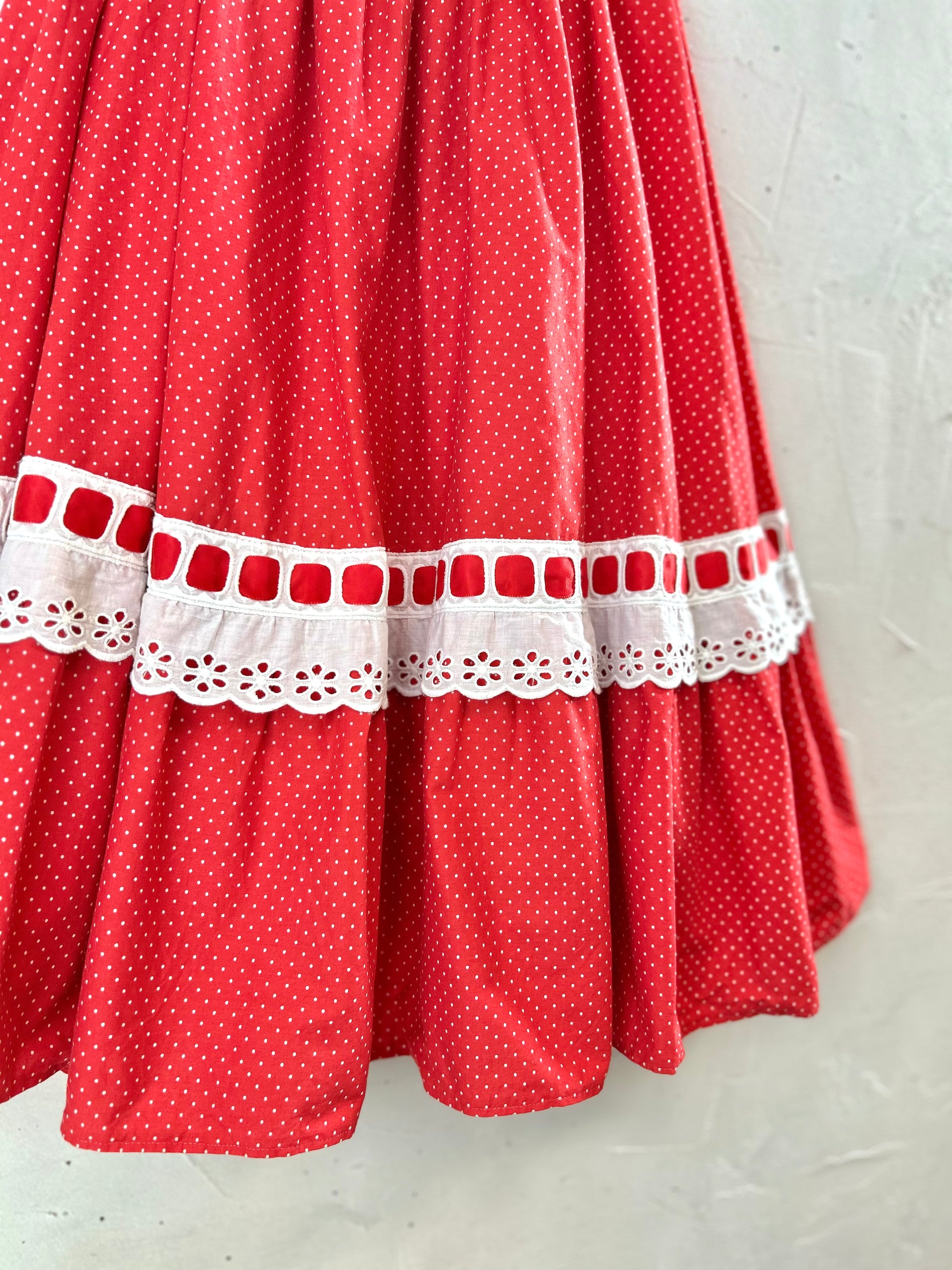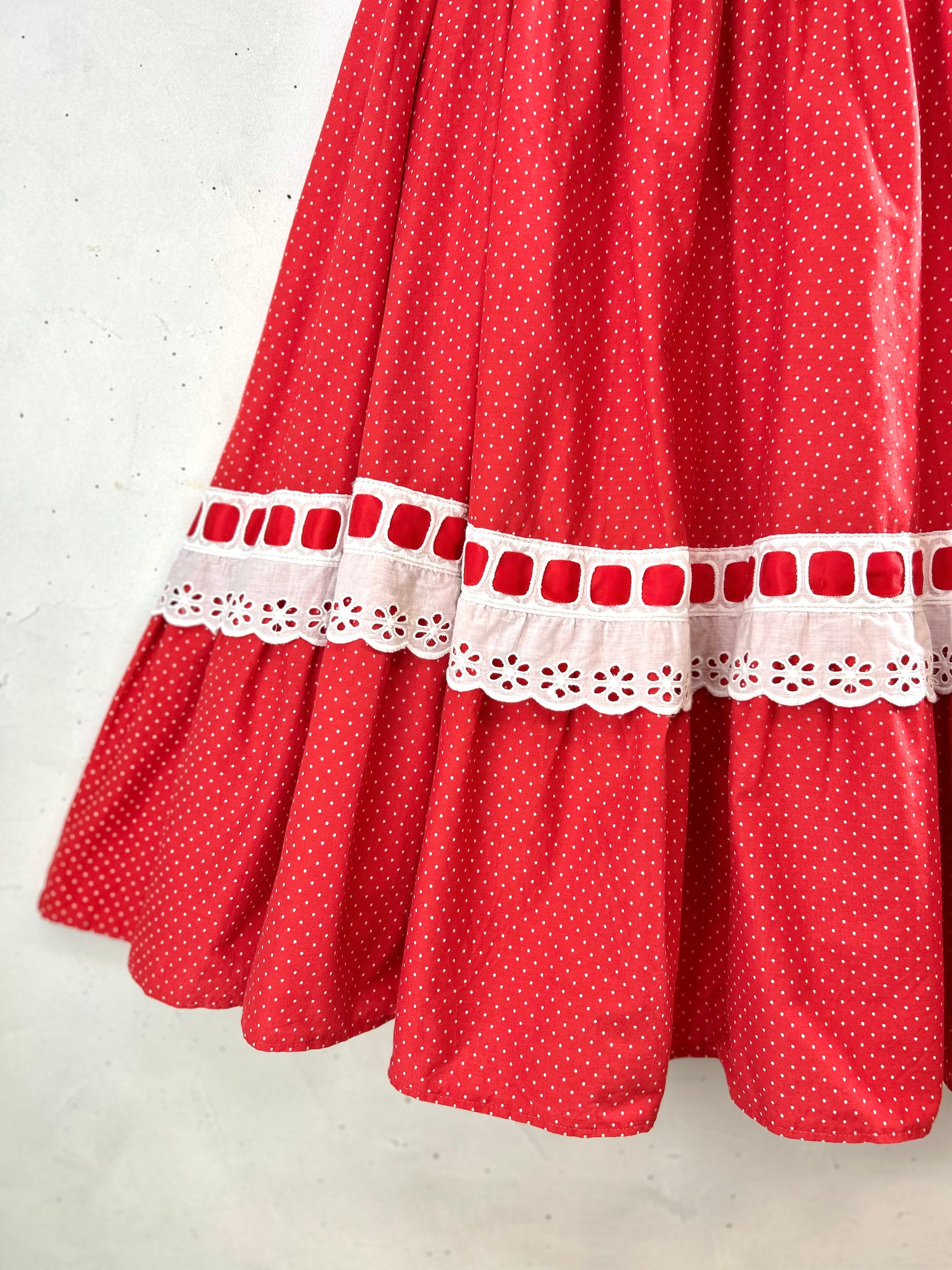 レッド&ホワイトのドット柄に、レッドリボンの通った大きなホワイトレースがとてもキュートで、ボリュームのあるシルエットも色々なアイテムに合わせやすく、ヴィンテージファッションコーデとしても人気の高いアイテムとなっております。