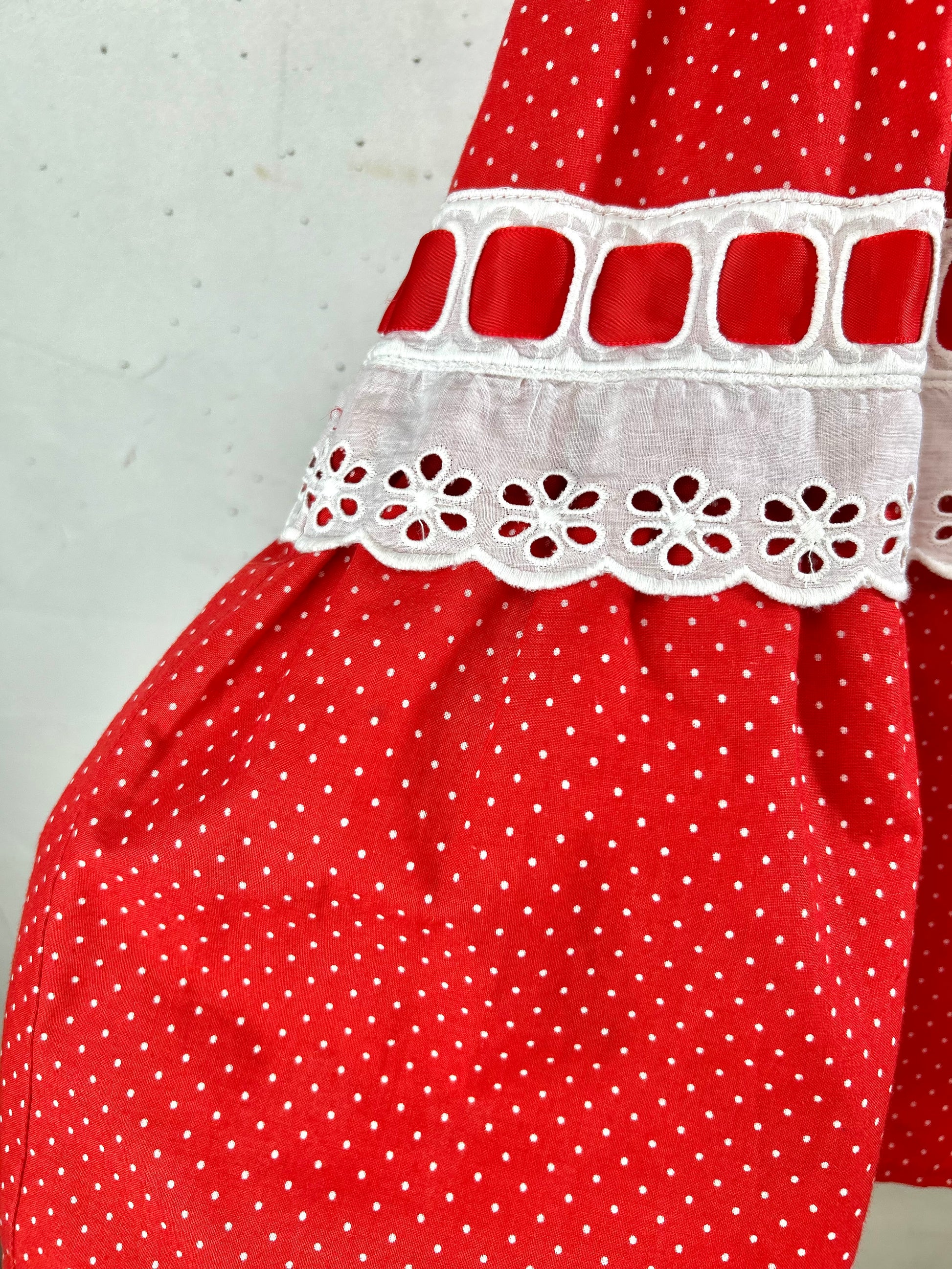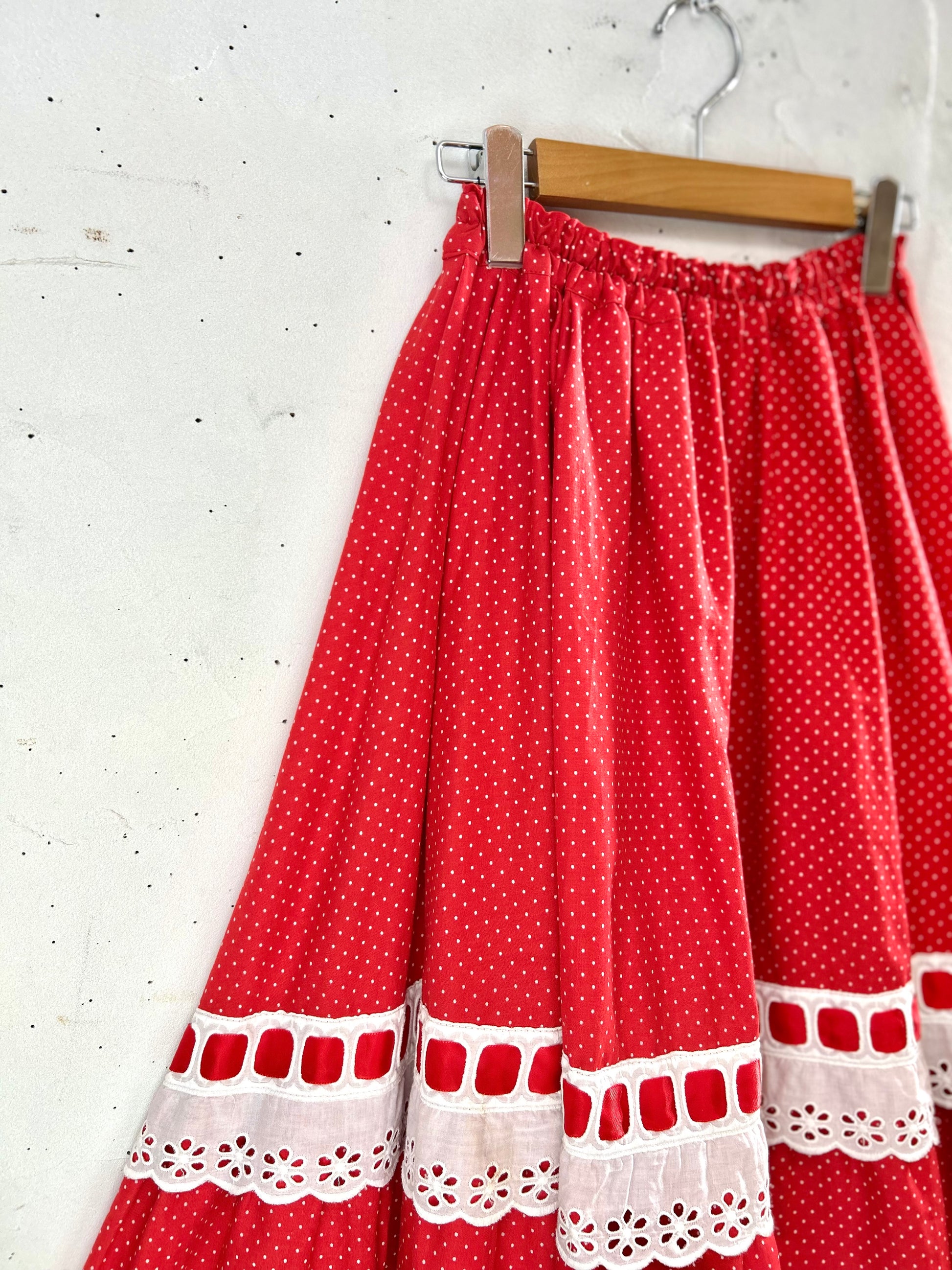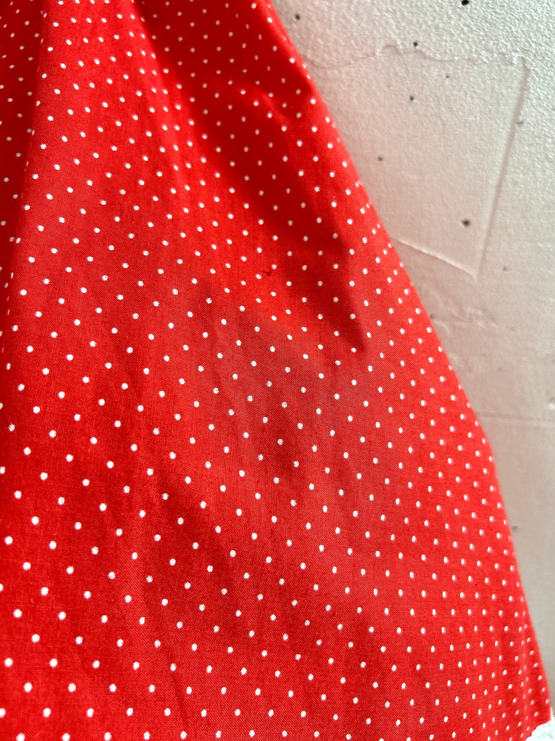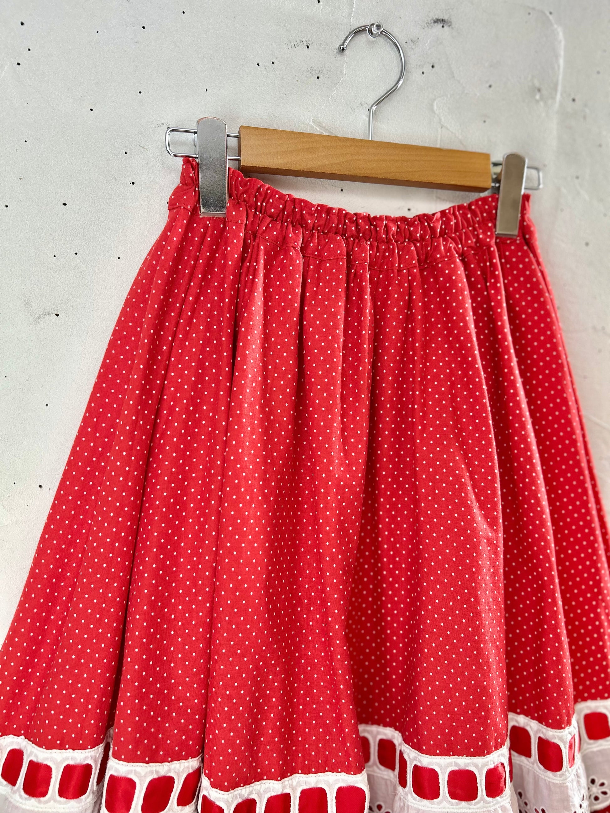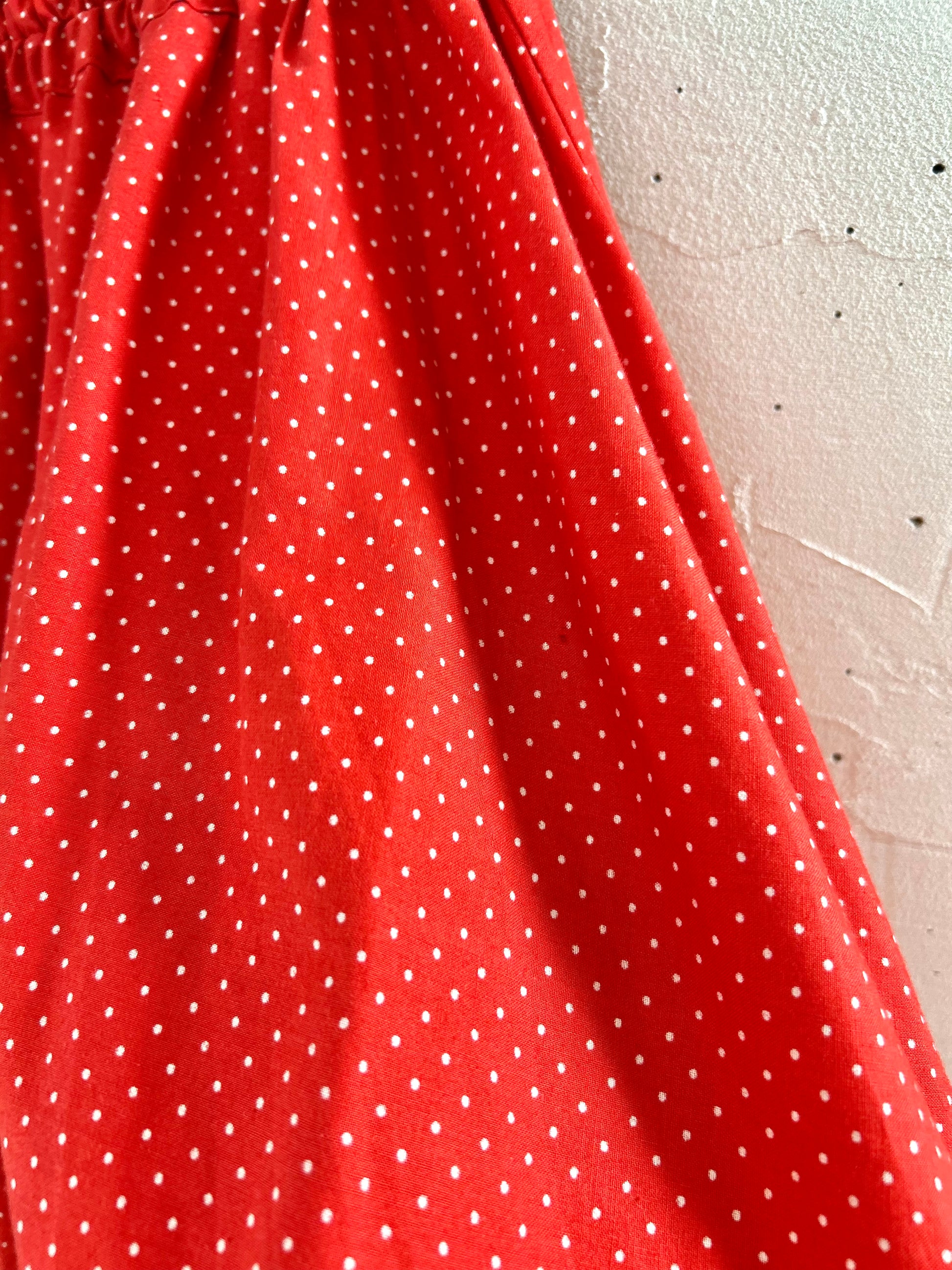 レッド&ホワイトのドット柄に、レッドリボンの通った大きなホワイトレースがとてもキュートで、ボリュームのあるシルエットも色々なアイテムに合わせやすく、ヴィンテージファッションコーデとしても人気の高いアイテムとなっております。