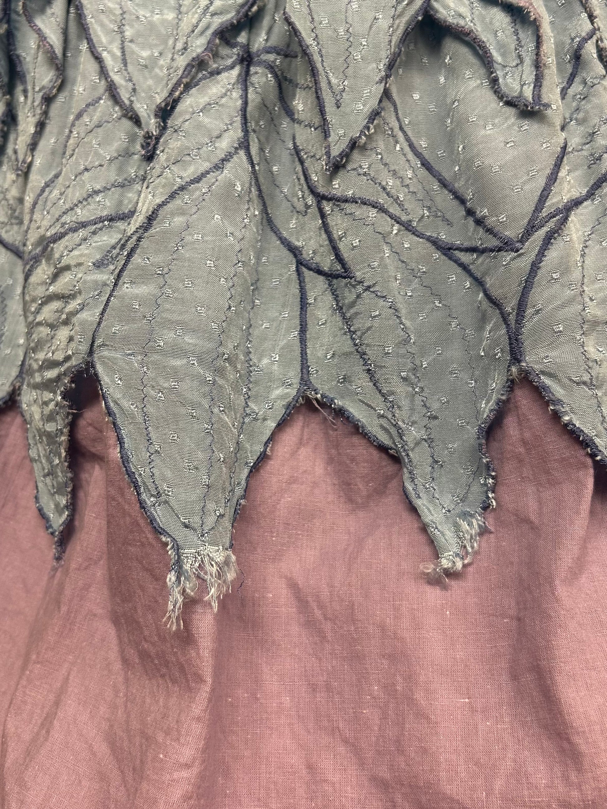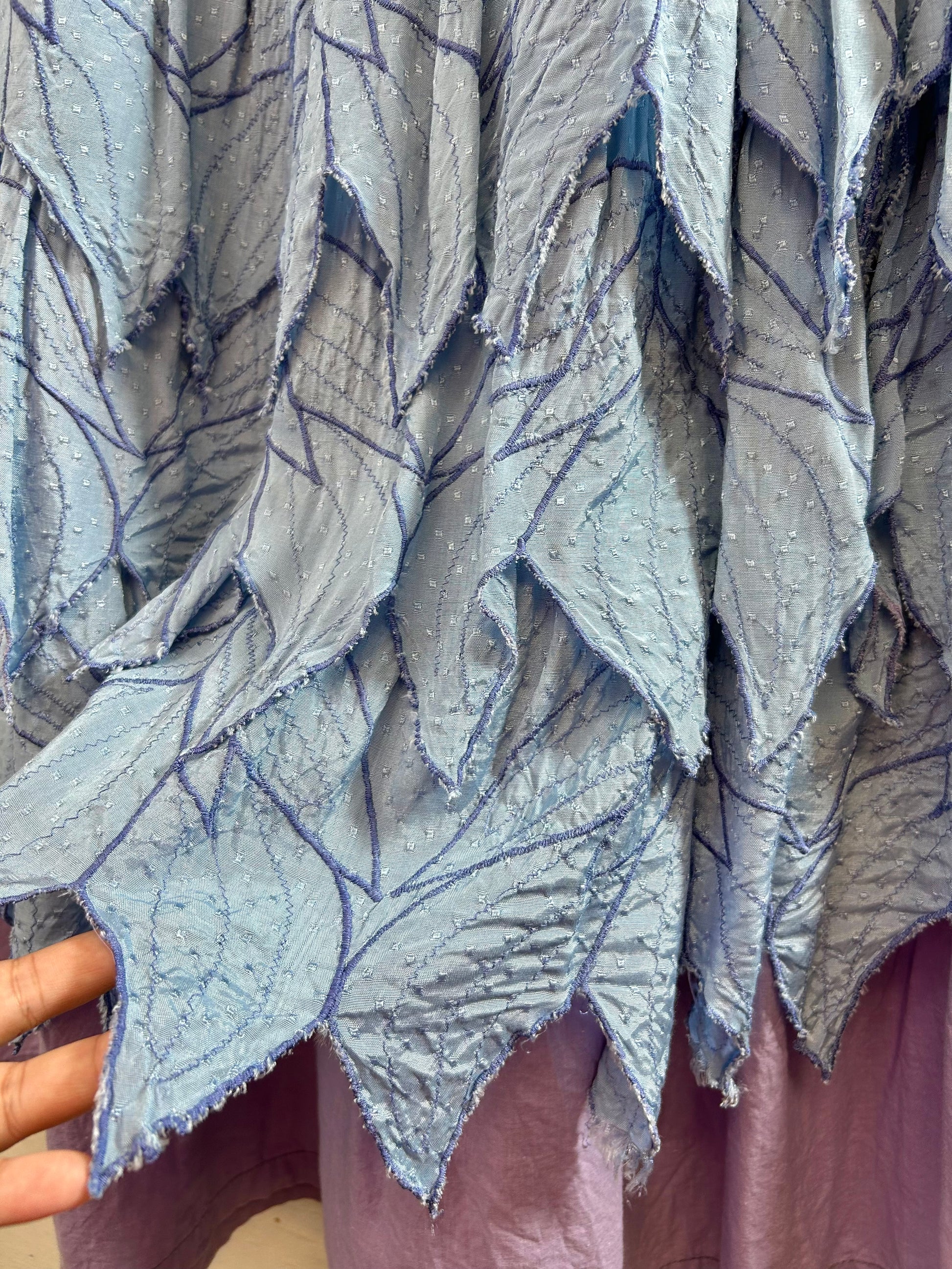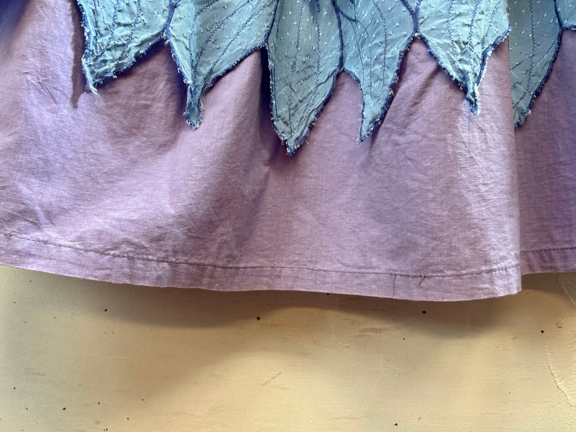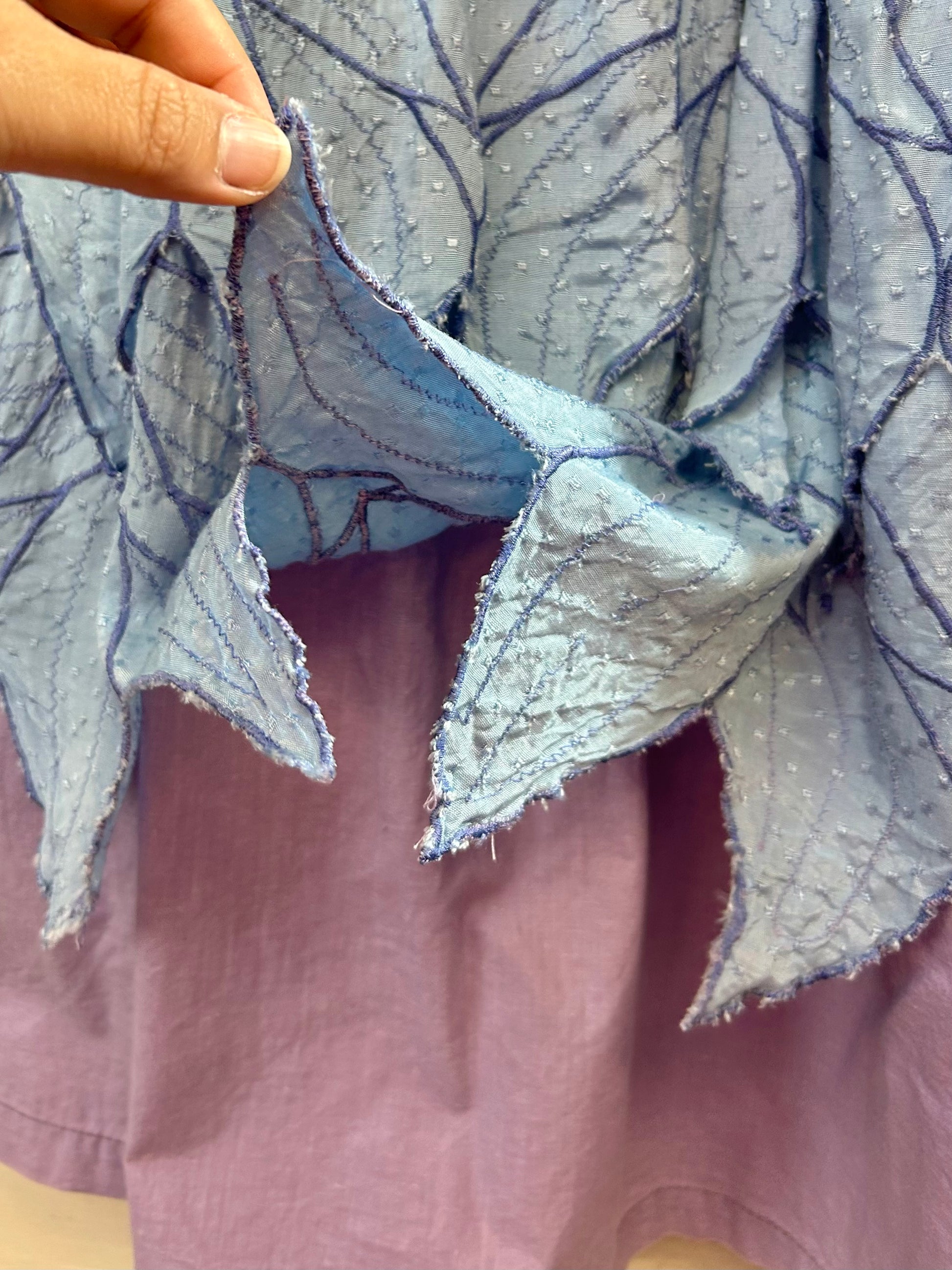くすみパープルのボディに、光沢感のあるリーフ刺繍の生地が重ねられた美しい1着。