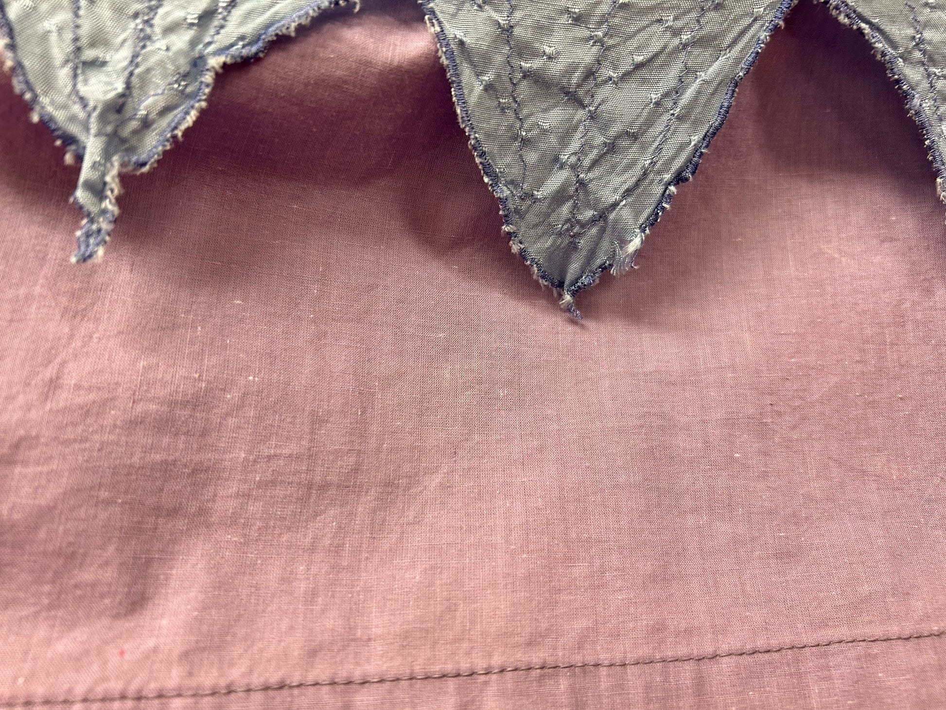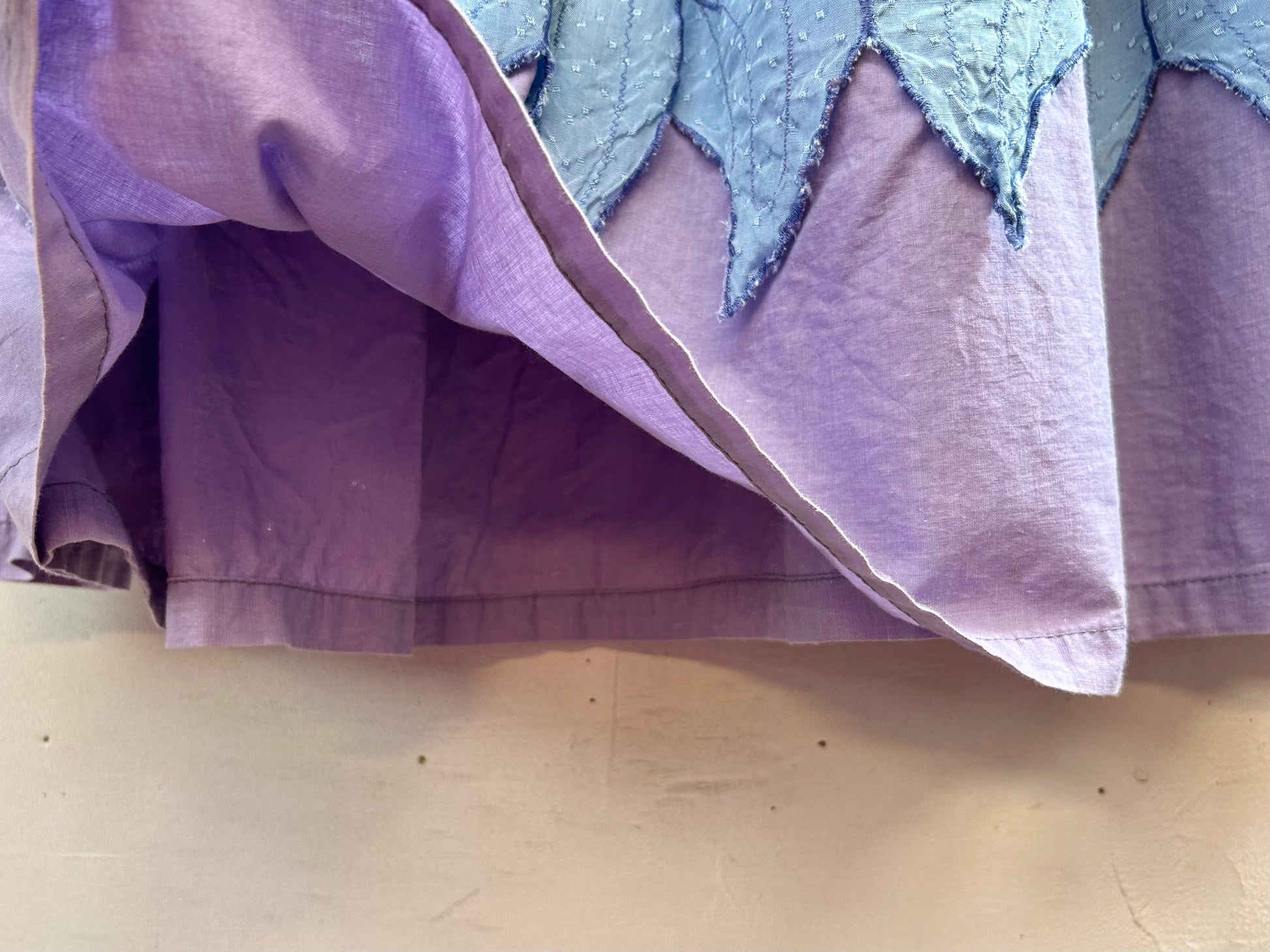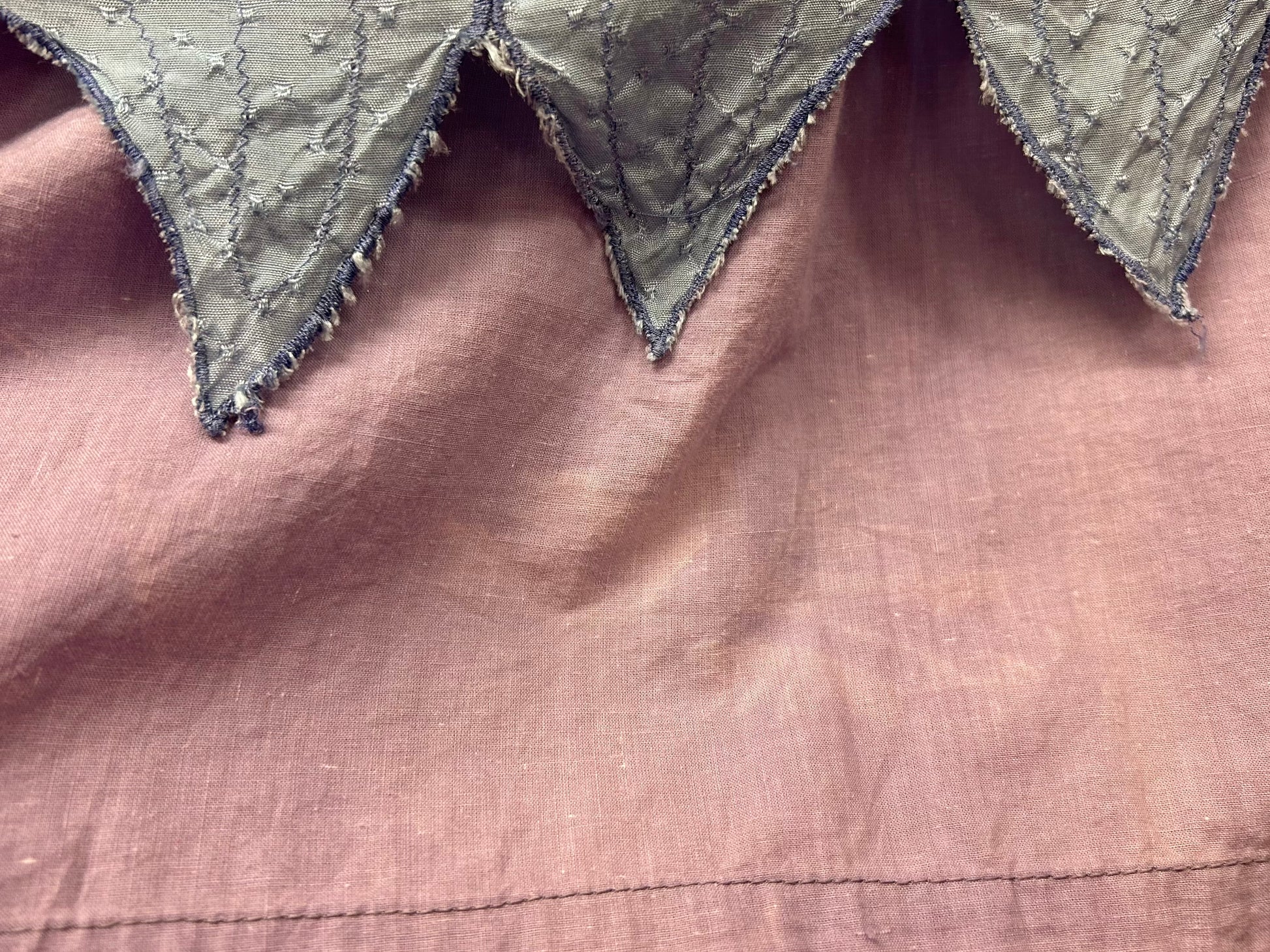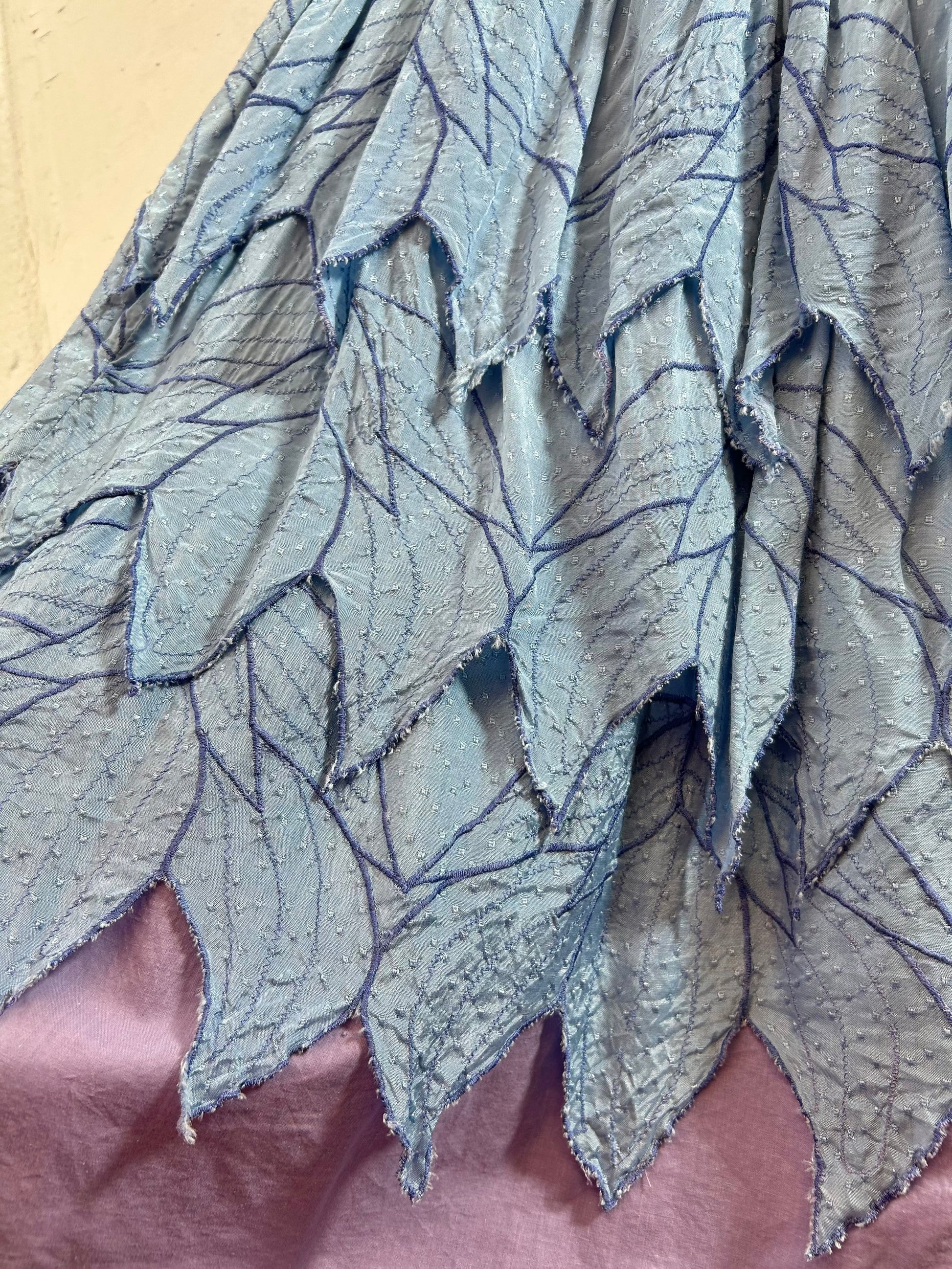 くすみパープルのボディに、光沢感のあるリーフ刺繍の生地が重ねられた美しい1着。