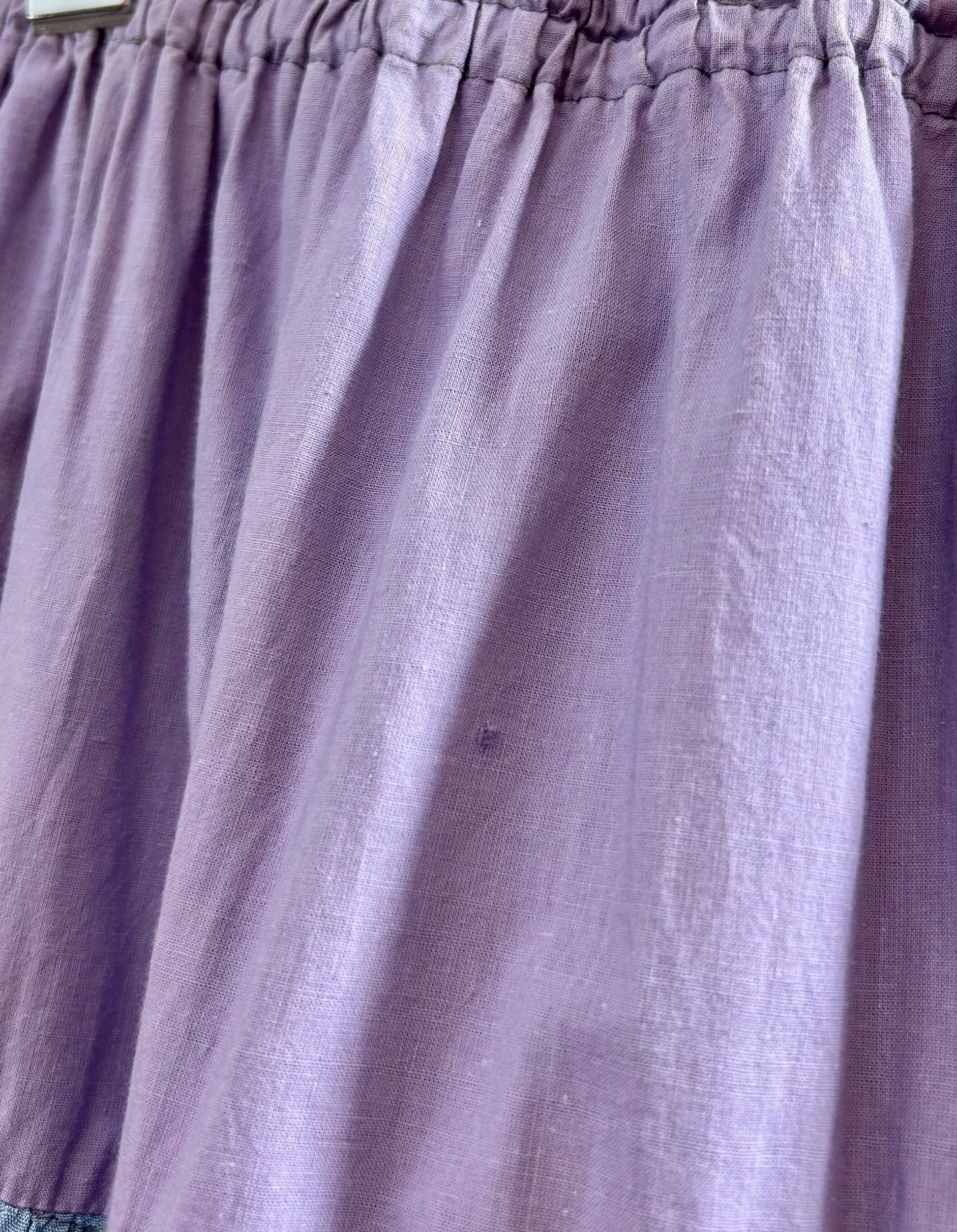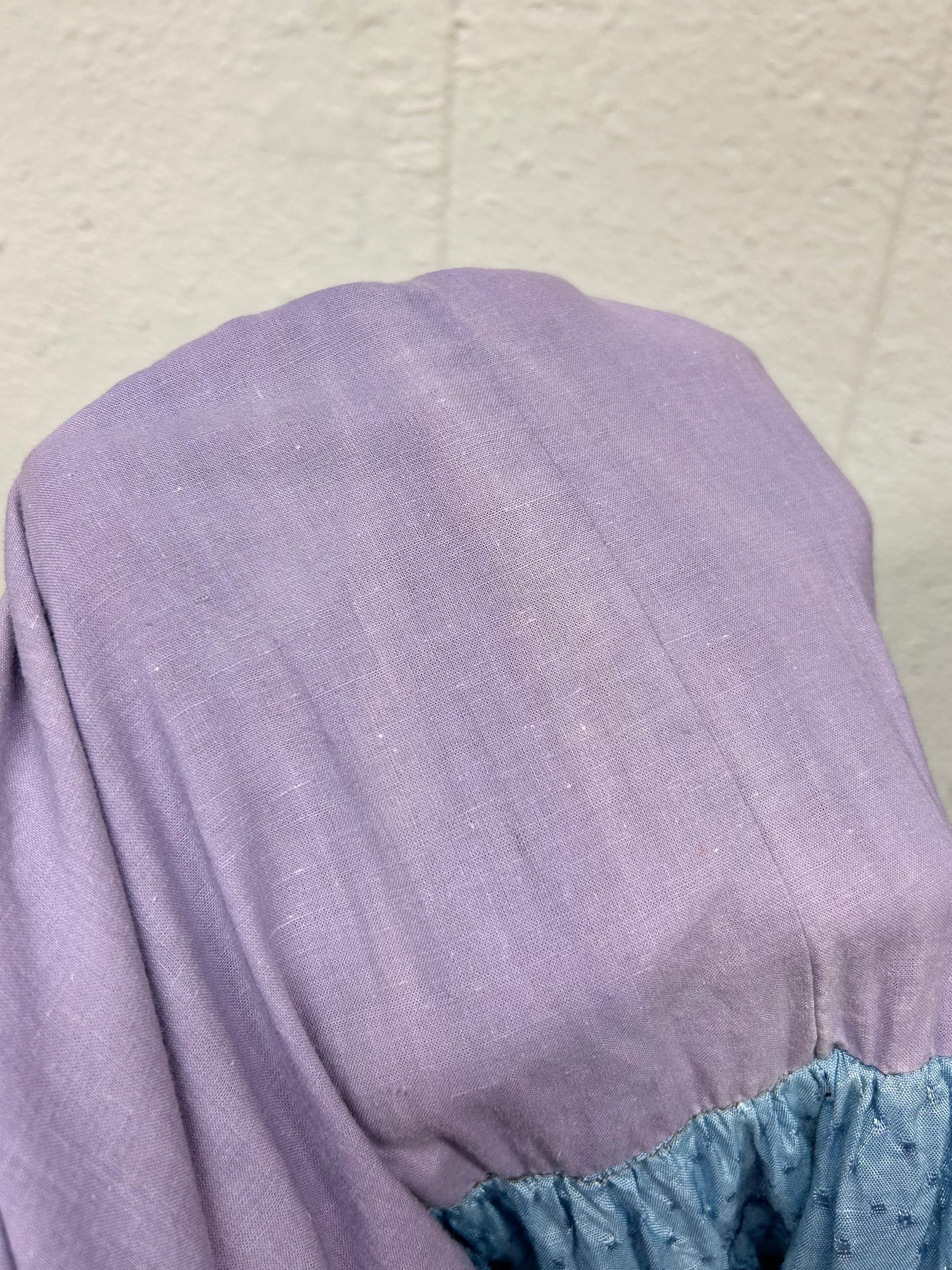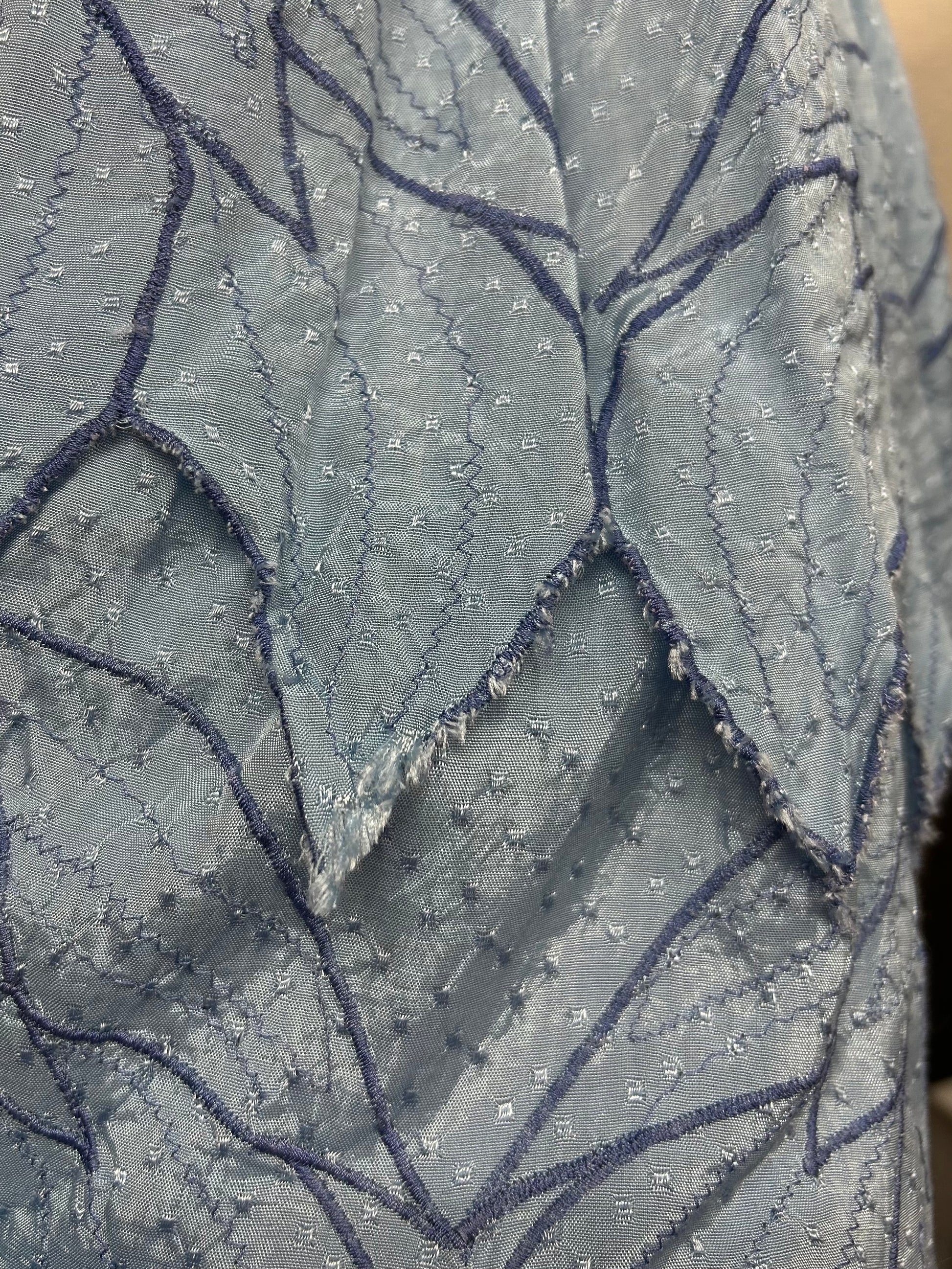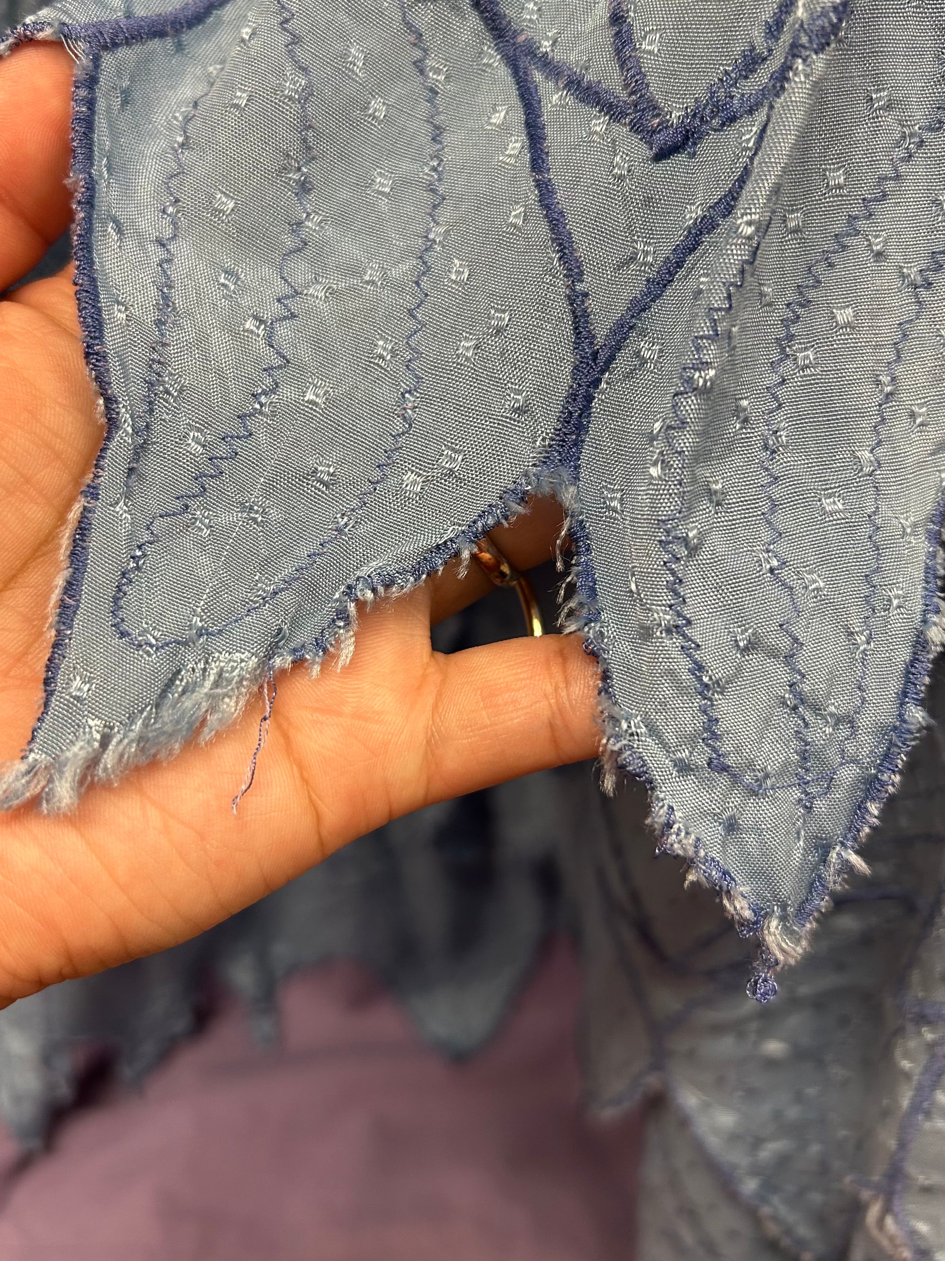 くすみパープルのボディに、光沢感のあるリーフ刺繍の生地が重ねられた美しい1着。