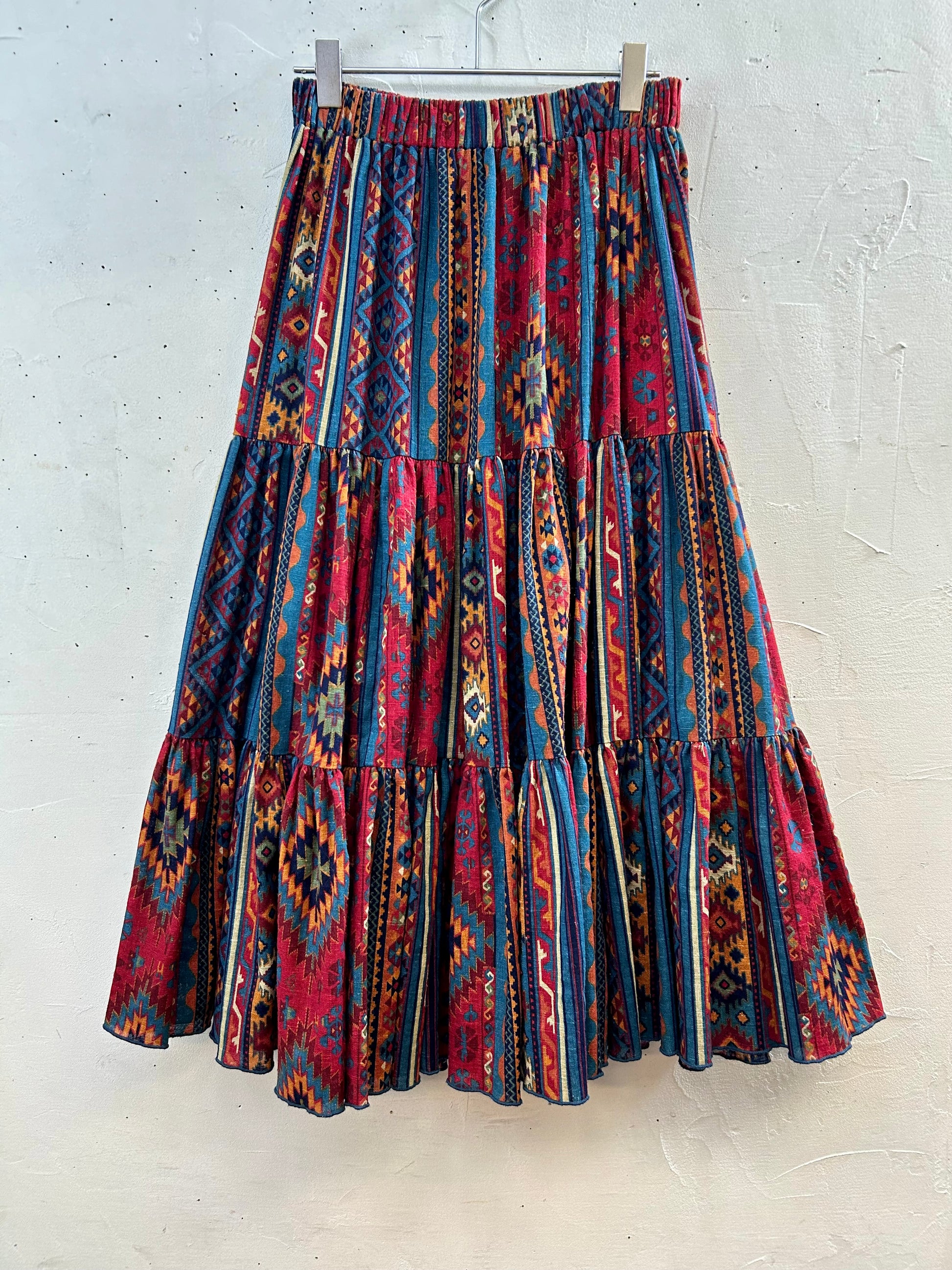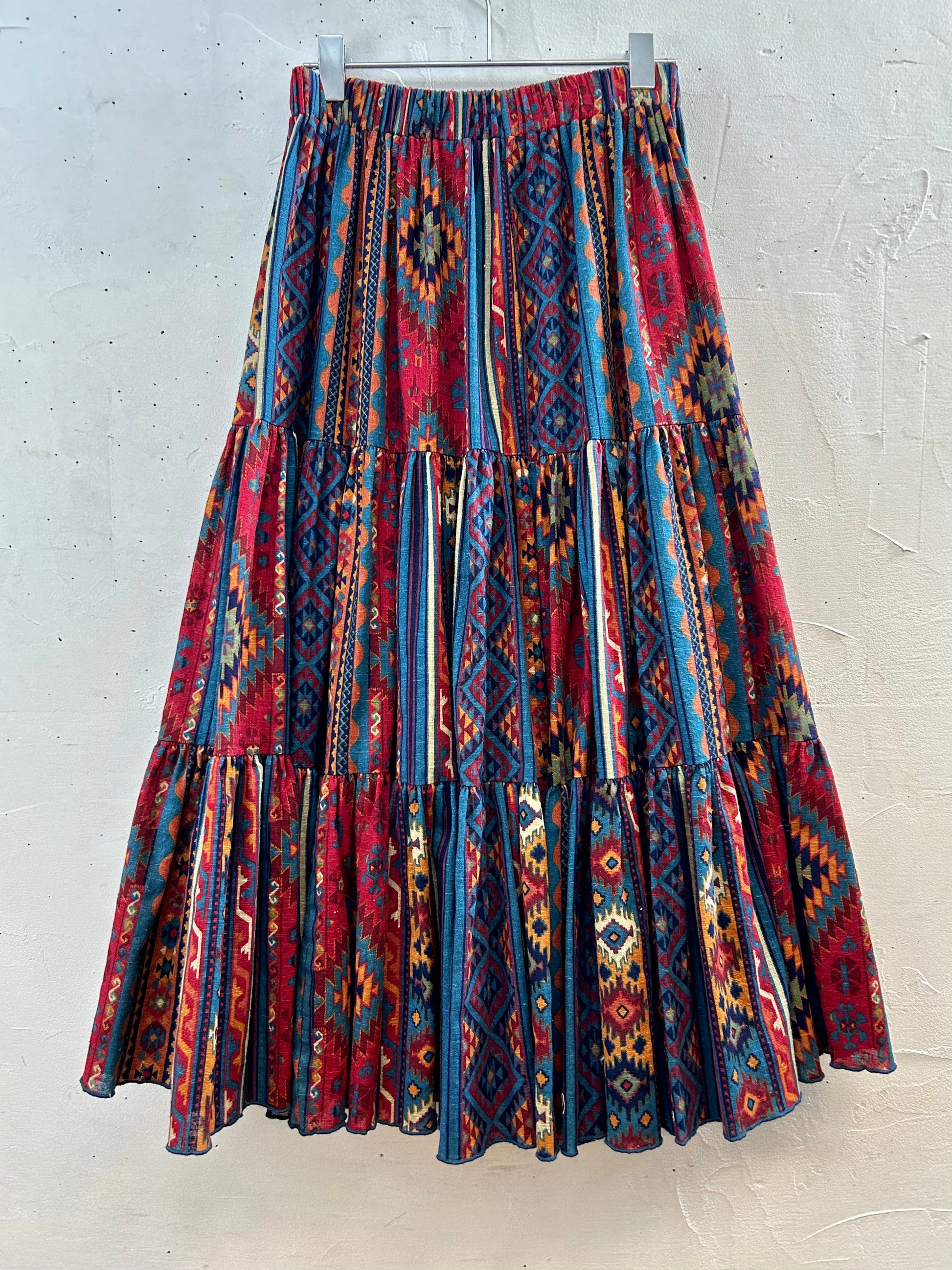 ビンテージティアードスカート。テクニカルなネイティブパターンが圧巻で、生地をたっぷりと使用した3段ティアードデザインが存在感抜群です。