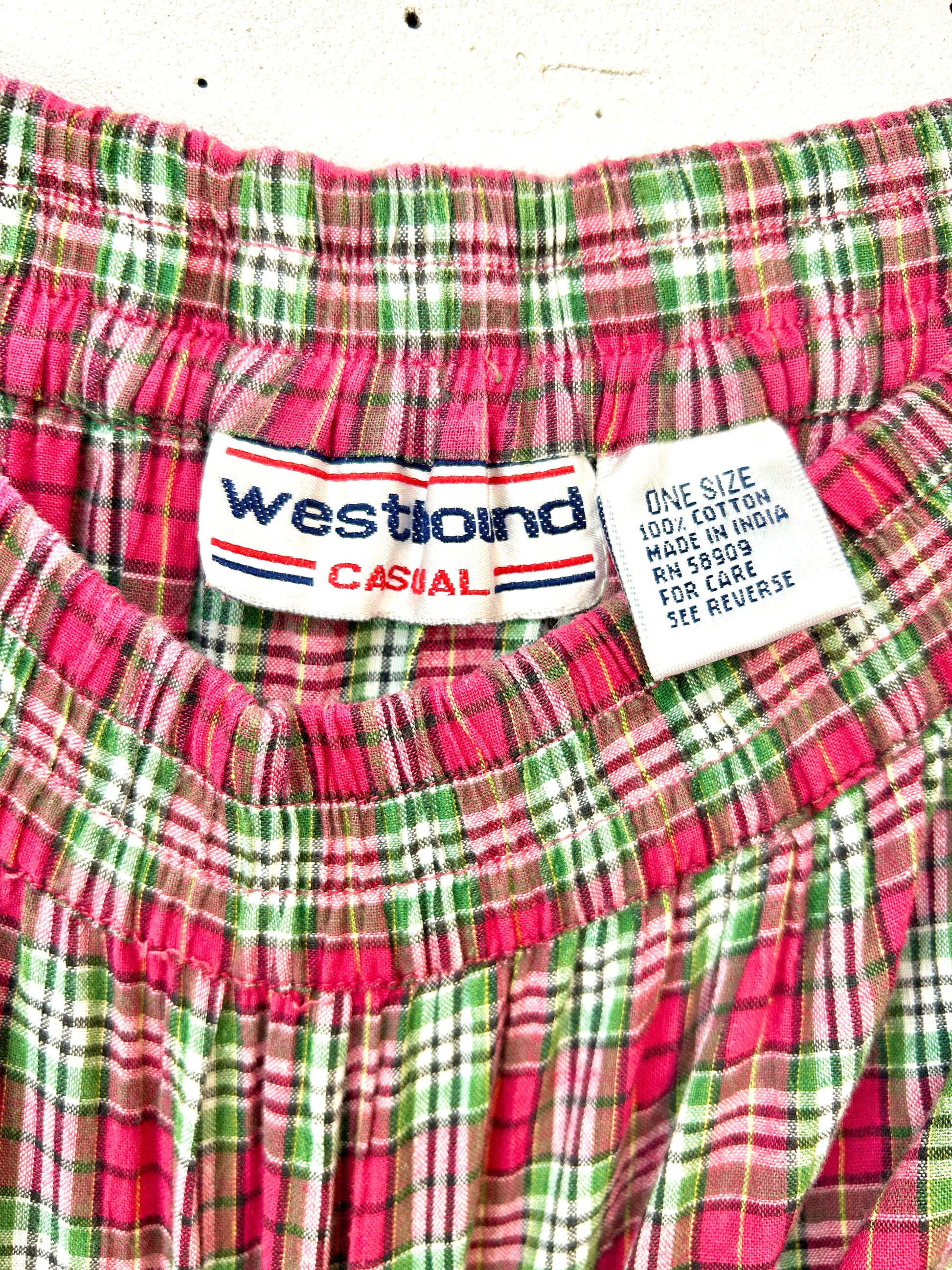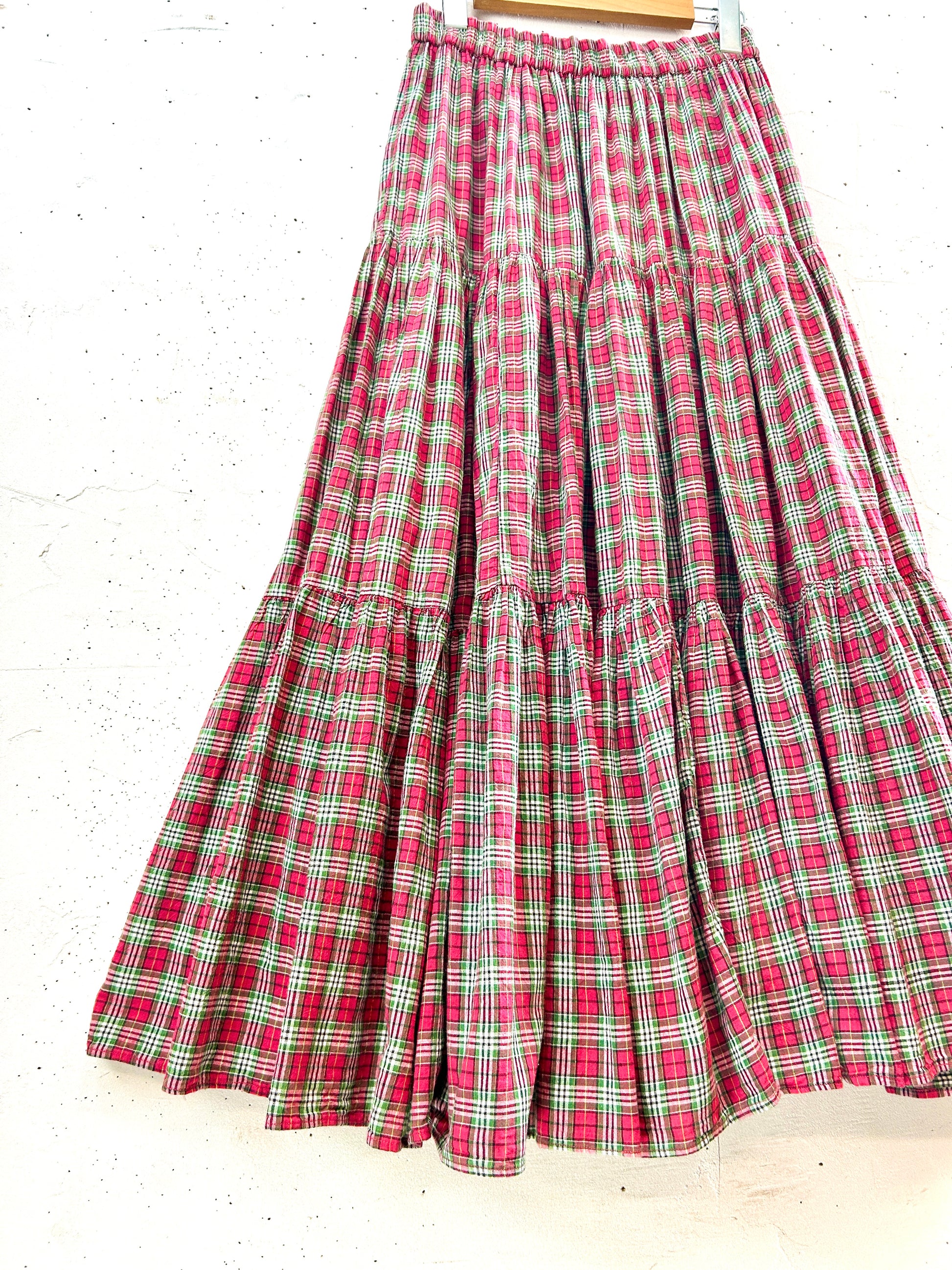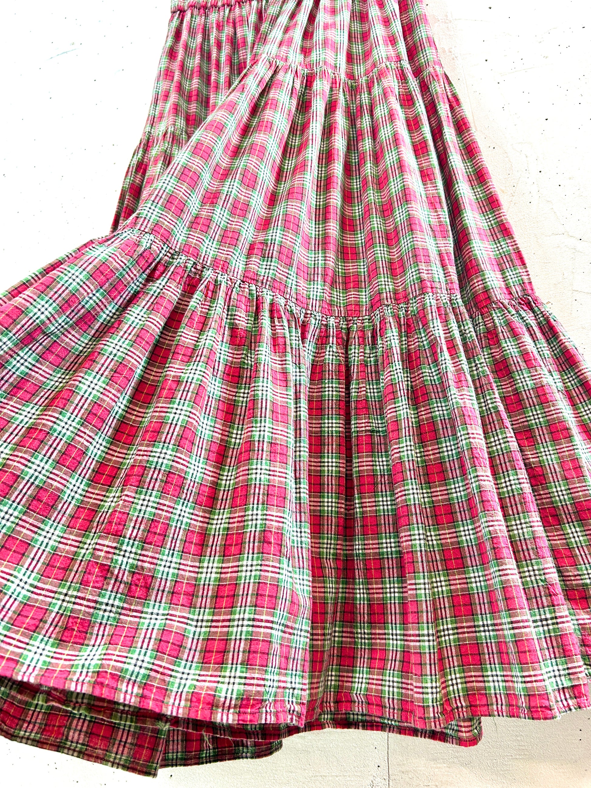 レッド&グリーンのカラーリングが個性的で可愛いチェック生地をたっぷりと使用したティアードデザインが素敵な1着です。