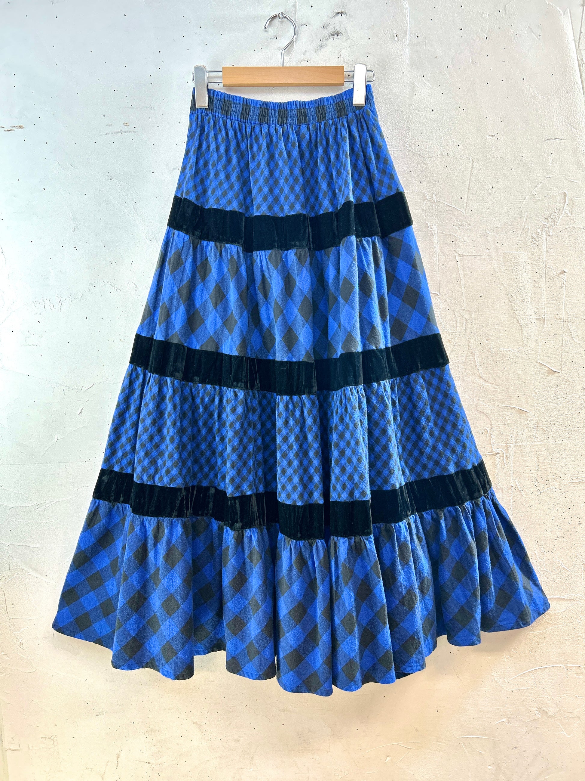 ブルーベースのチェック生地が組み合わされたティアードスカート。