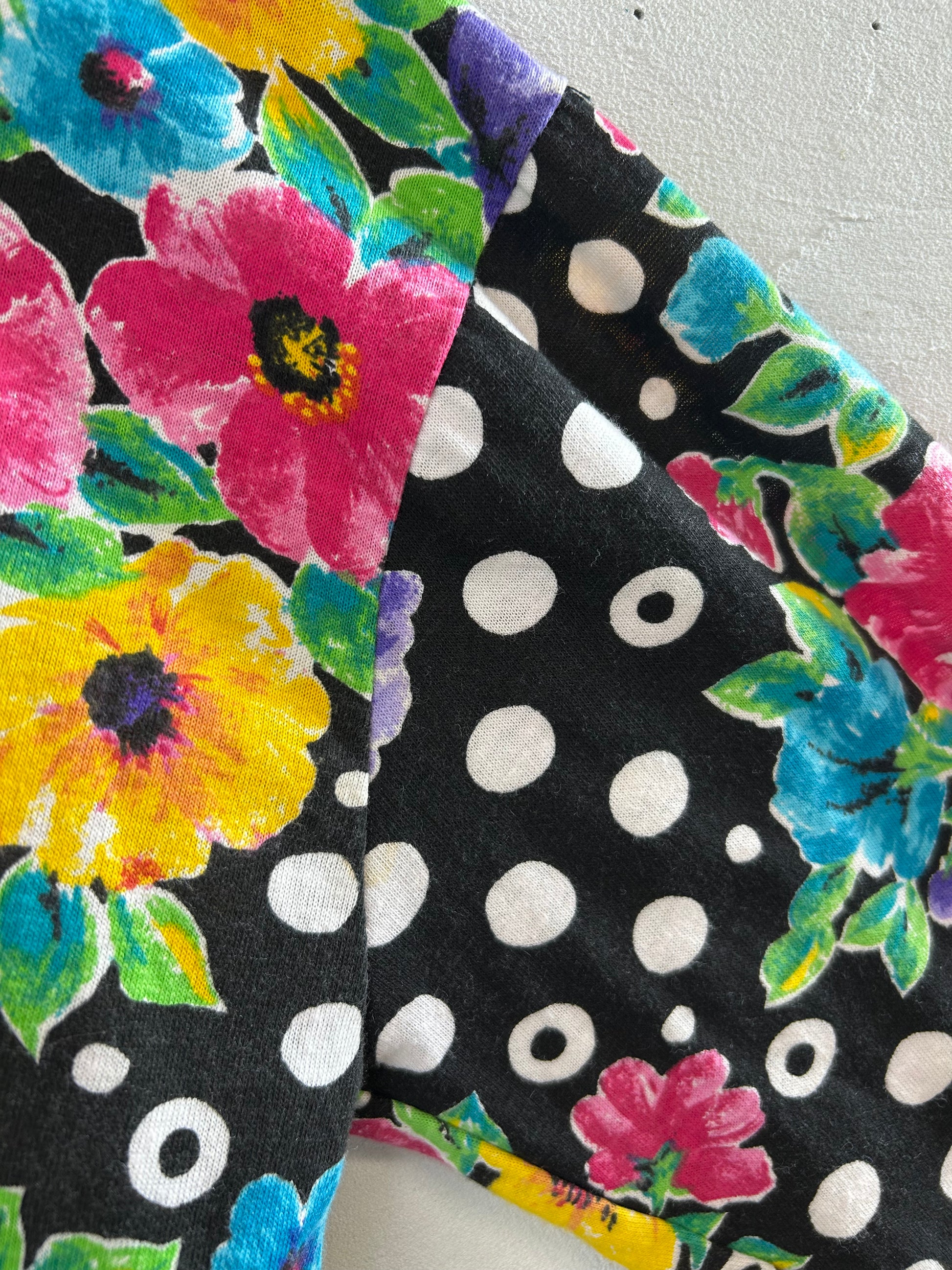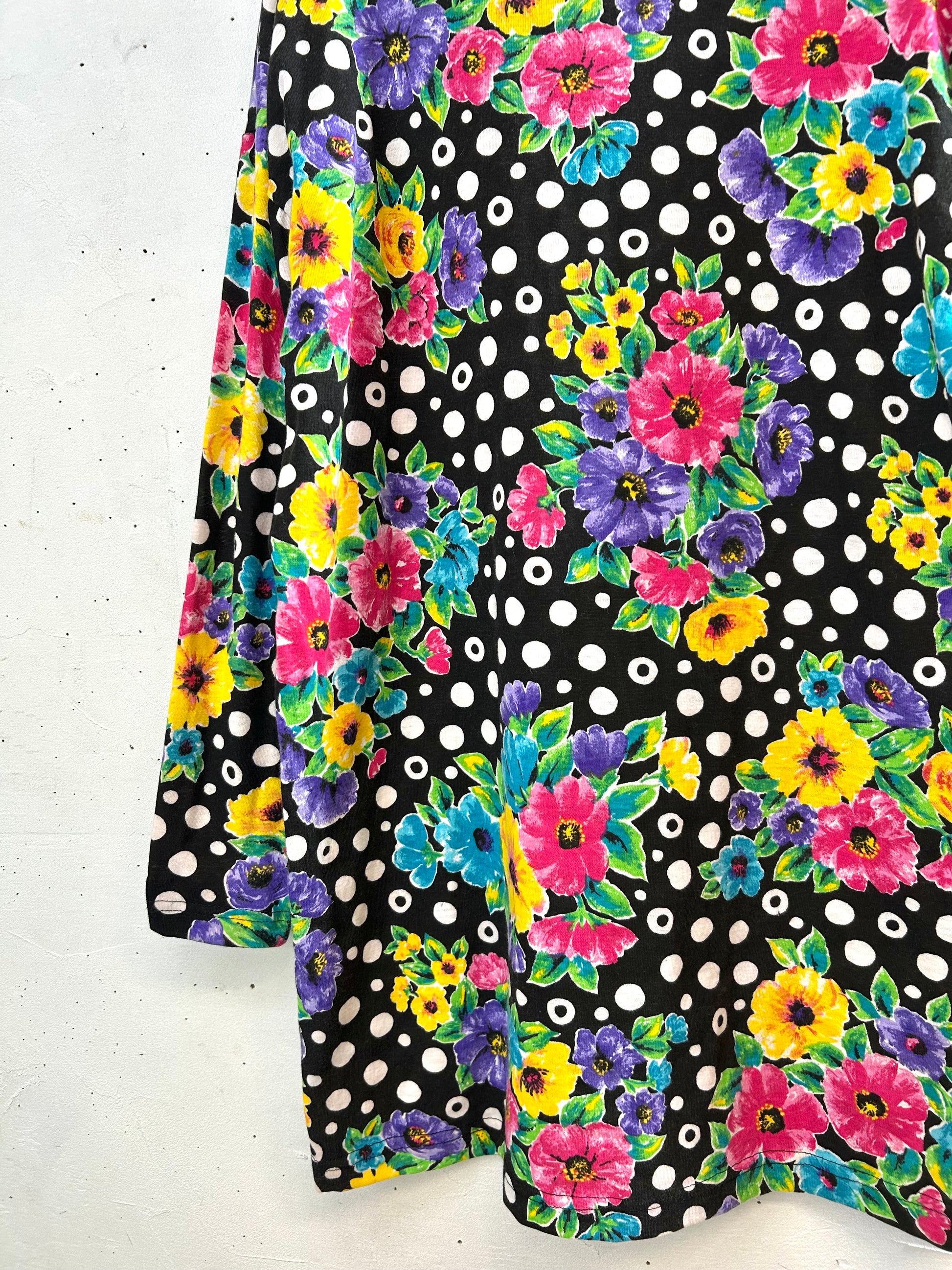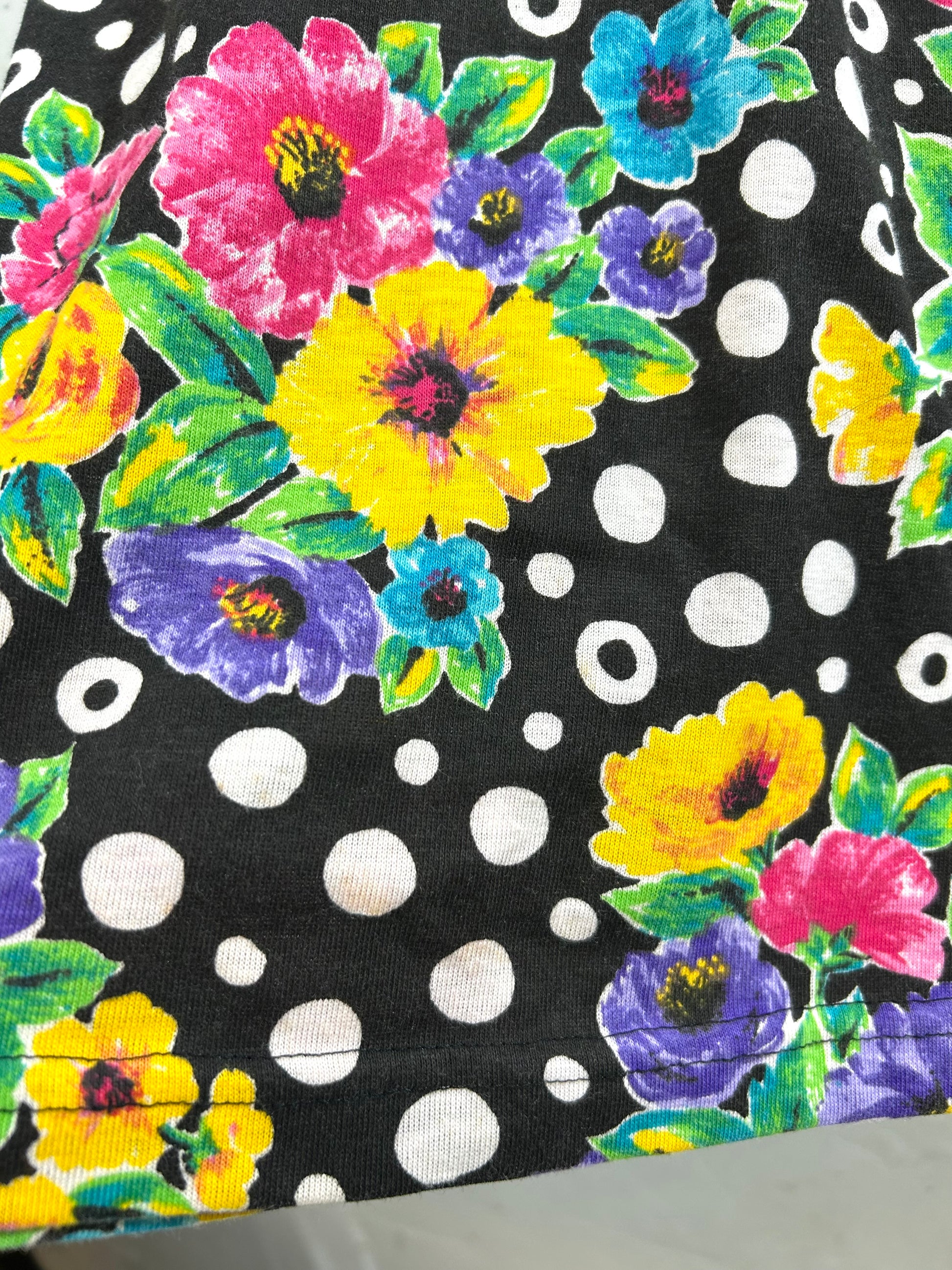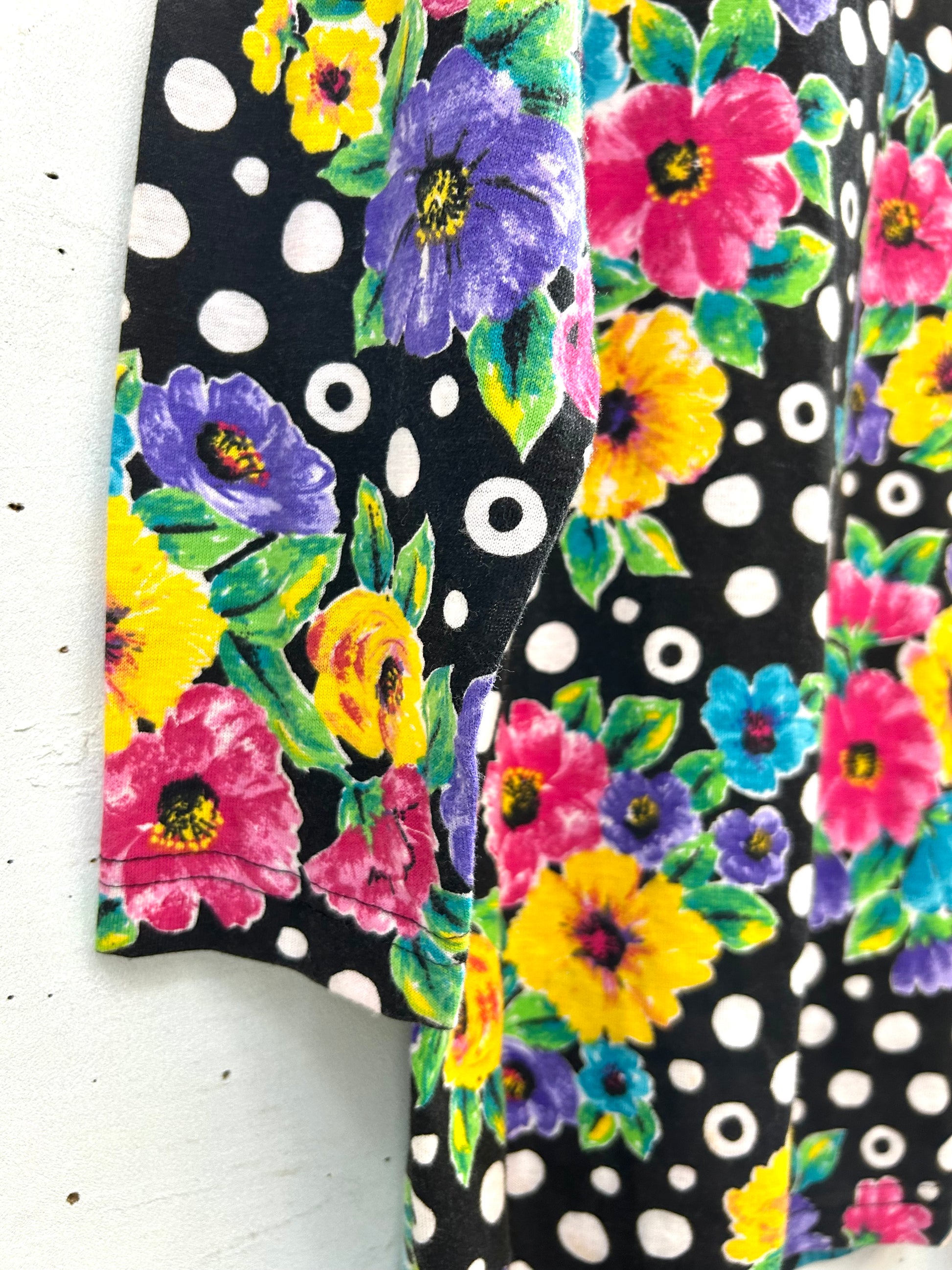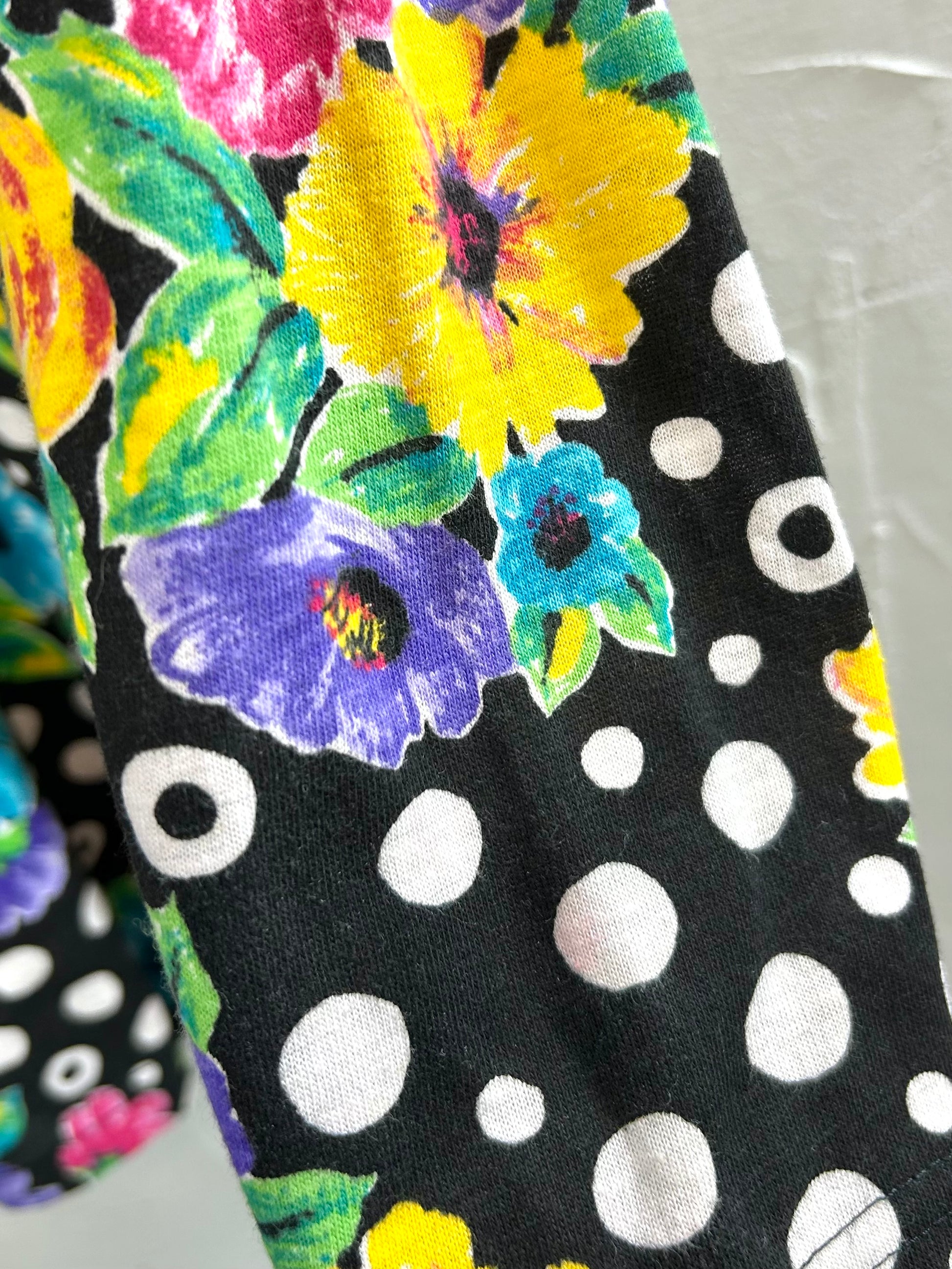 ブラックドットボディーにビビットカラーのフラワーパターンがこれからの季節にぴったりの一着。