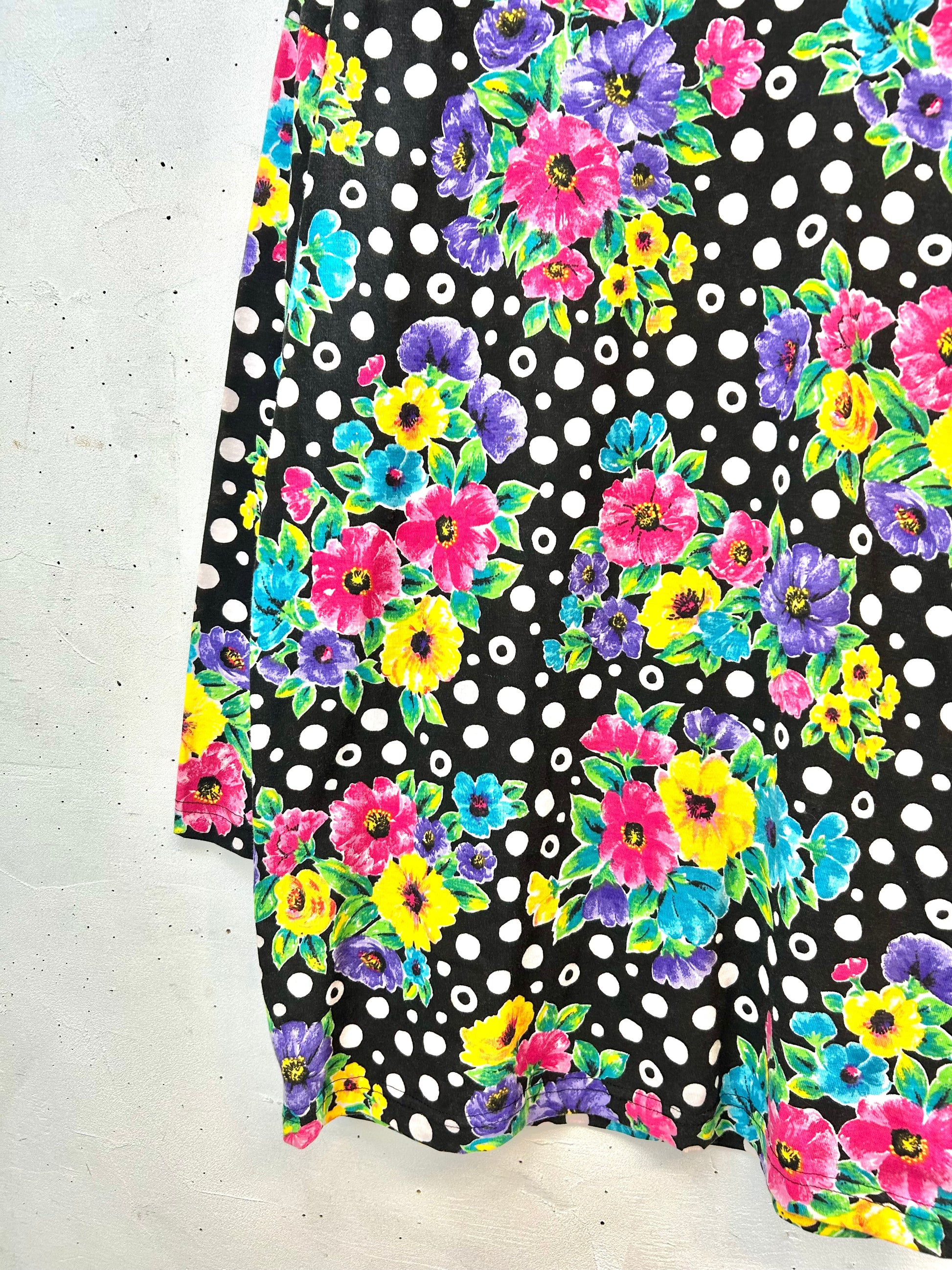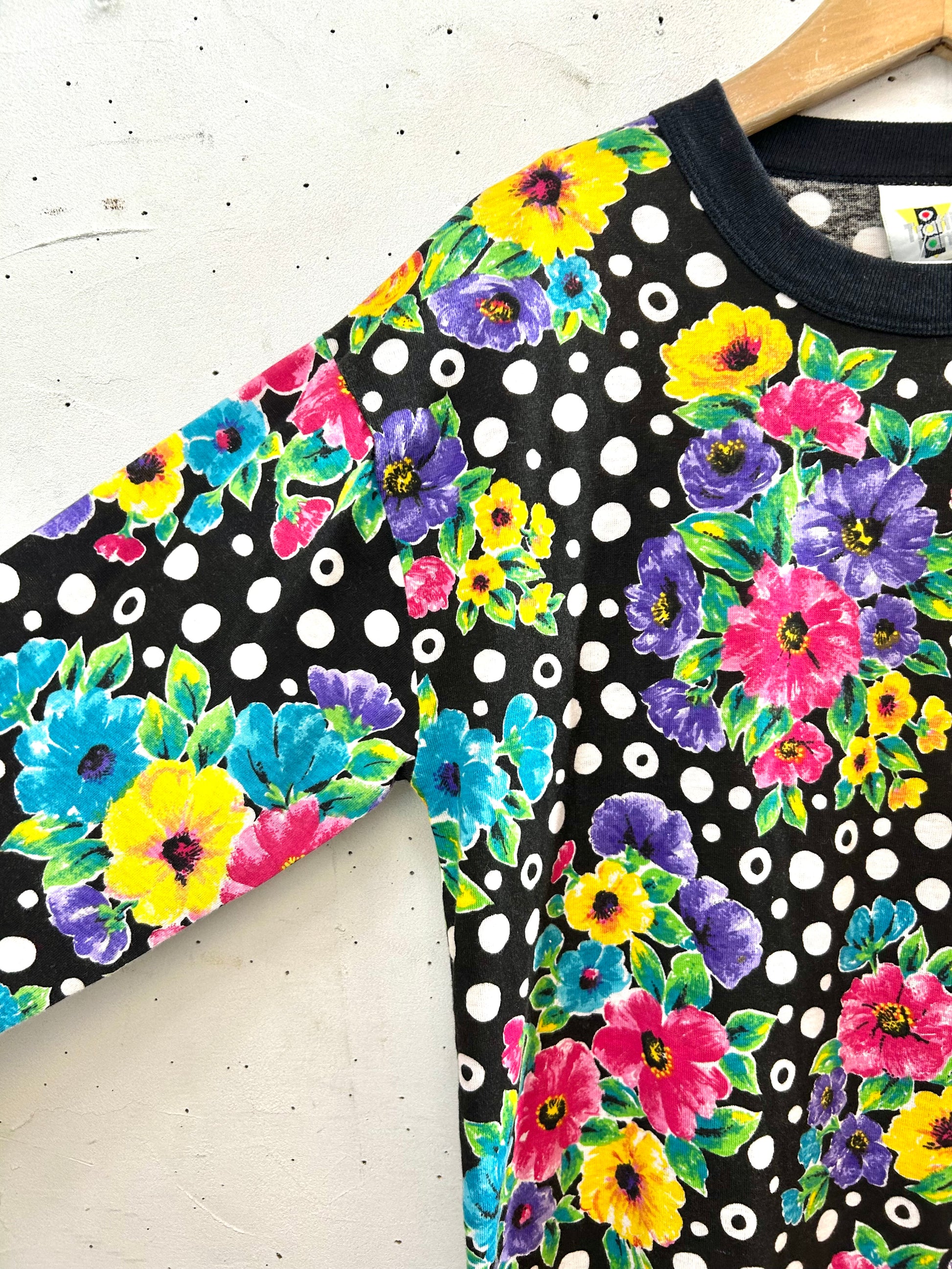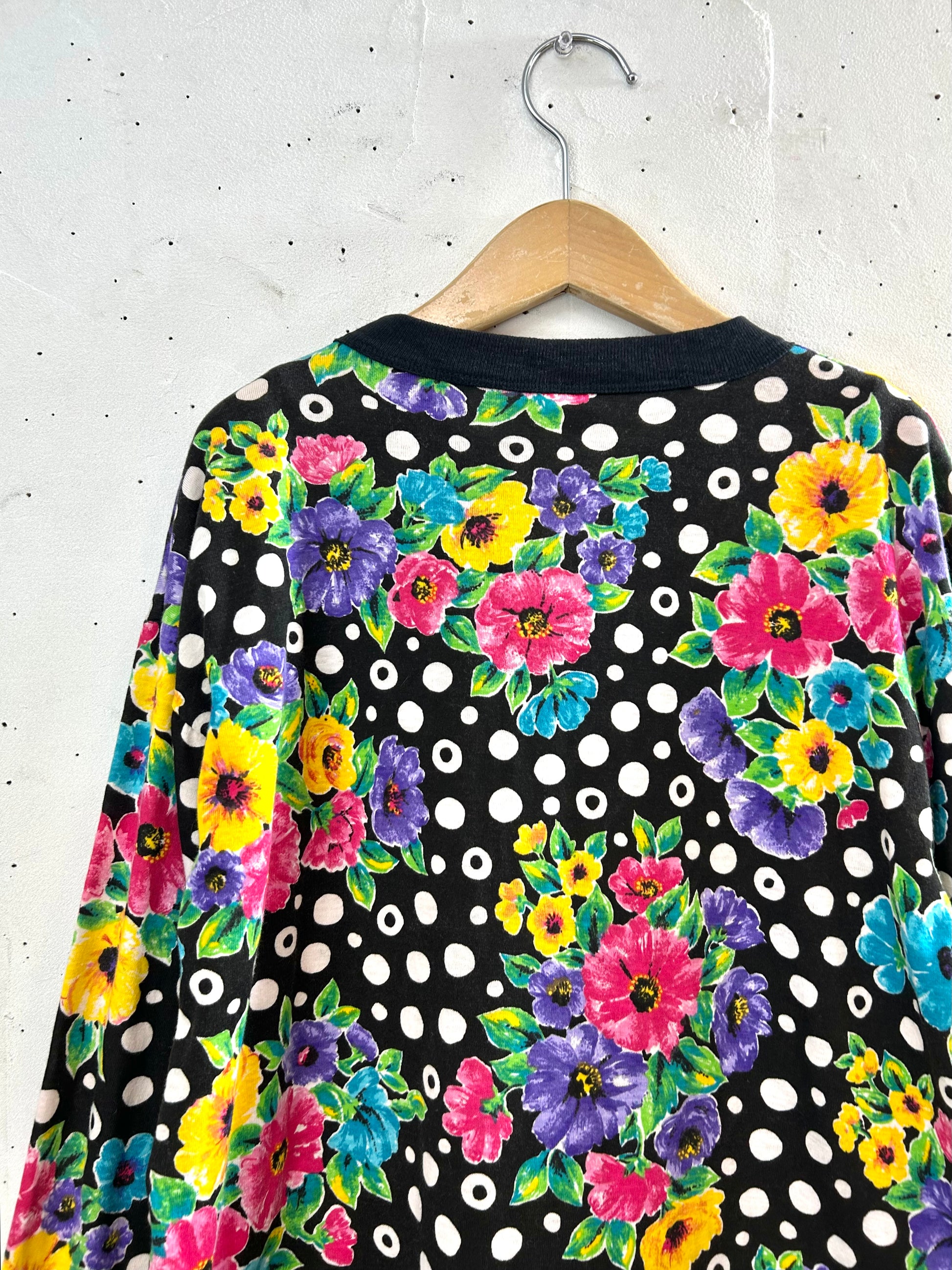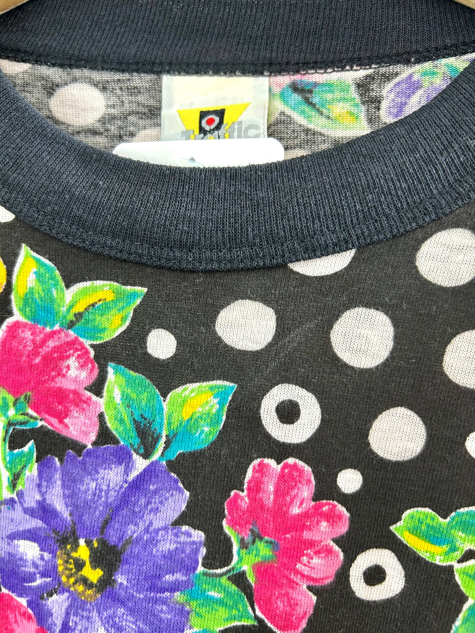 ブラックドットボディーにビビットカラーのフラワーパターンがこれからの季節にぴったりの一着。