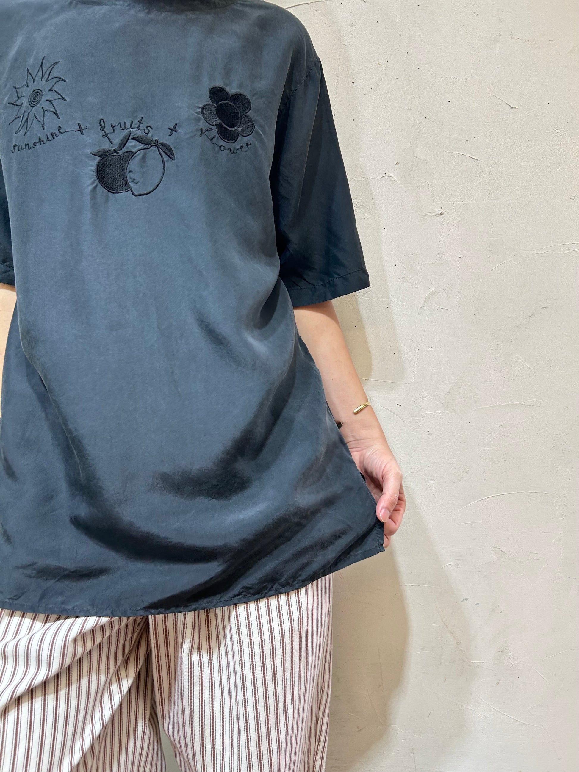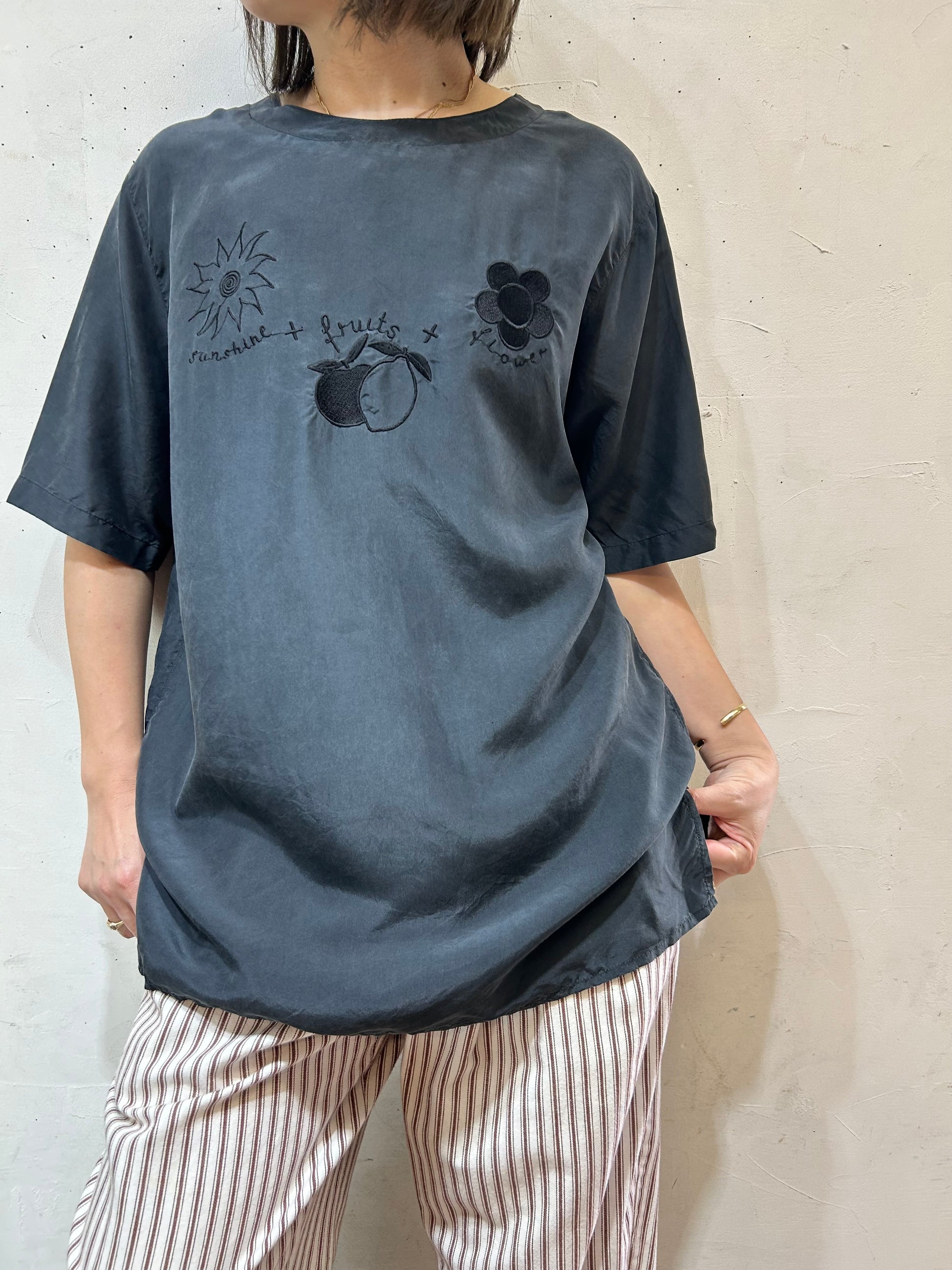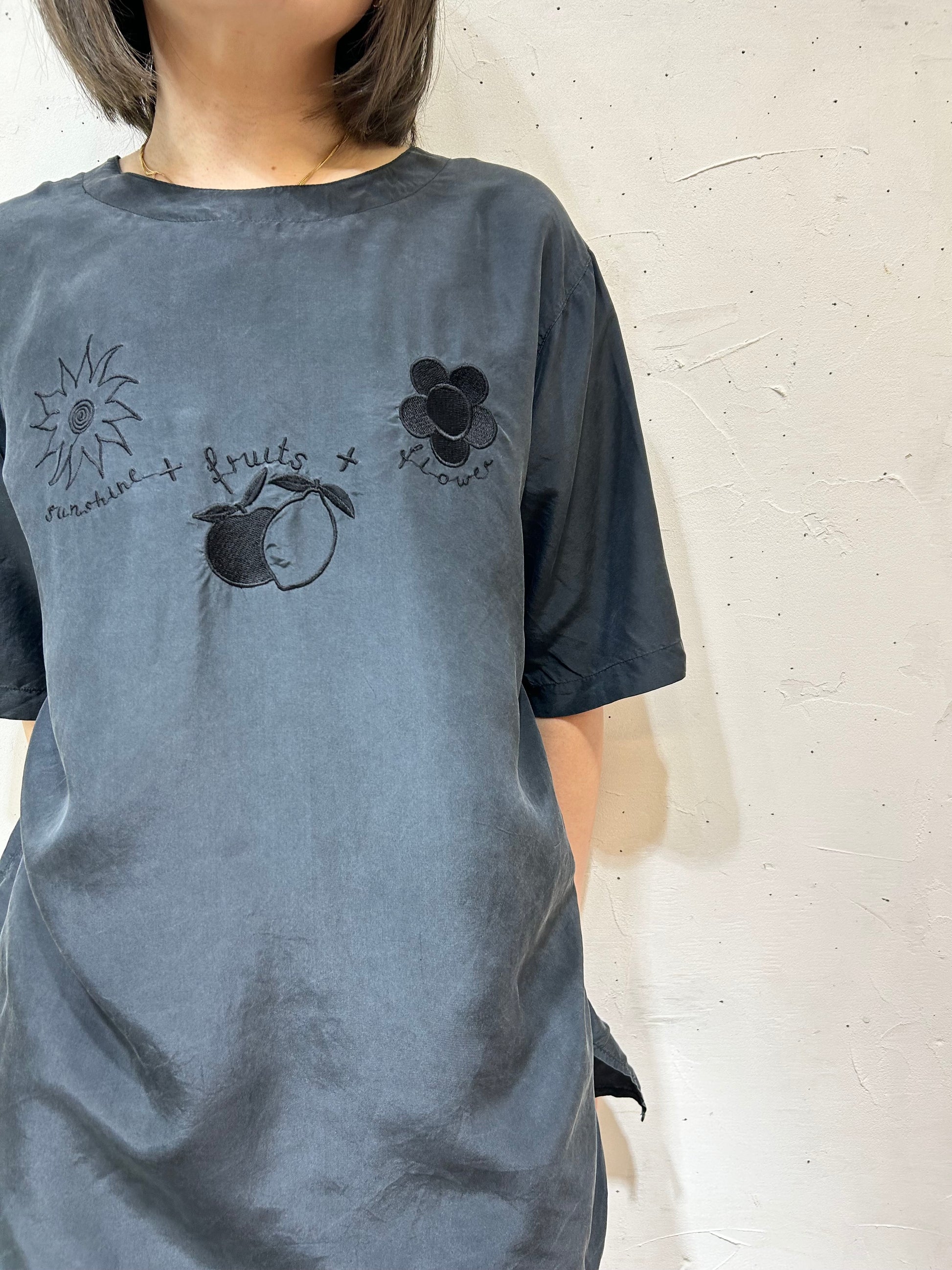 太陽、フルーツ、お花の可愛らしいモチーフの刺繍ながらも、ブラック単色で可愛すぎずシックな印象の1着。