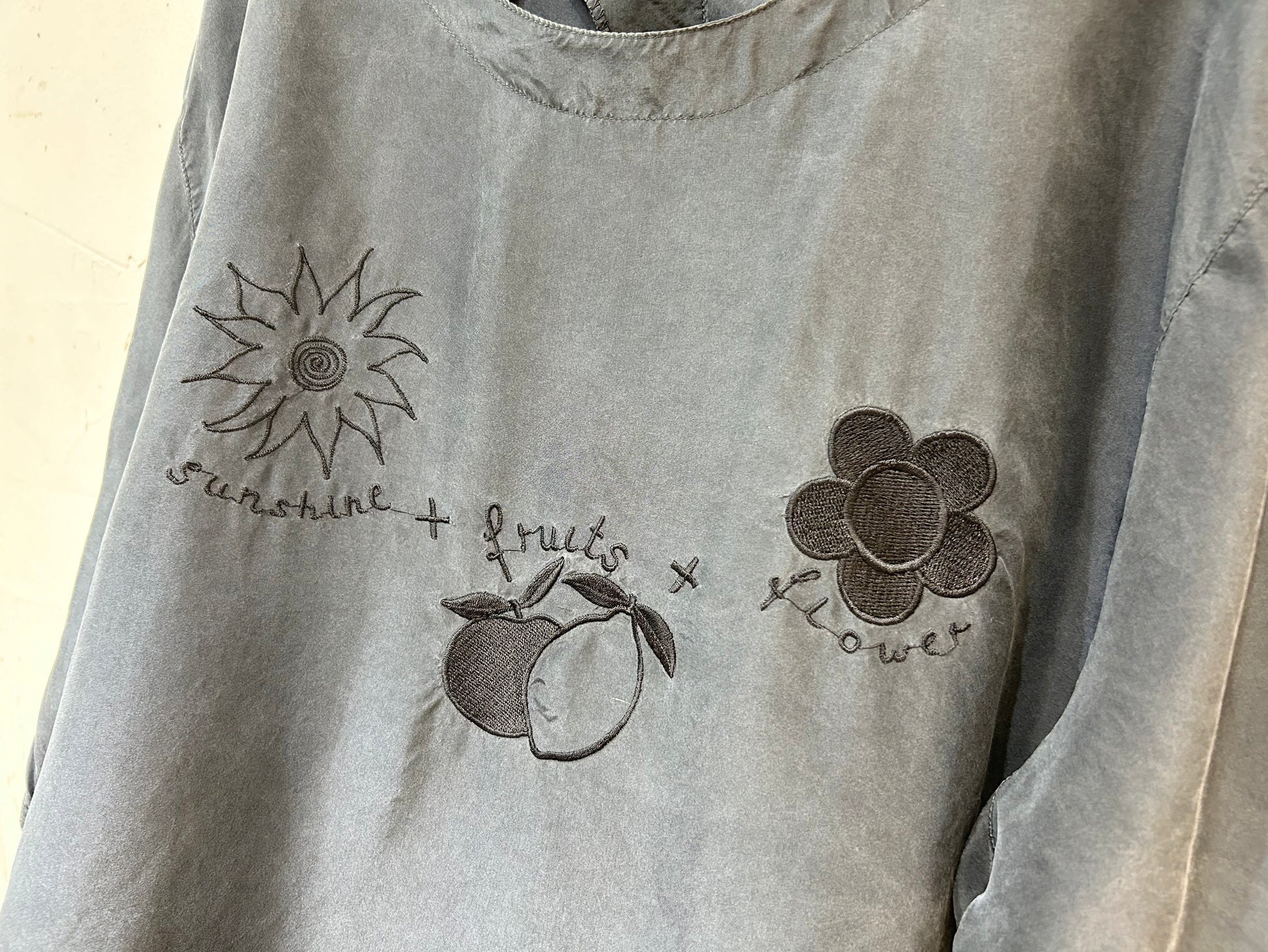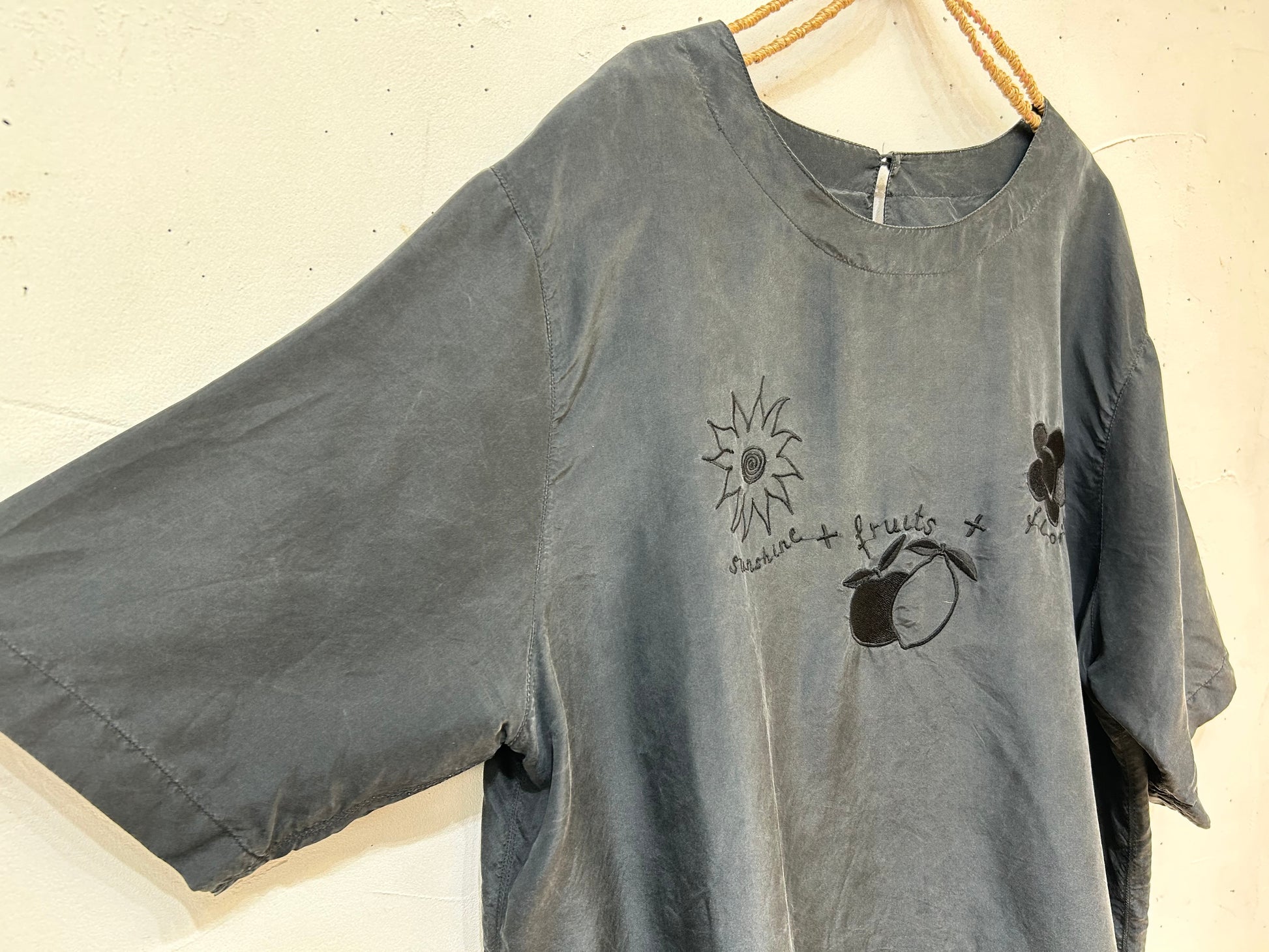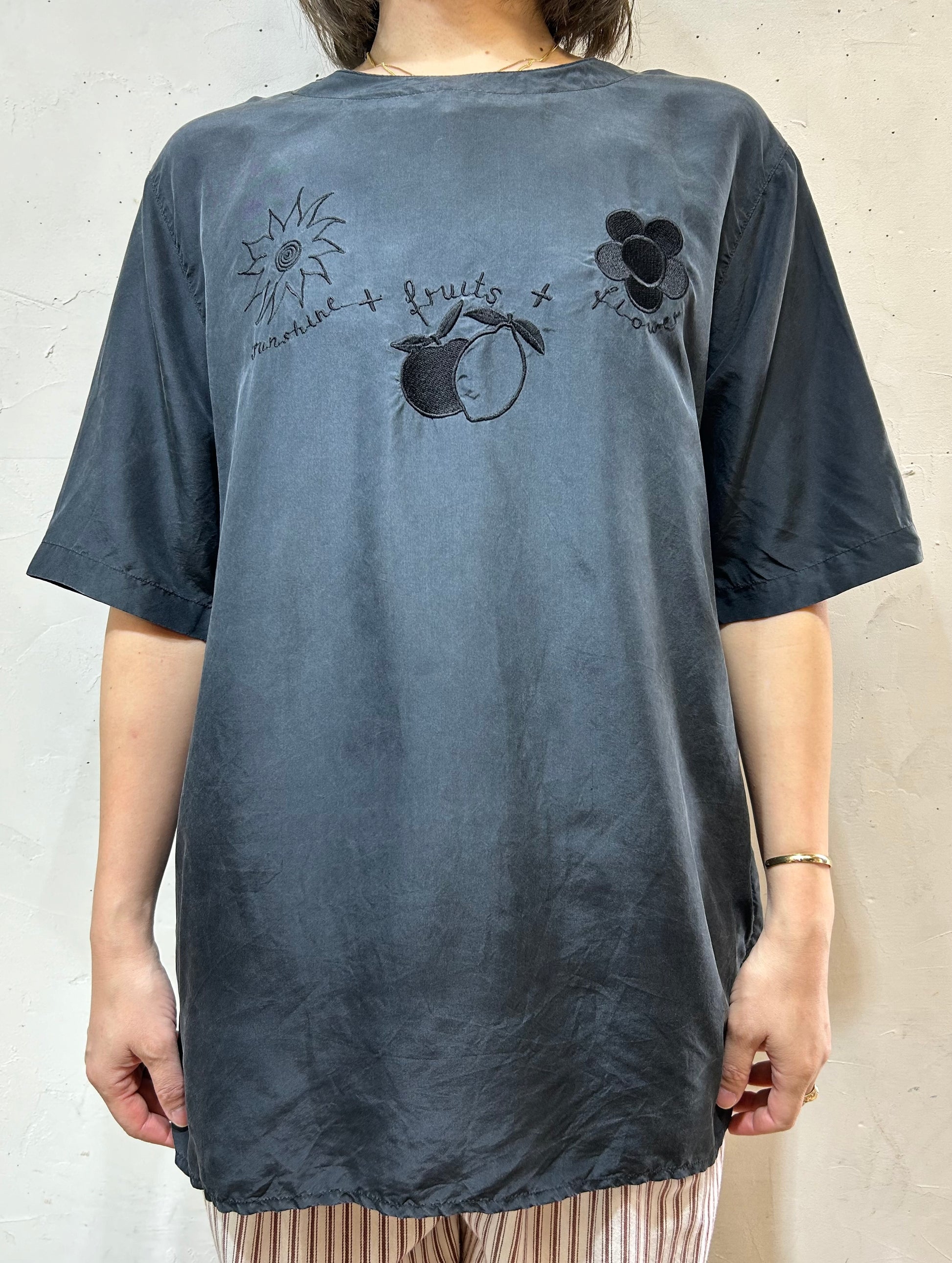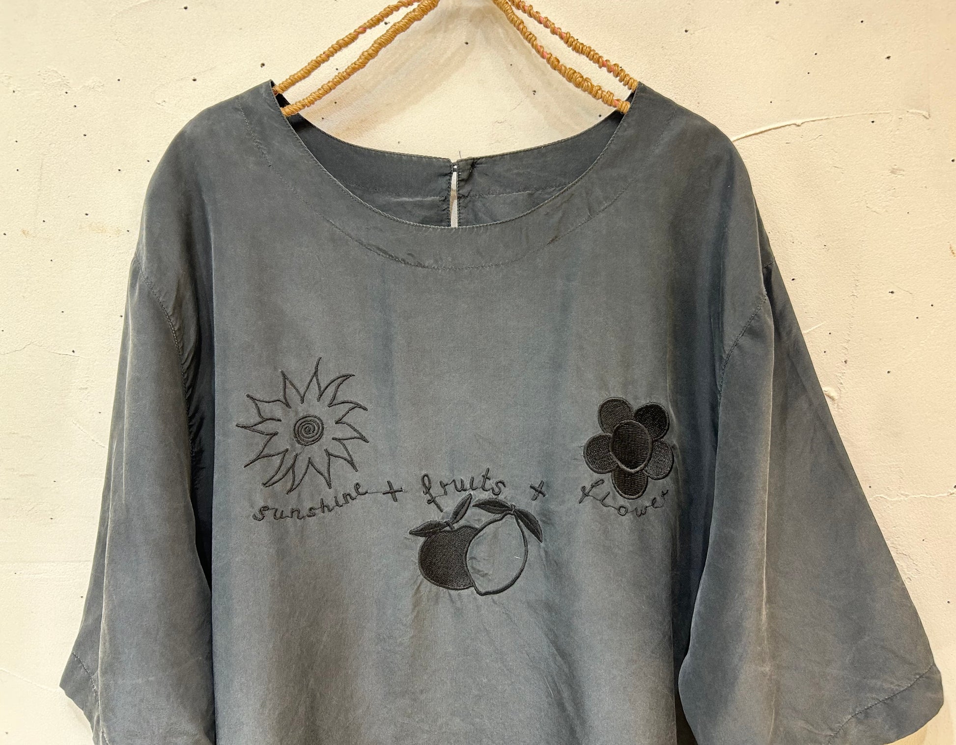 太陽、フルーツ、お花の可愛らしいモチーフの刺繍ながらも、ブラック単色で可愛すぎずシックな印象の1着。