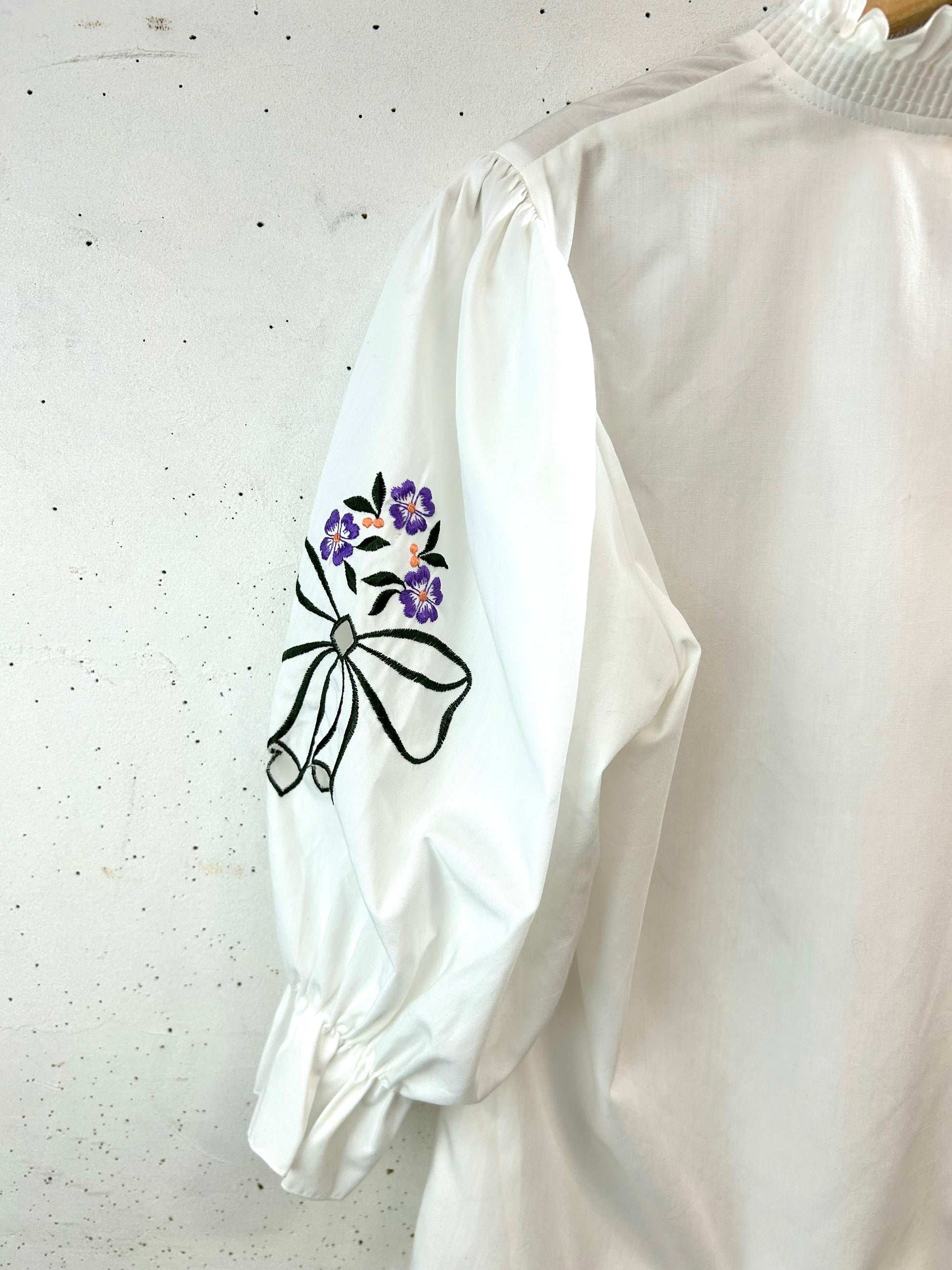 こちらのブラウスは、ホワイトボディーに袖の大きなリボン刺繍とカットワークのとても存在感のある素晴らしい一着。