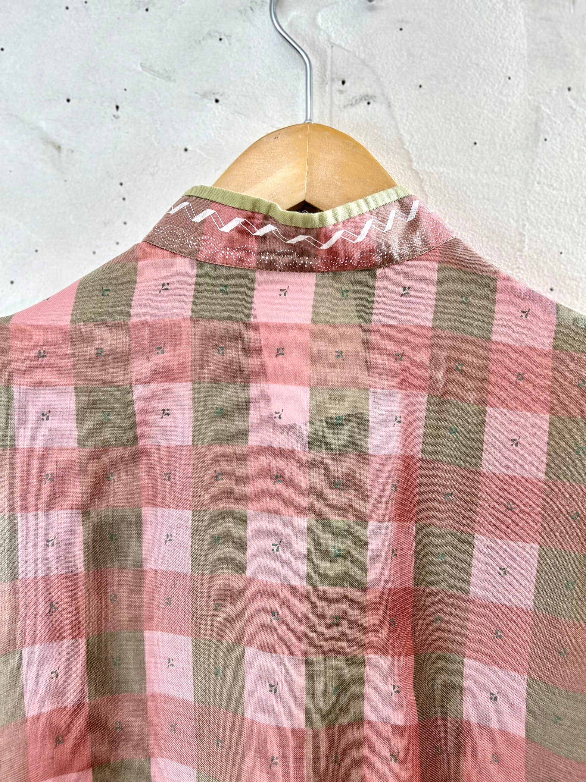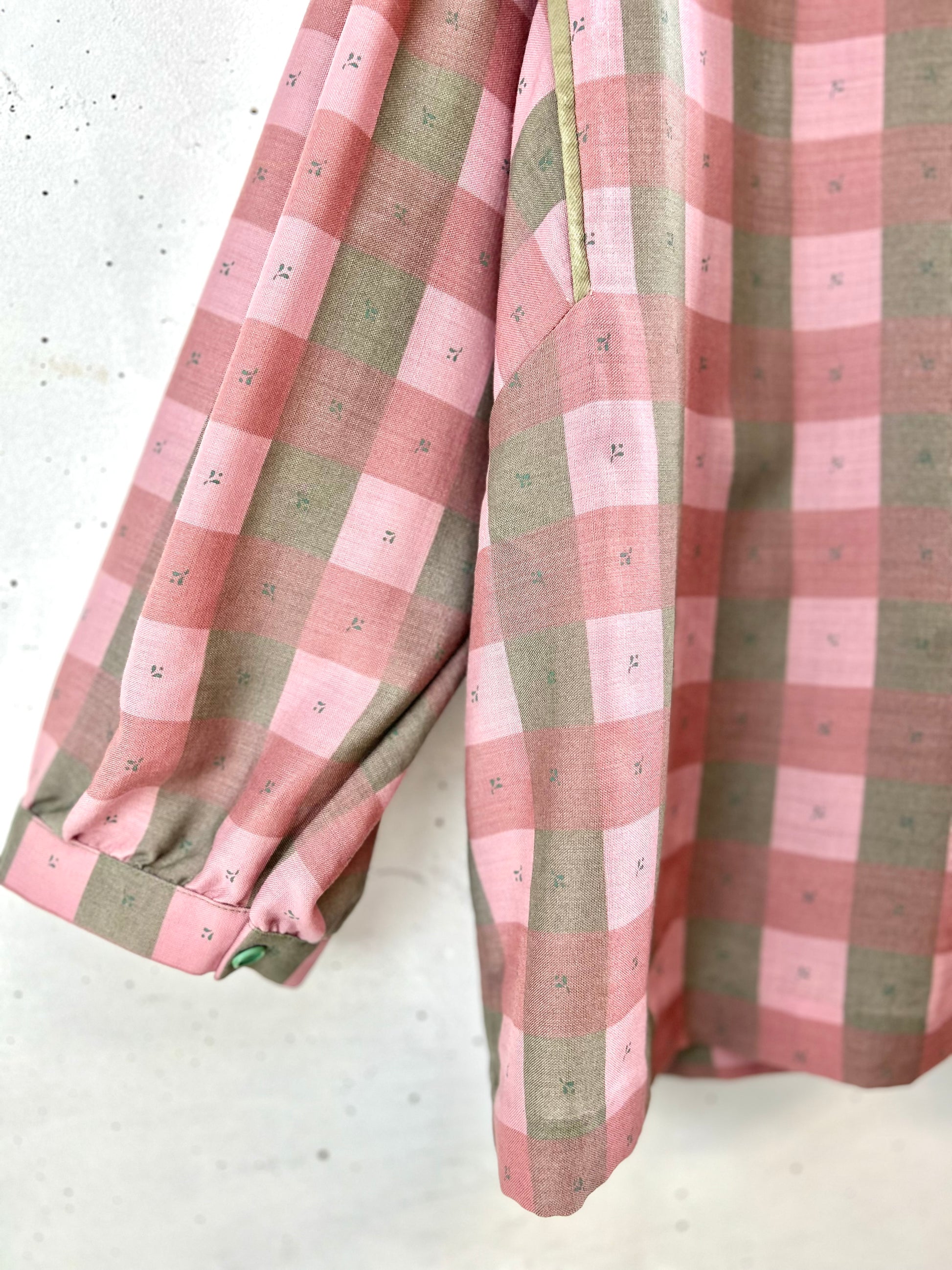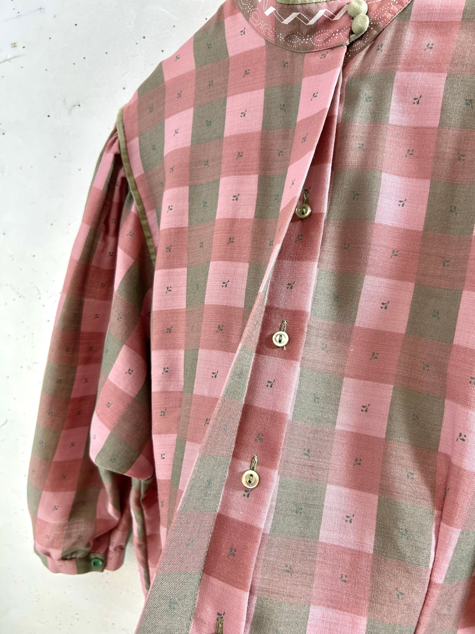 こちらのブラウスは、くすみのある優しい色味のチェックパターンに、襟とボディーのプリントが可愛い一着。