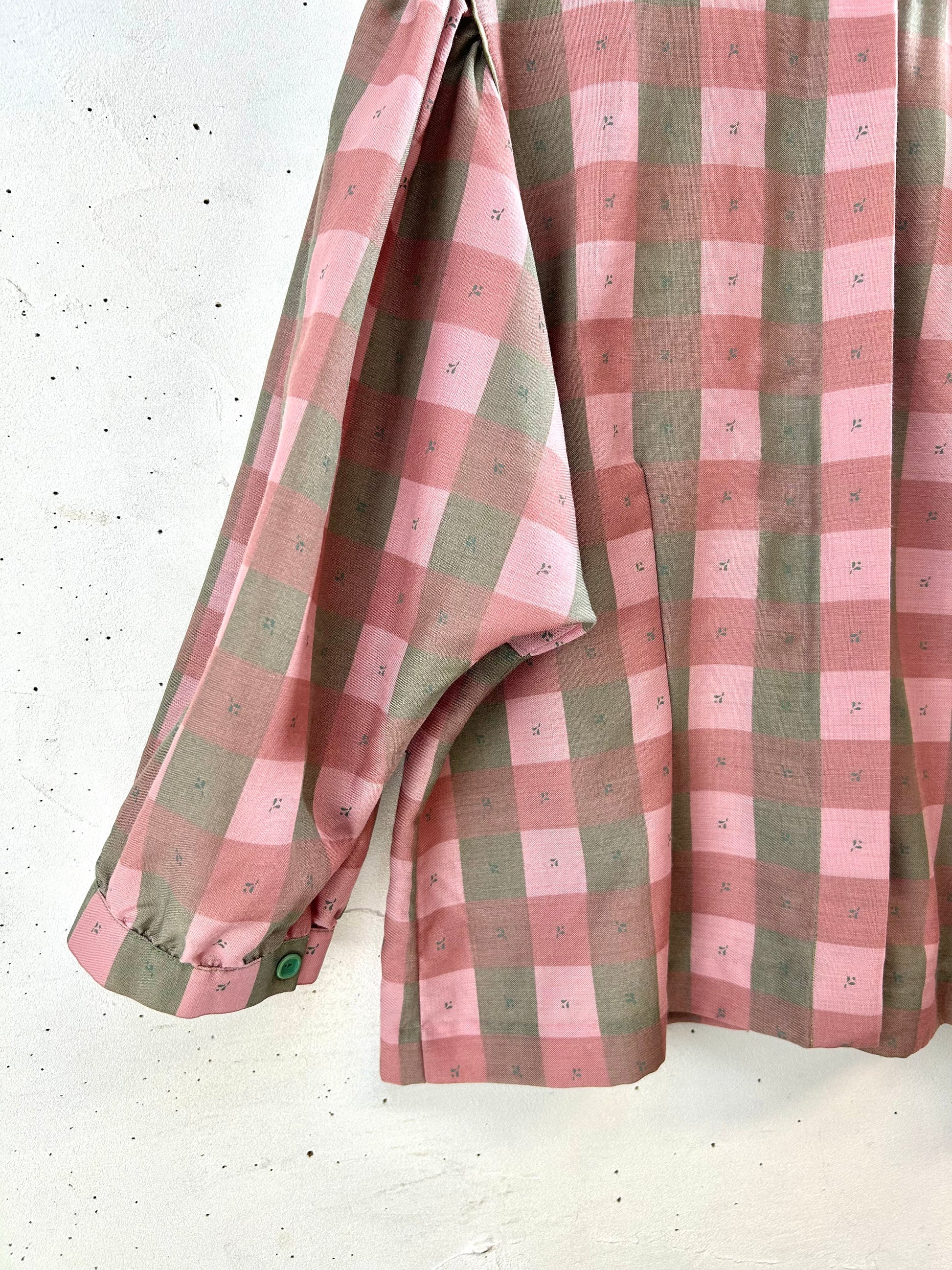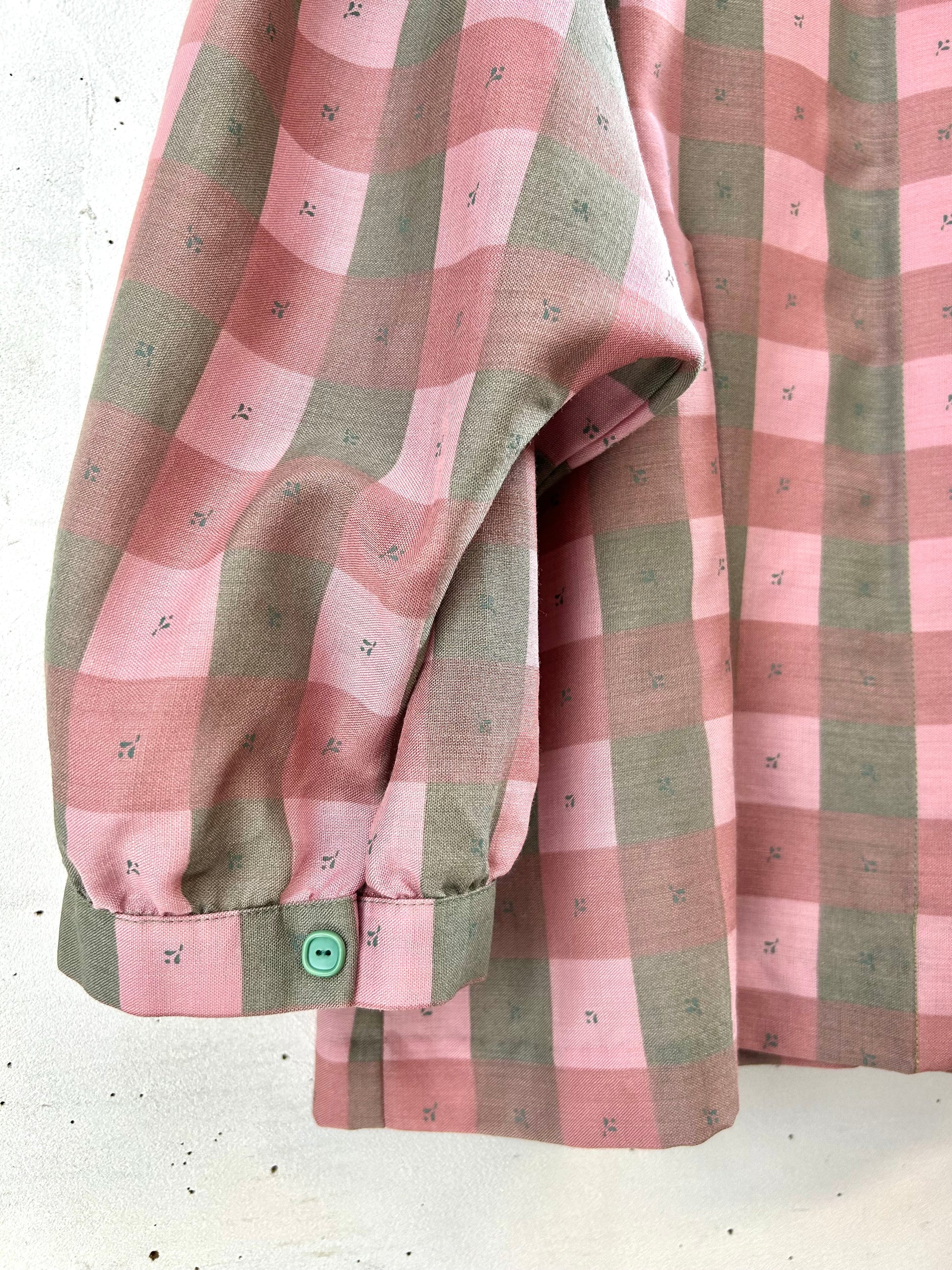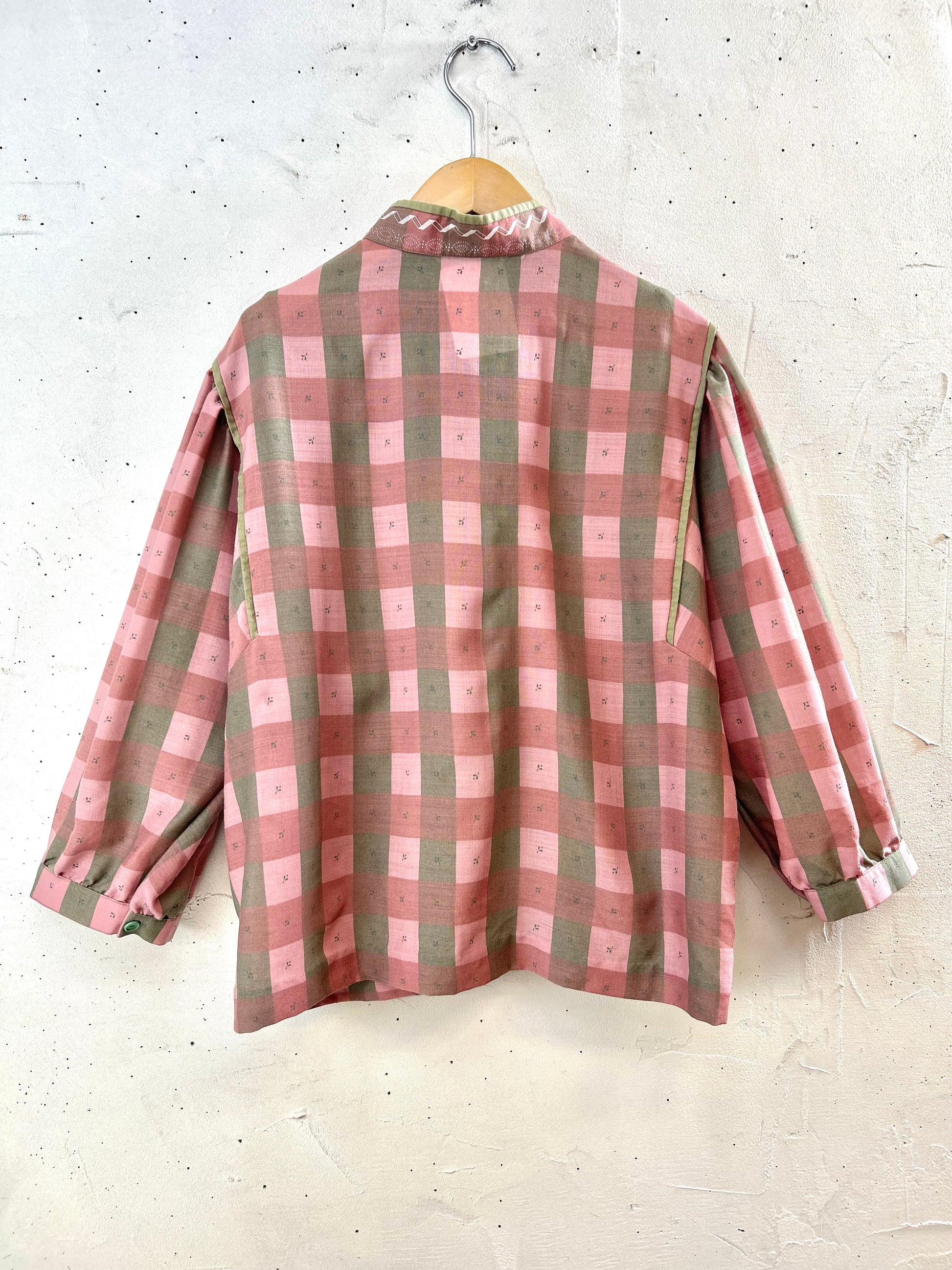 こちらのブラウスは、くすみのある優しい色味のチェックパターンに、襟とボディーのプリントが可愛い一着。