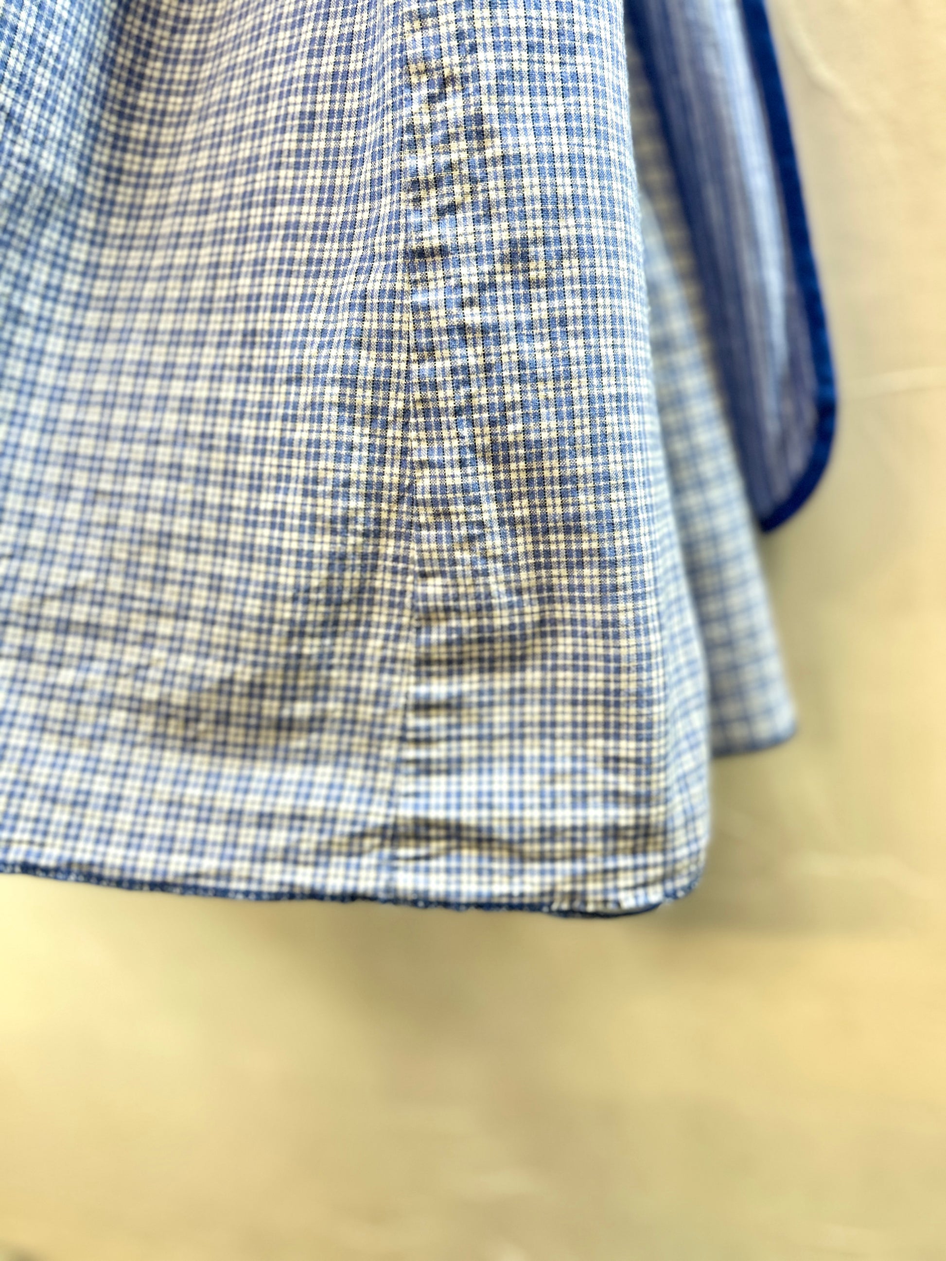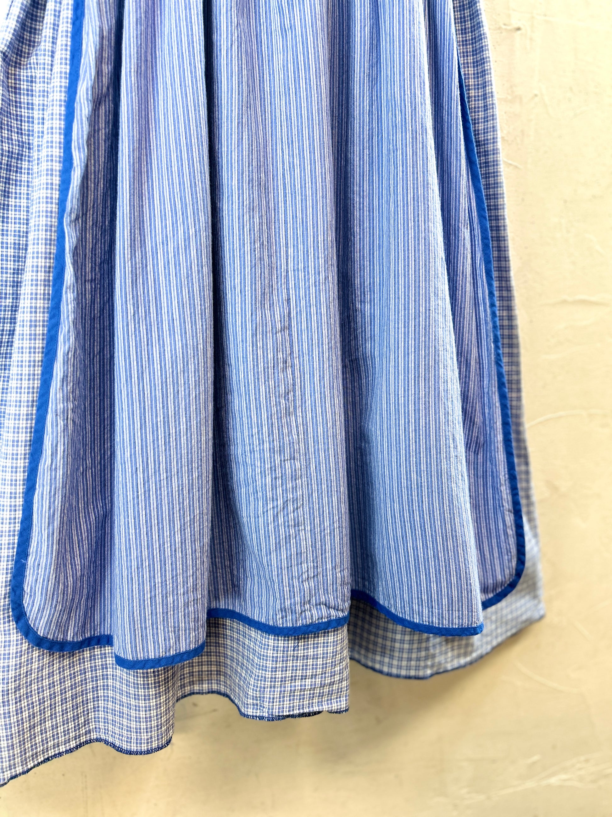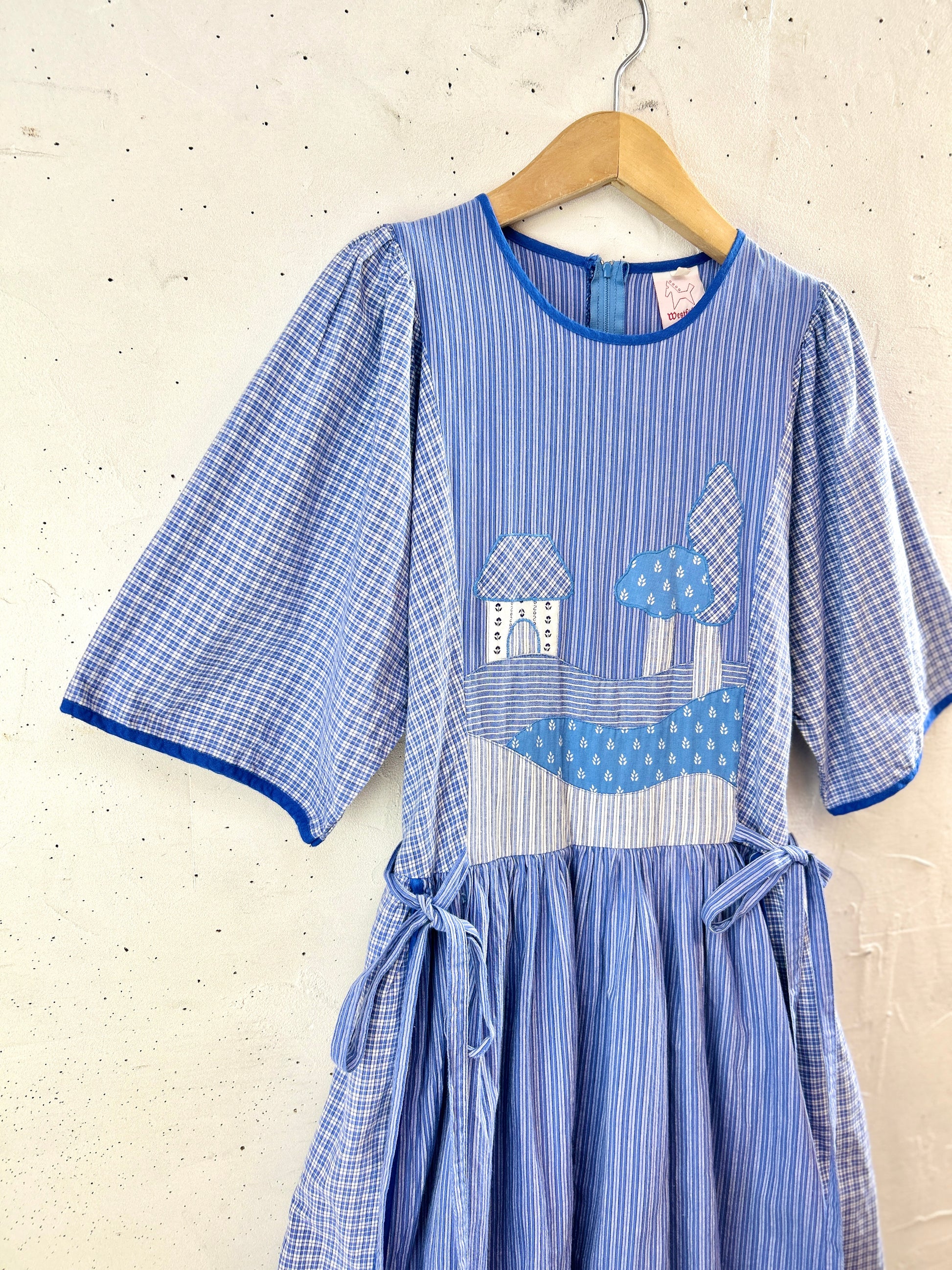 ストライプとチェックのナチュラルな風合いのボディに、森の中の一軒家がアップリケされた可愛らしい一着。