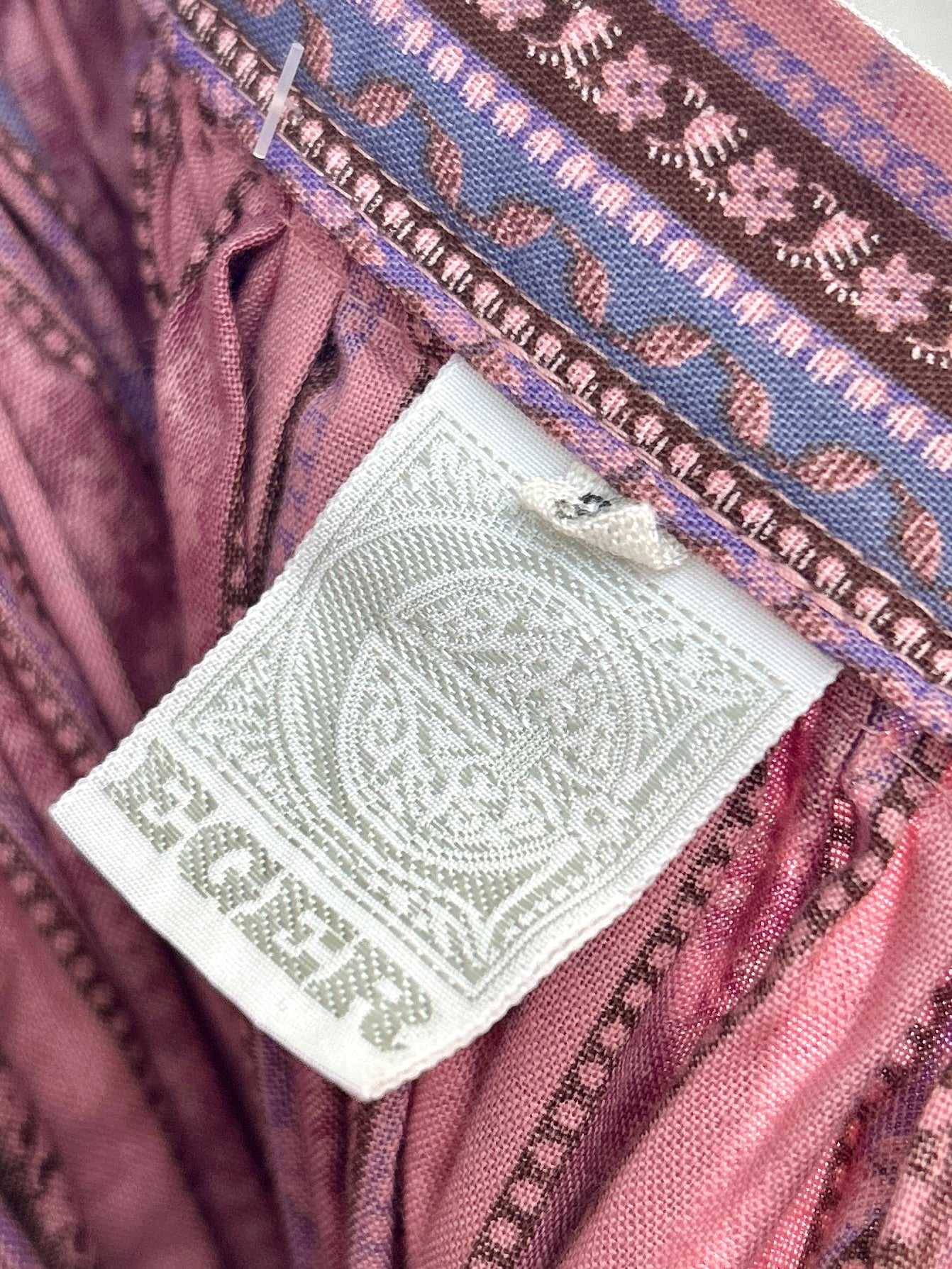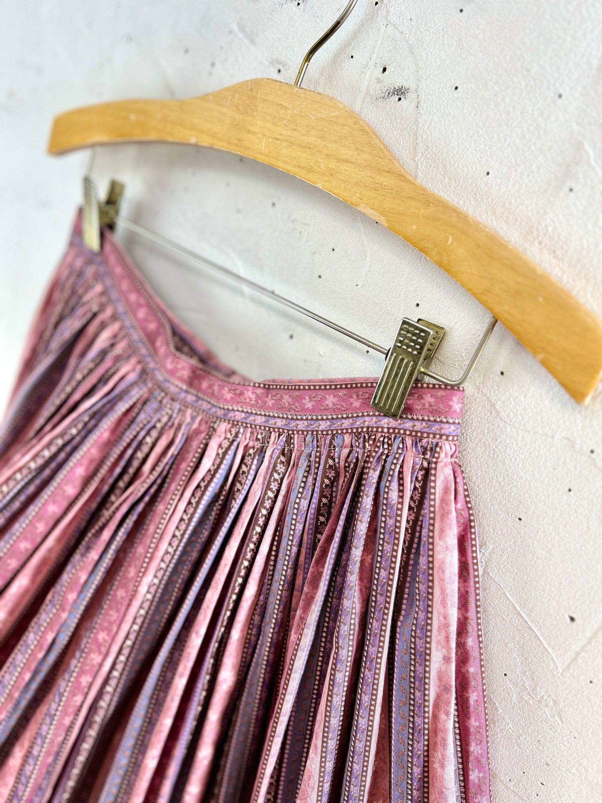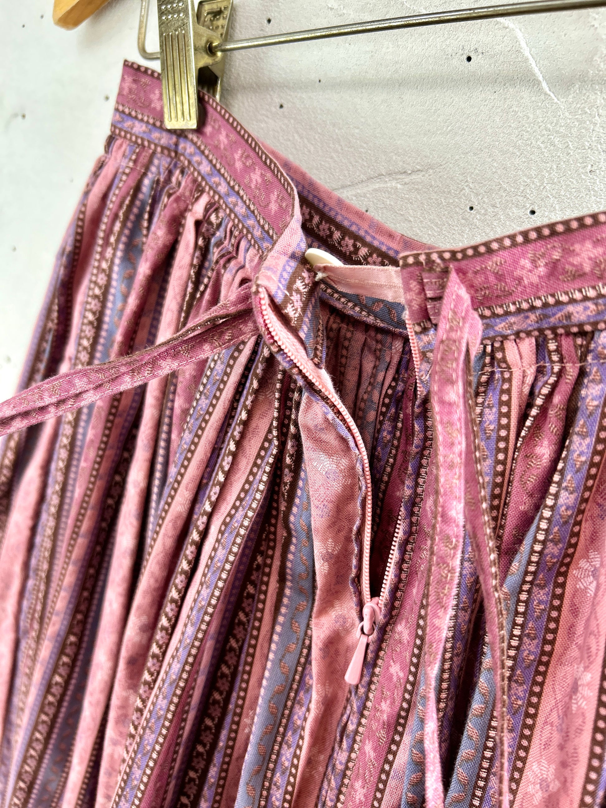 こちらのスカートは、ピンクを基調としたストライプにフラワーなどの織り柄が上品で、チロル特有の雰囲気が目を引く1着。