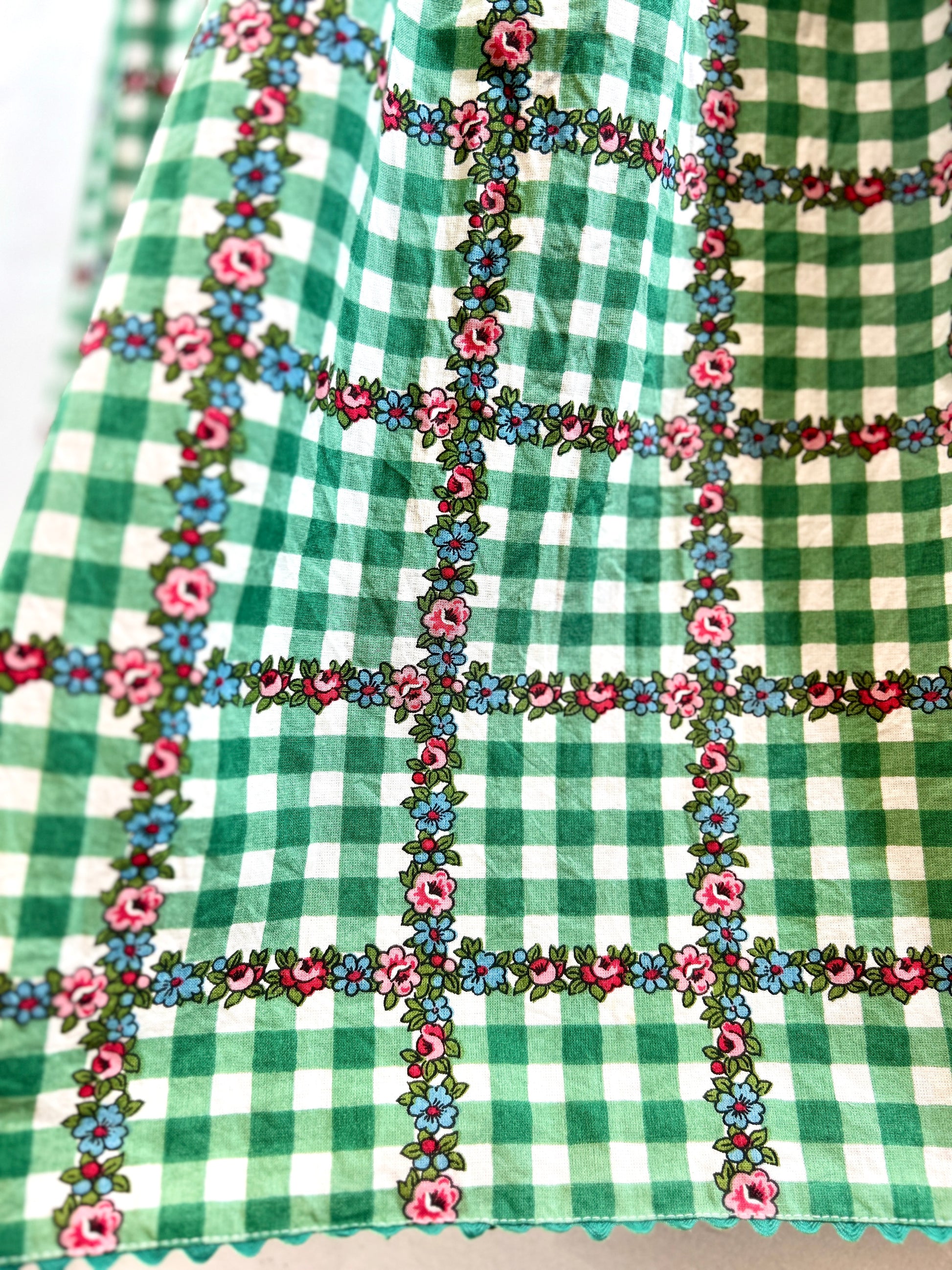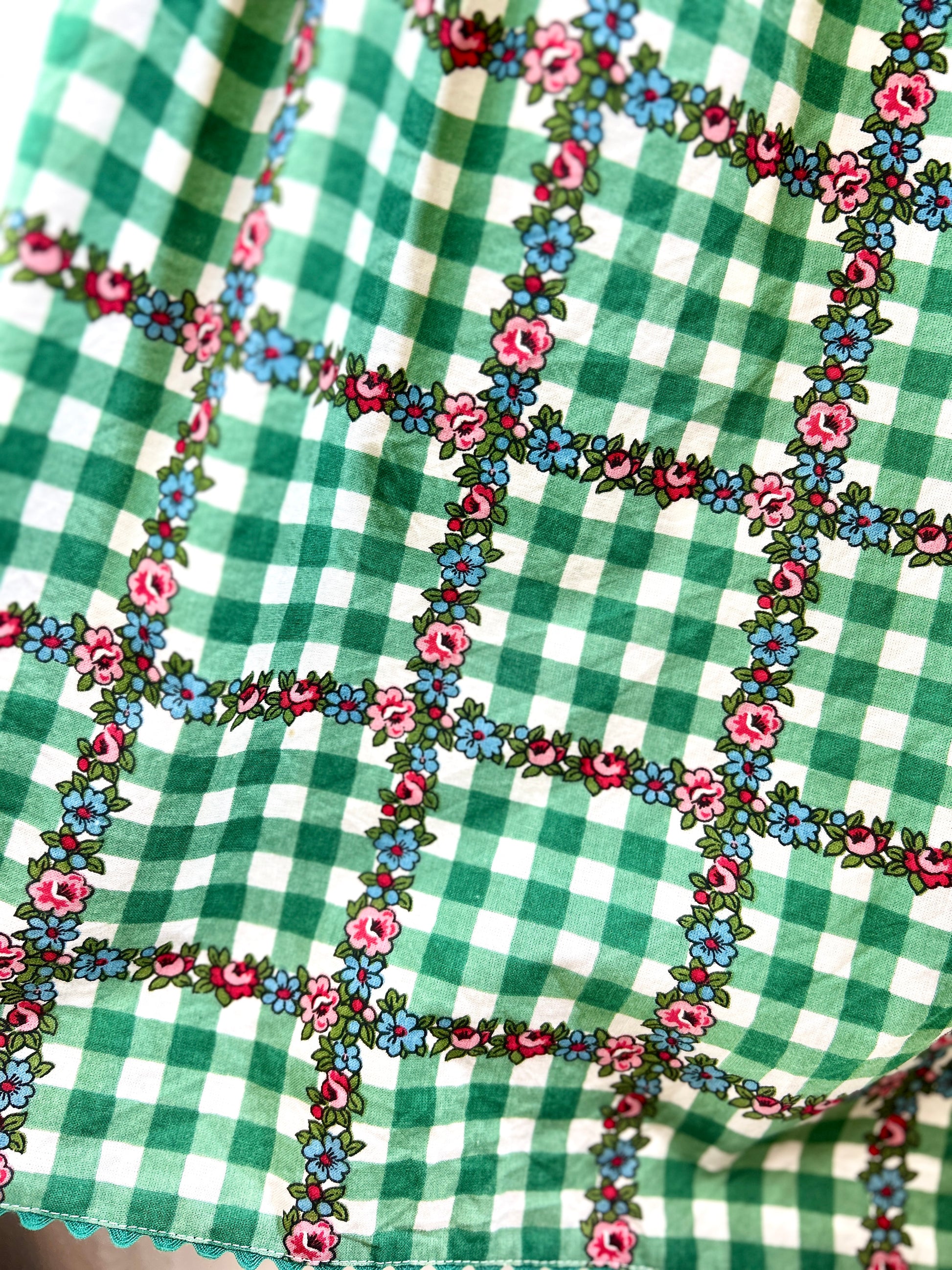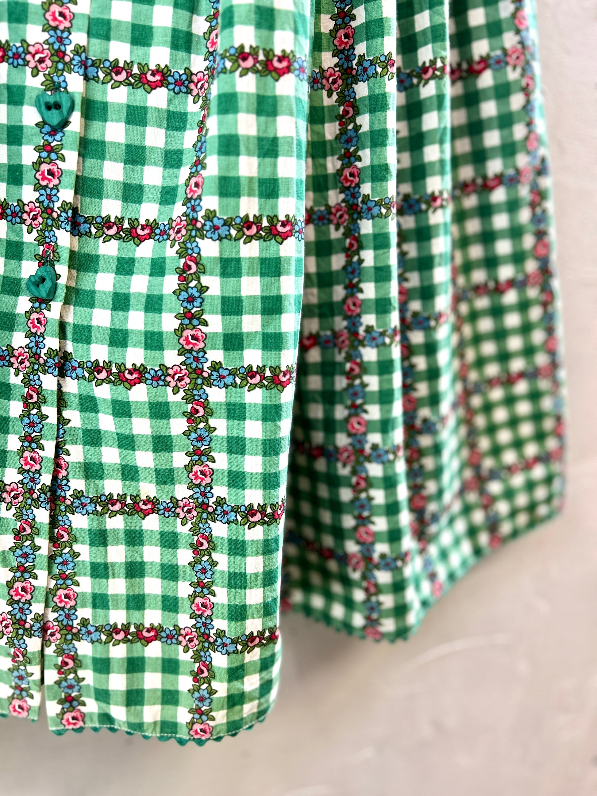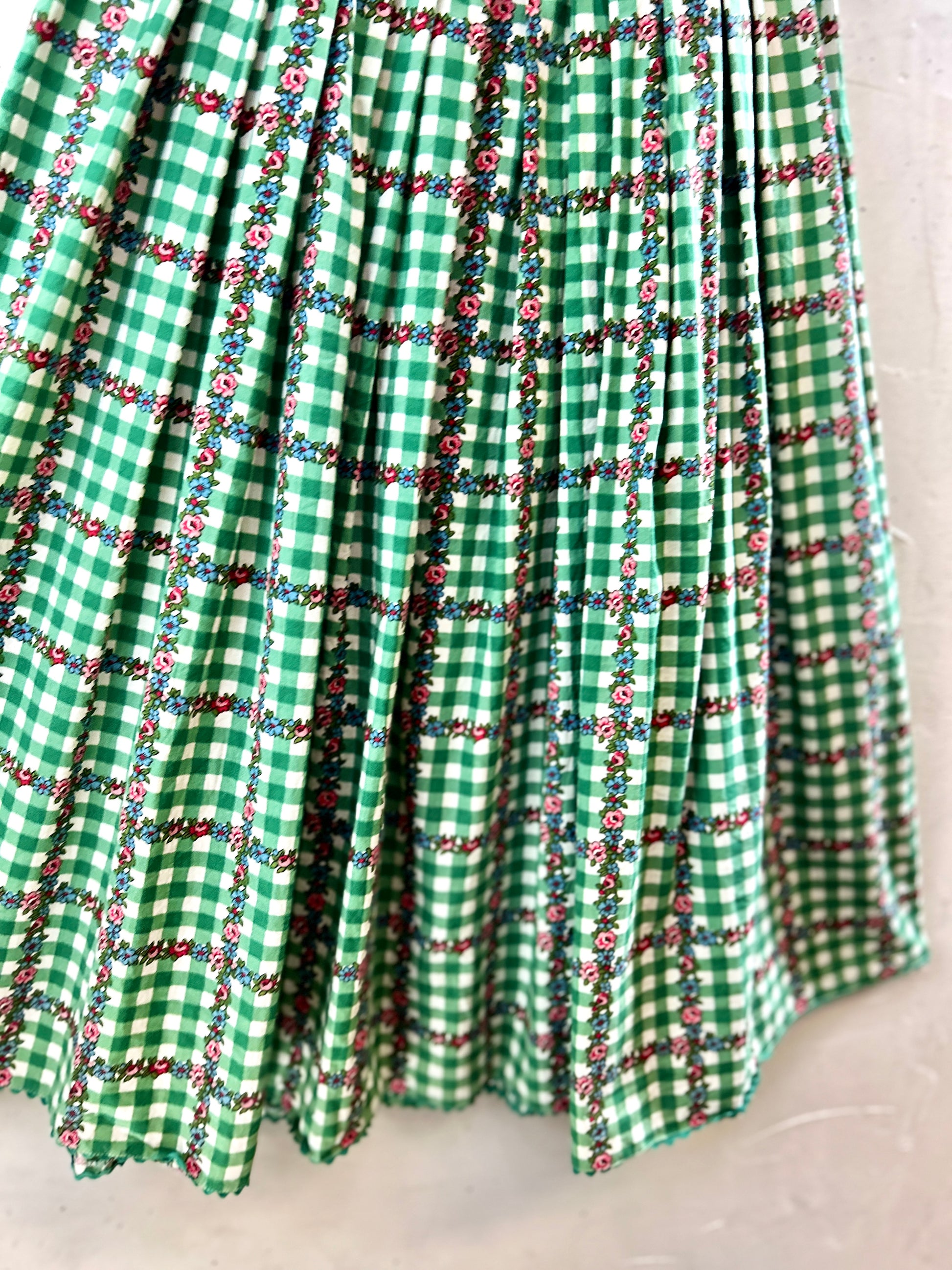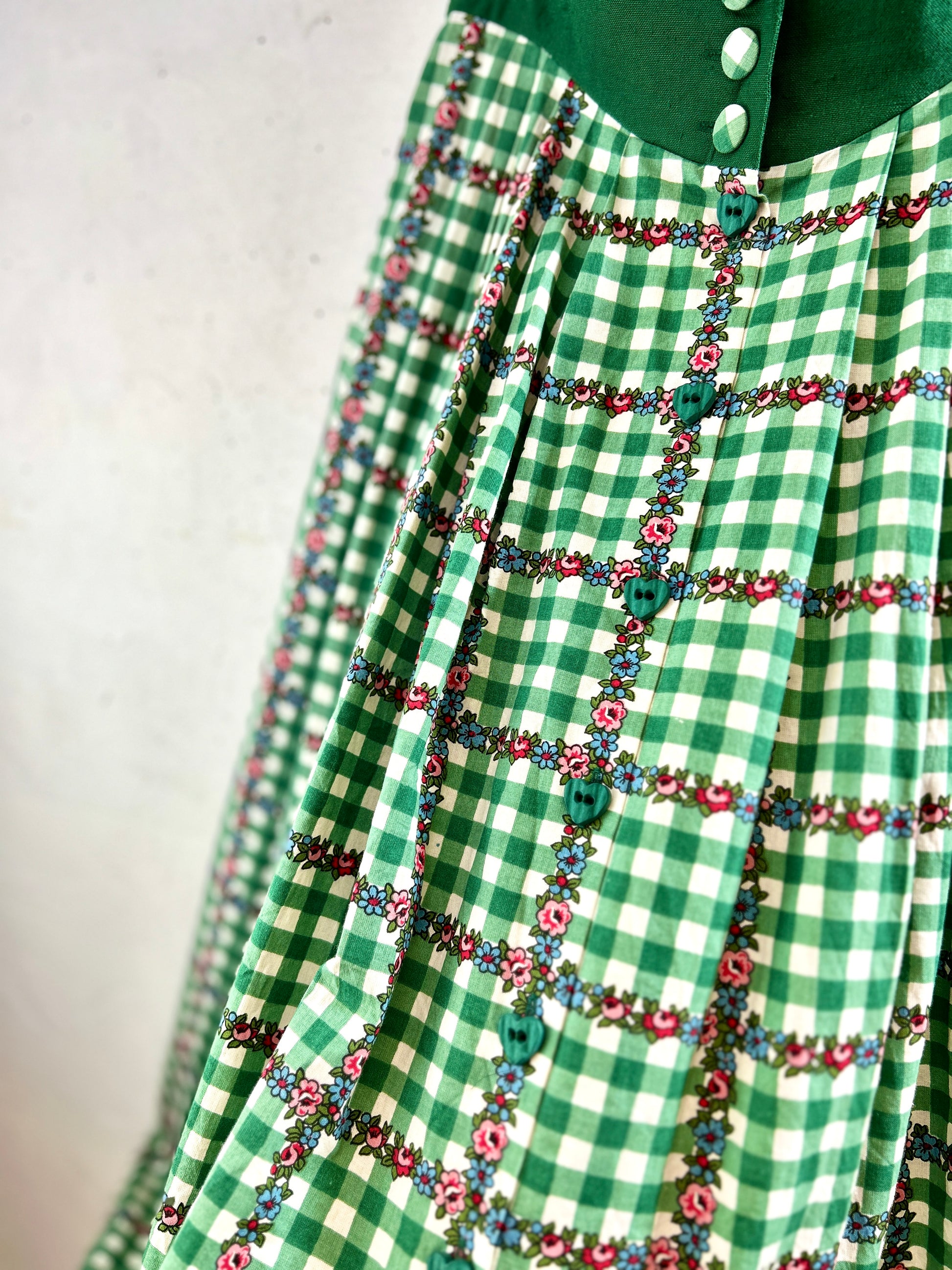 こちらのスカートは、グリーンを基調としたチェックにフラワープリントが重ねられた柄や、ハートのボタンが可愛らしさの中にも上品で、チロル特有の雰囲気が目を引く1着。