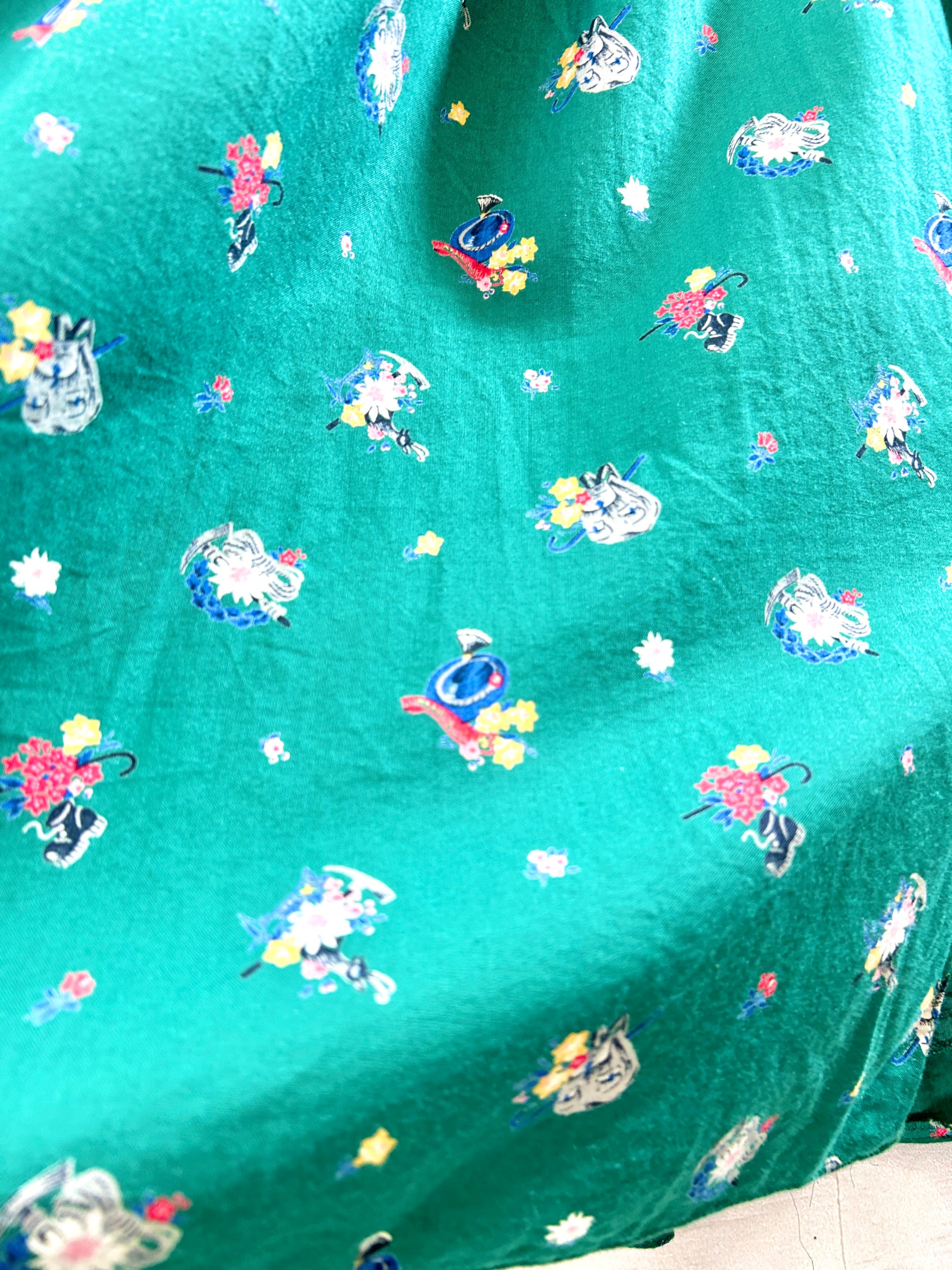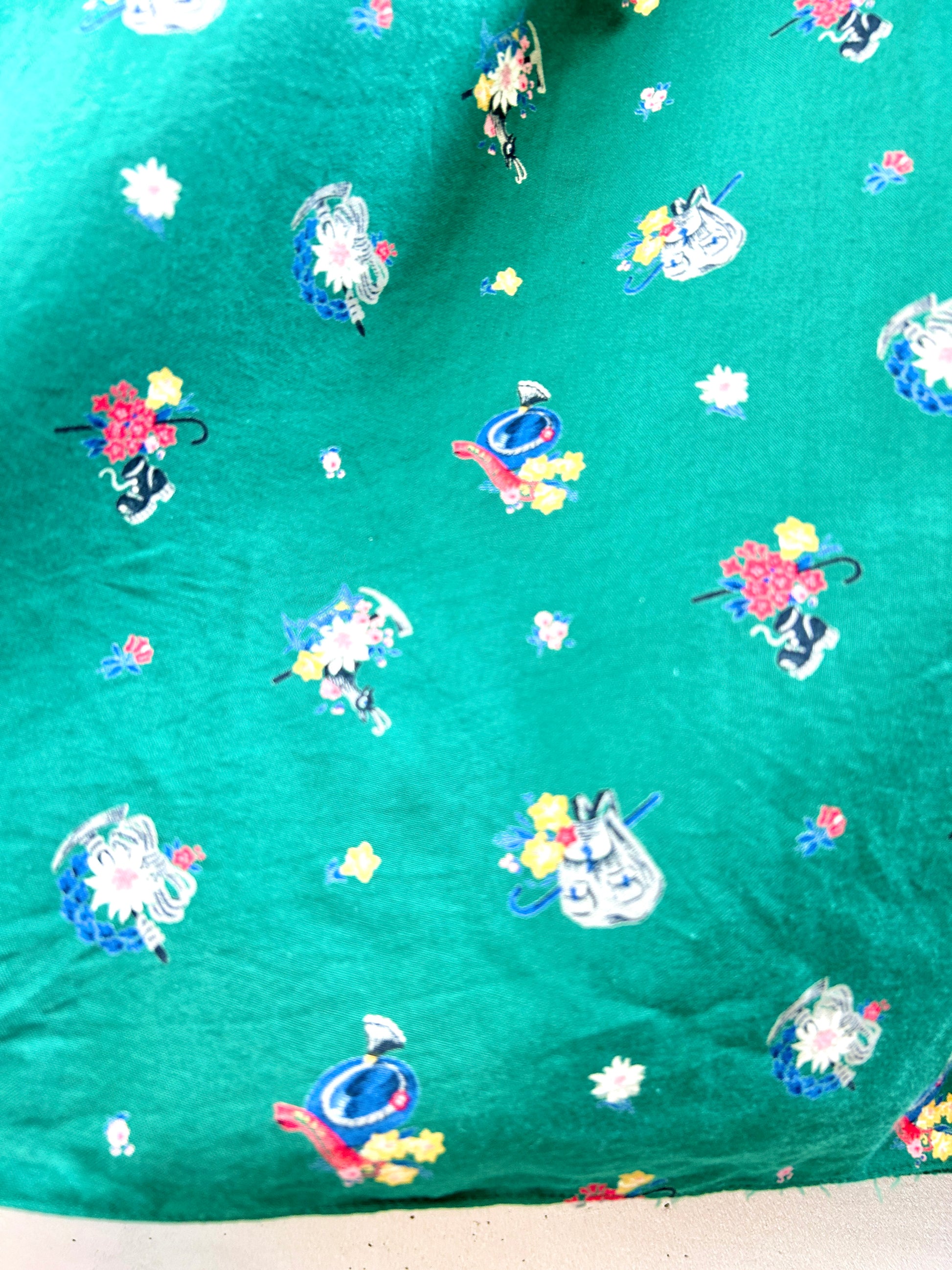 こちらのスカートは、グリーンベースに登山用具とお花がプリントされ、とても可愛らしくチロル特有の雰囲気が目を引く1着。