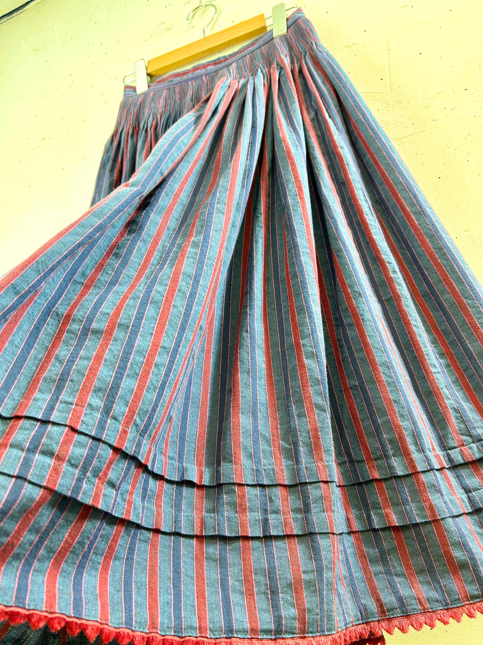 ウエストのギャザーがとてもデザイン性のひかる素敵な1着。ネイビーベースのストライプにピンクの差し色がとても可愛らしいスカートになります