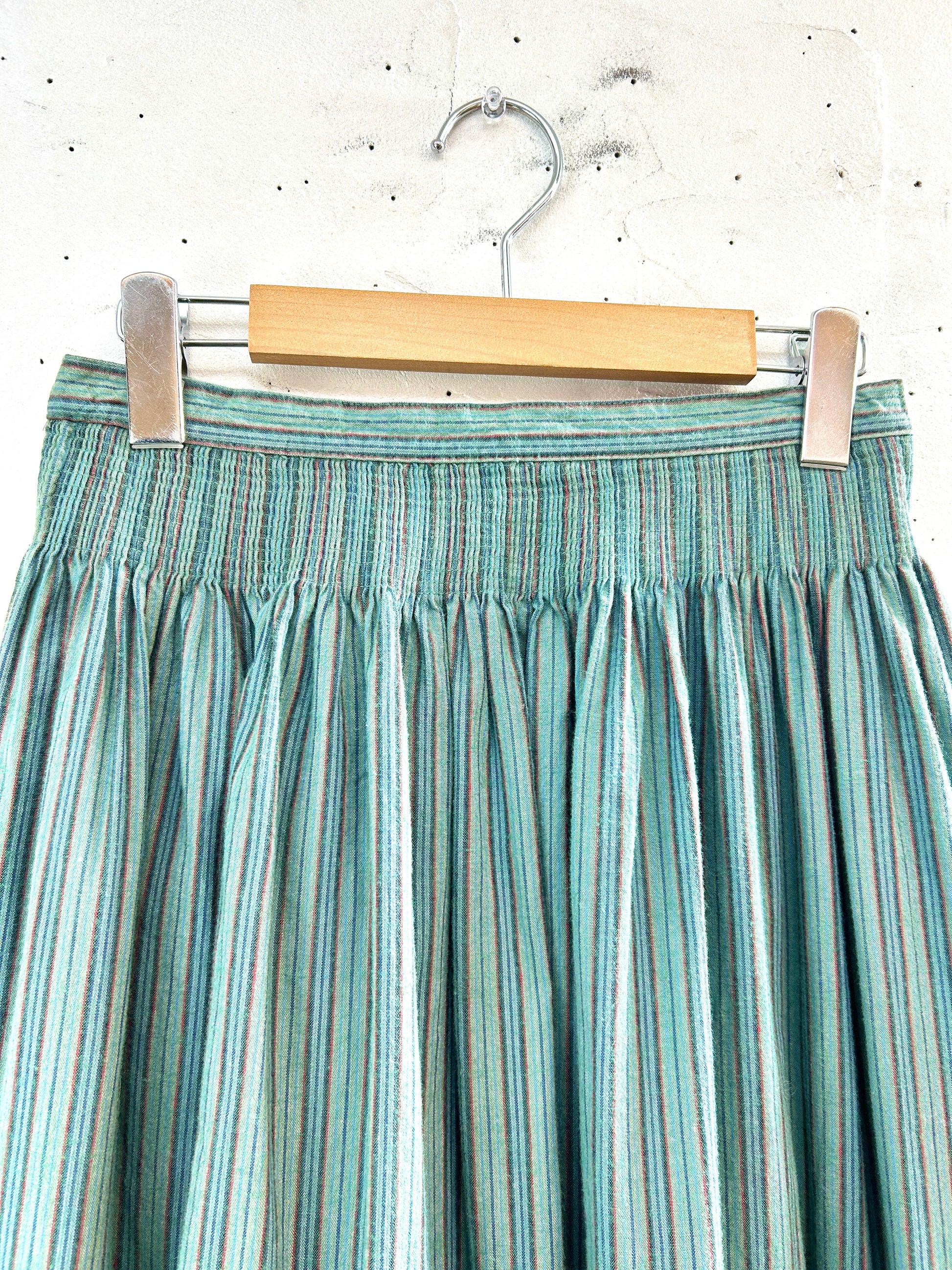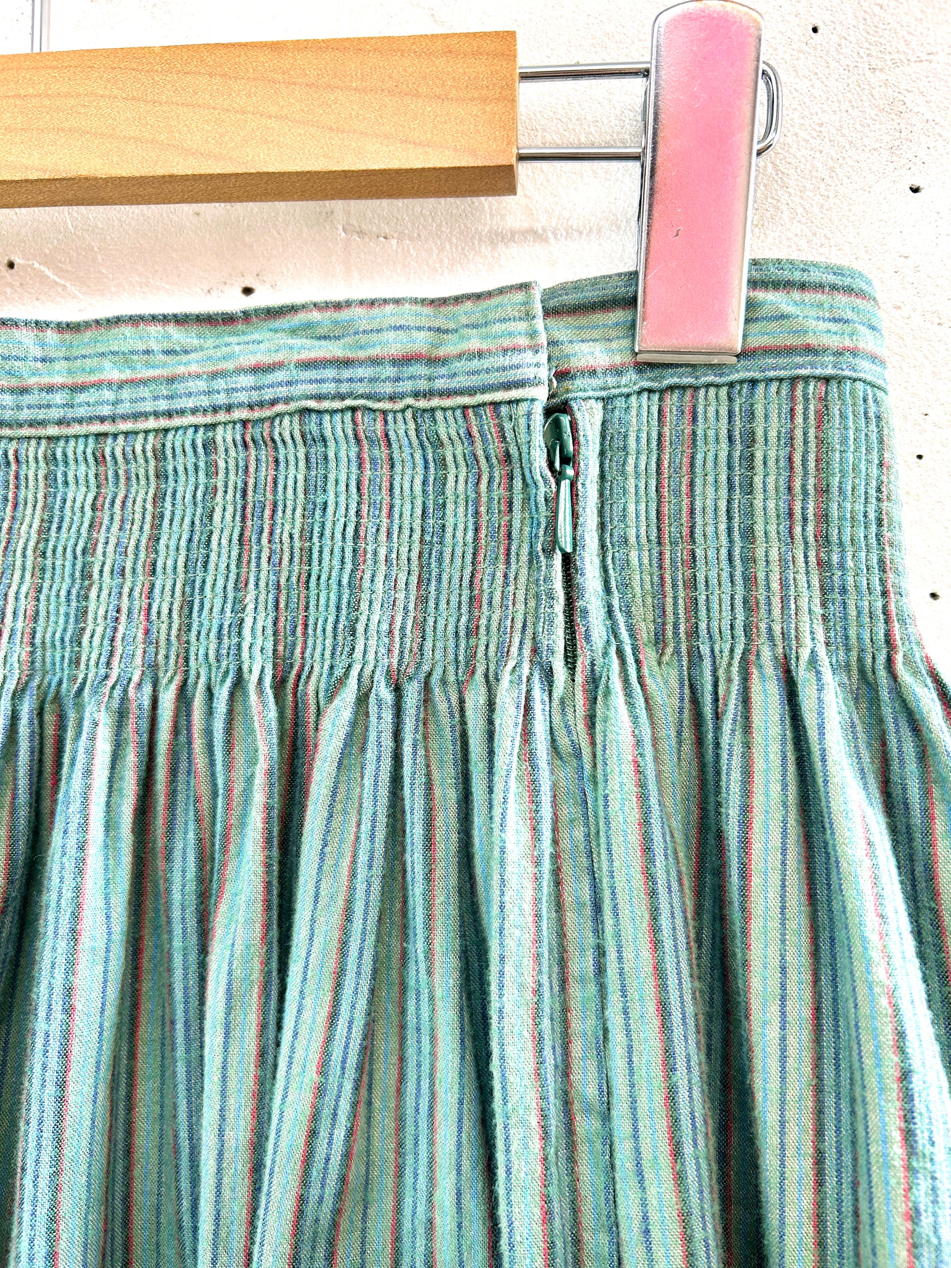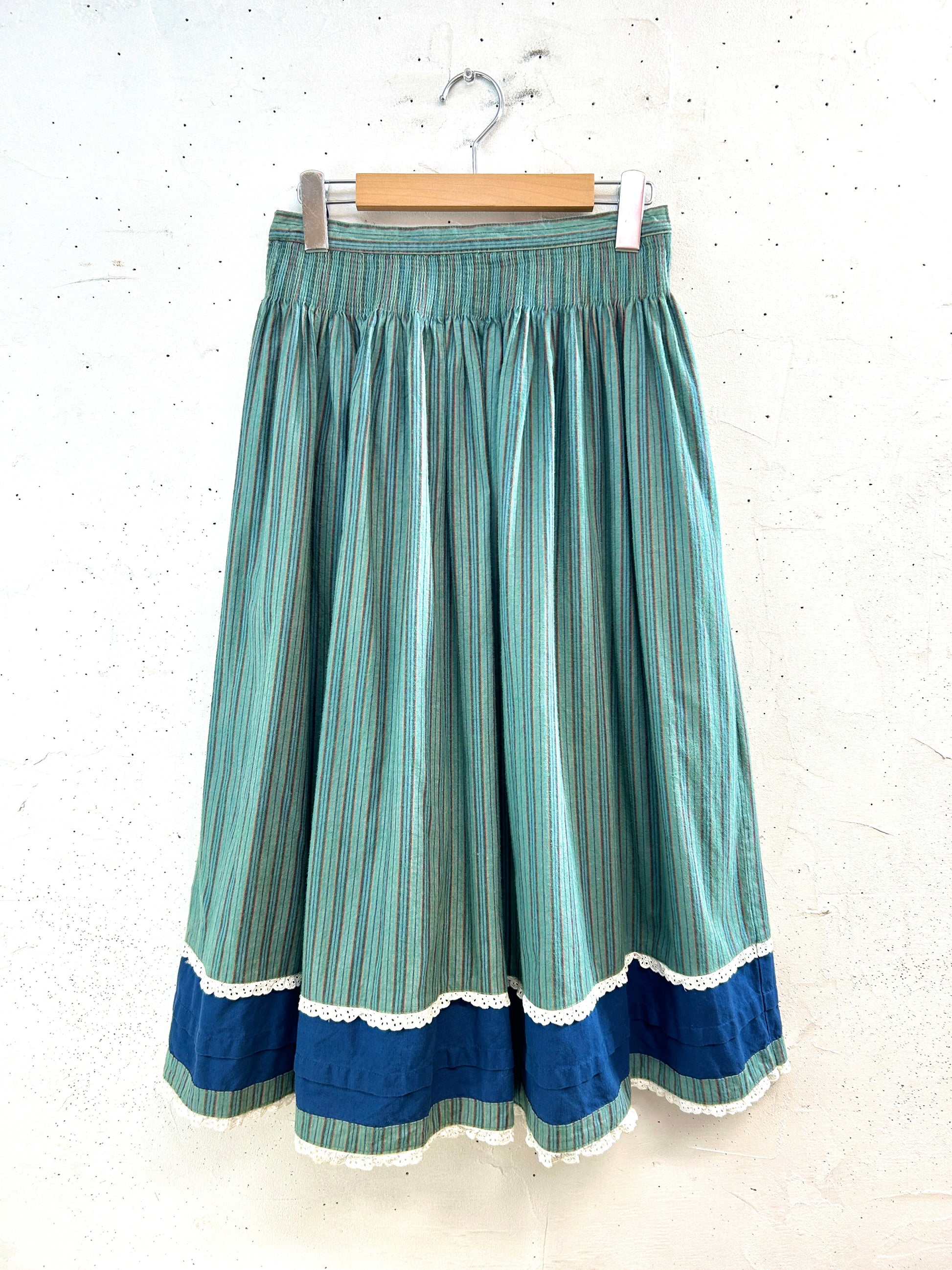 こちらのスカートは、燻んだモスグリーンを基調とし、細かなマルチストライプデザインと裾の切り替えが可愛らしさの中にも上品でチロル特有の雰囲気が目を引く1着。