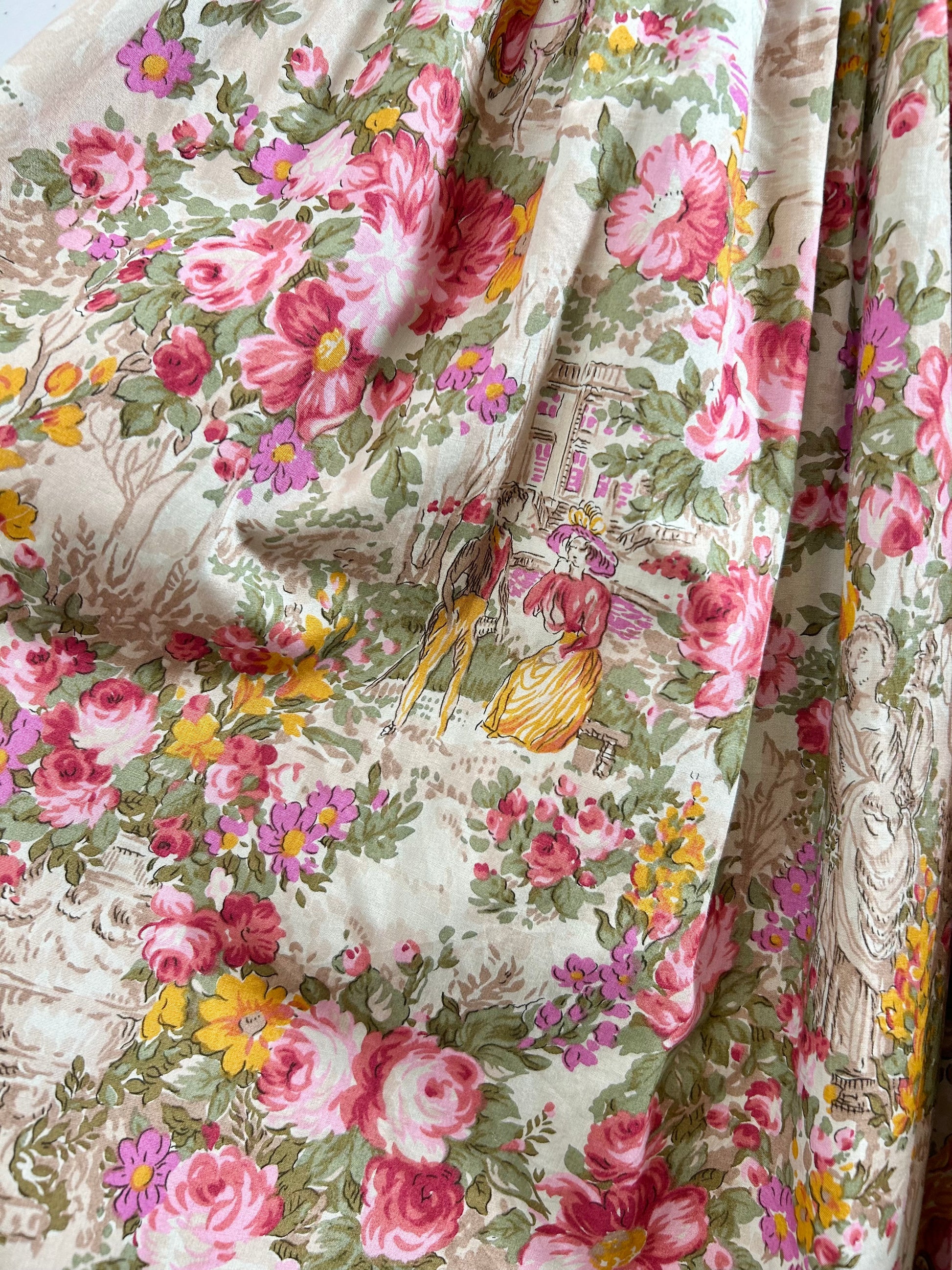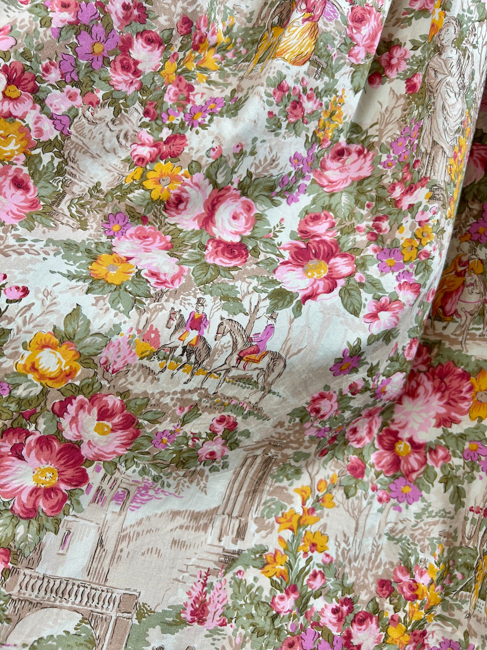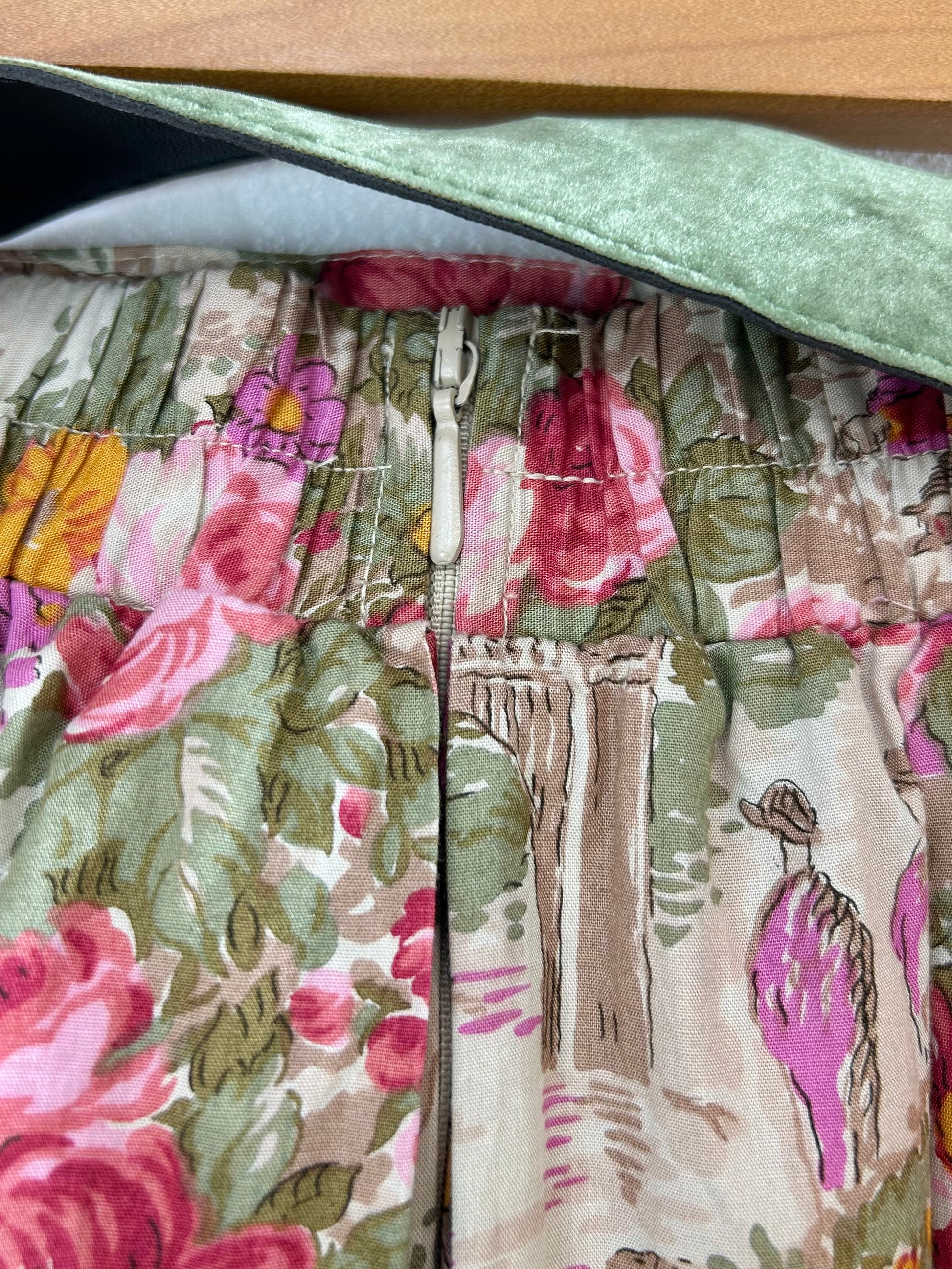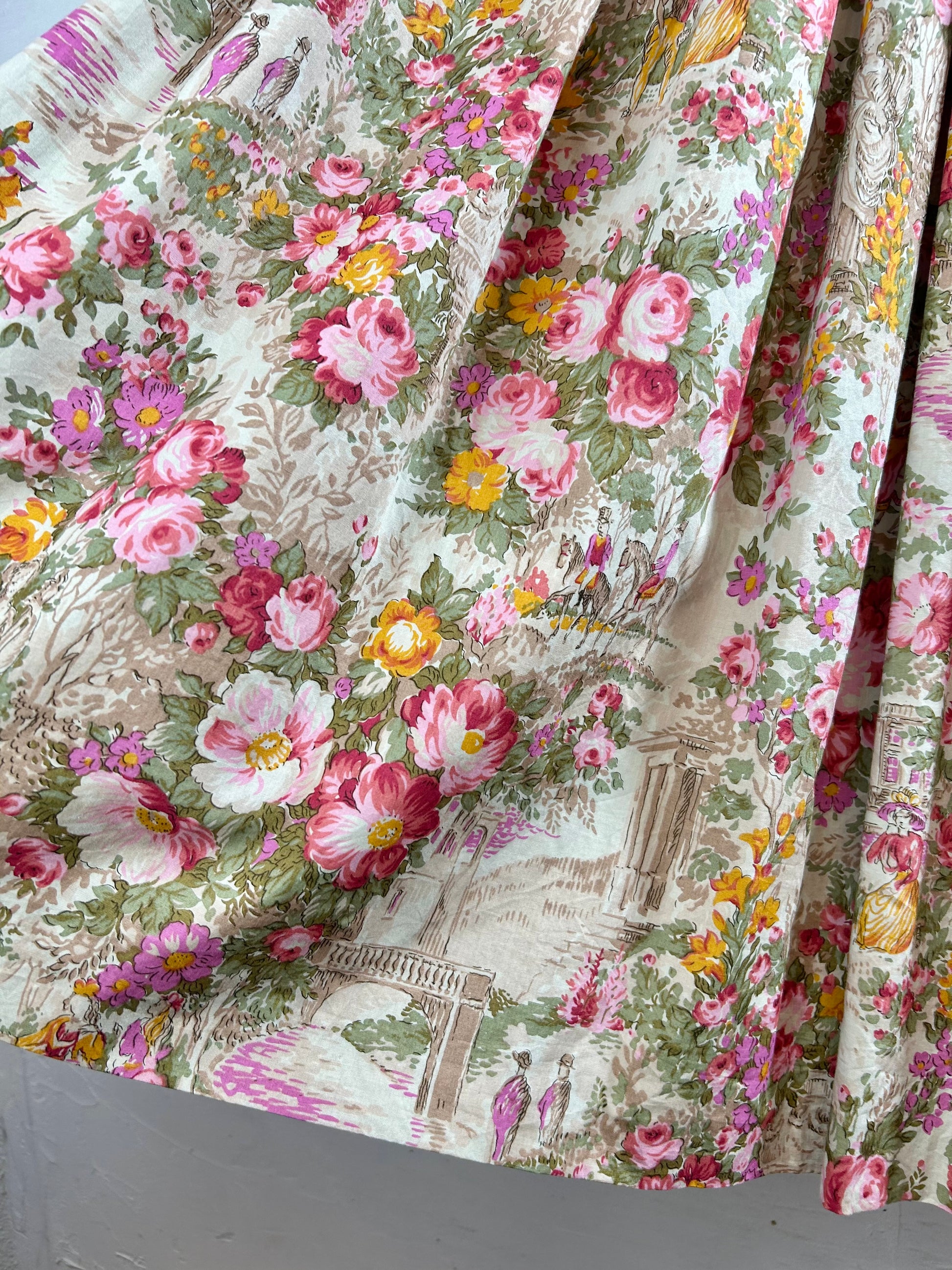 こちらのスカートは、華やかなフラワーと乗馬やお城の庭を散歩する貴族たちが描かれた非常に可愛らしい一着。