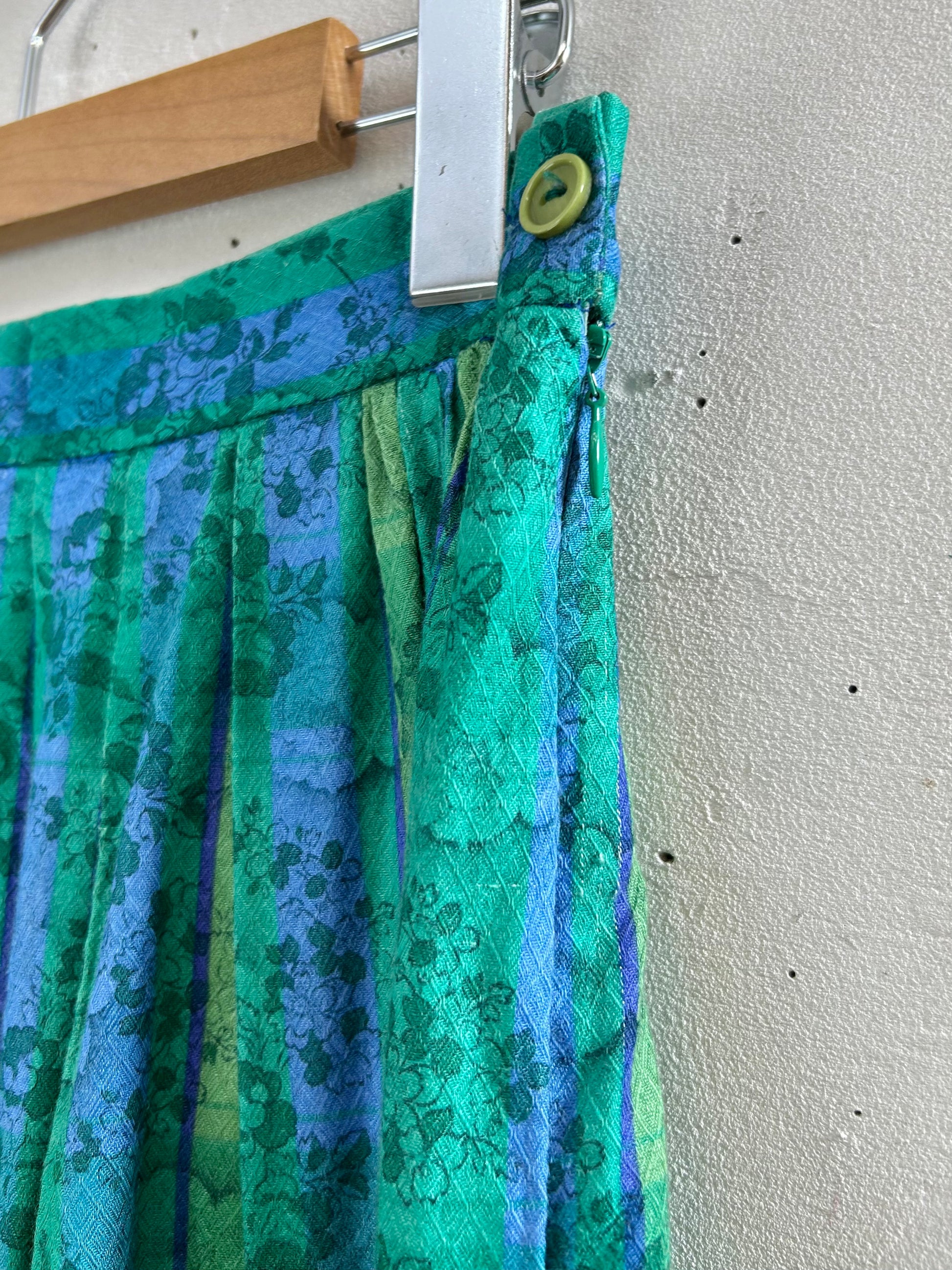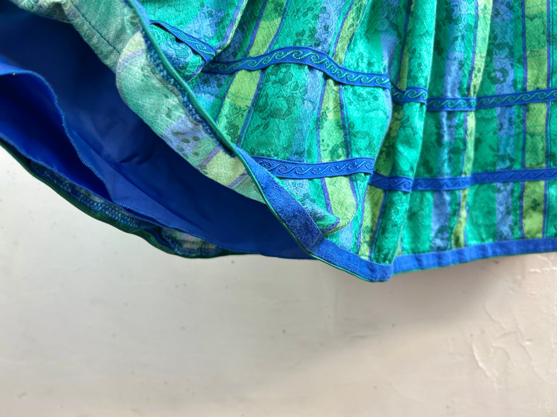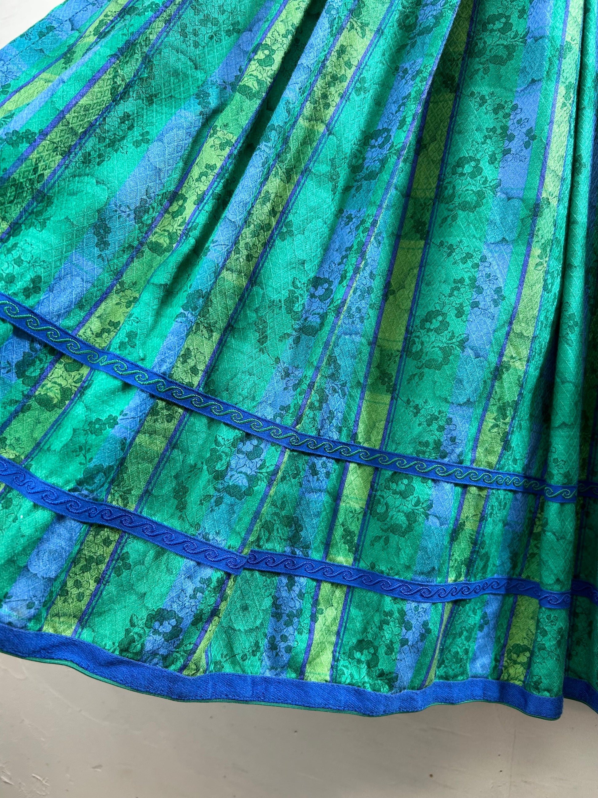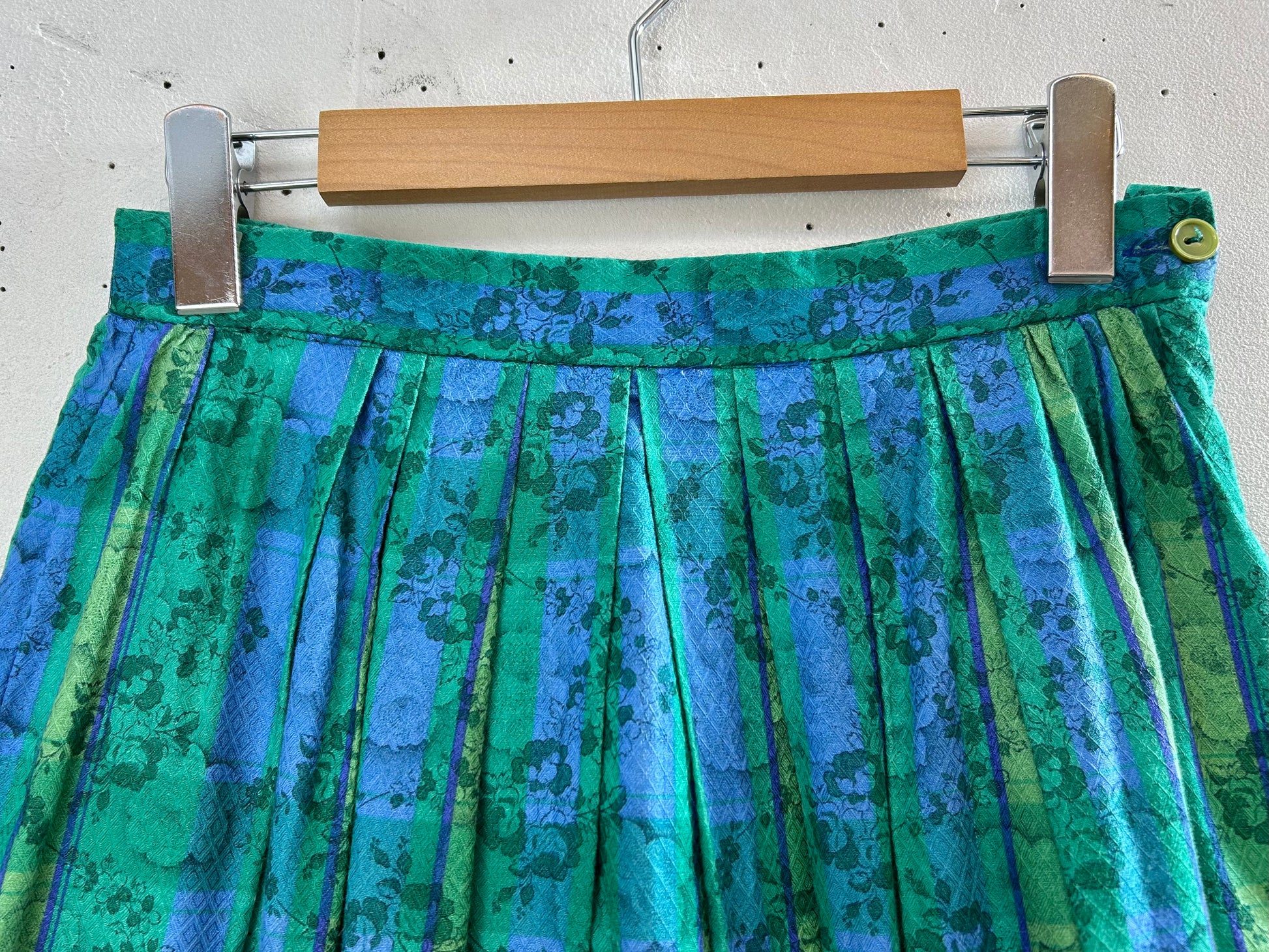 こちらのスカートは、ブルーとグリーンを基調としたストライプとフラワーのパターンが目を引く1着。