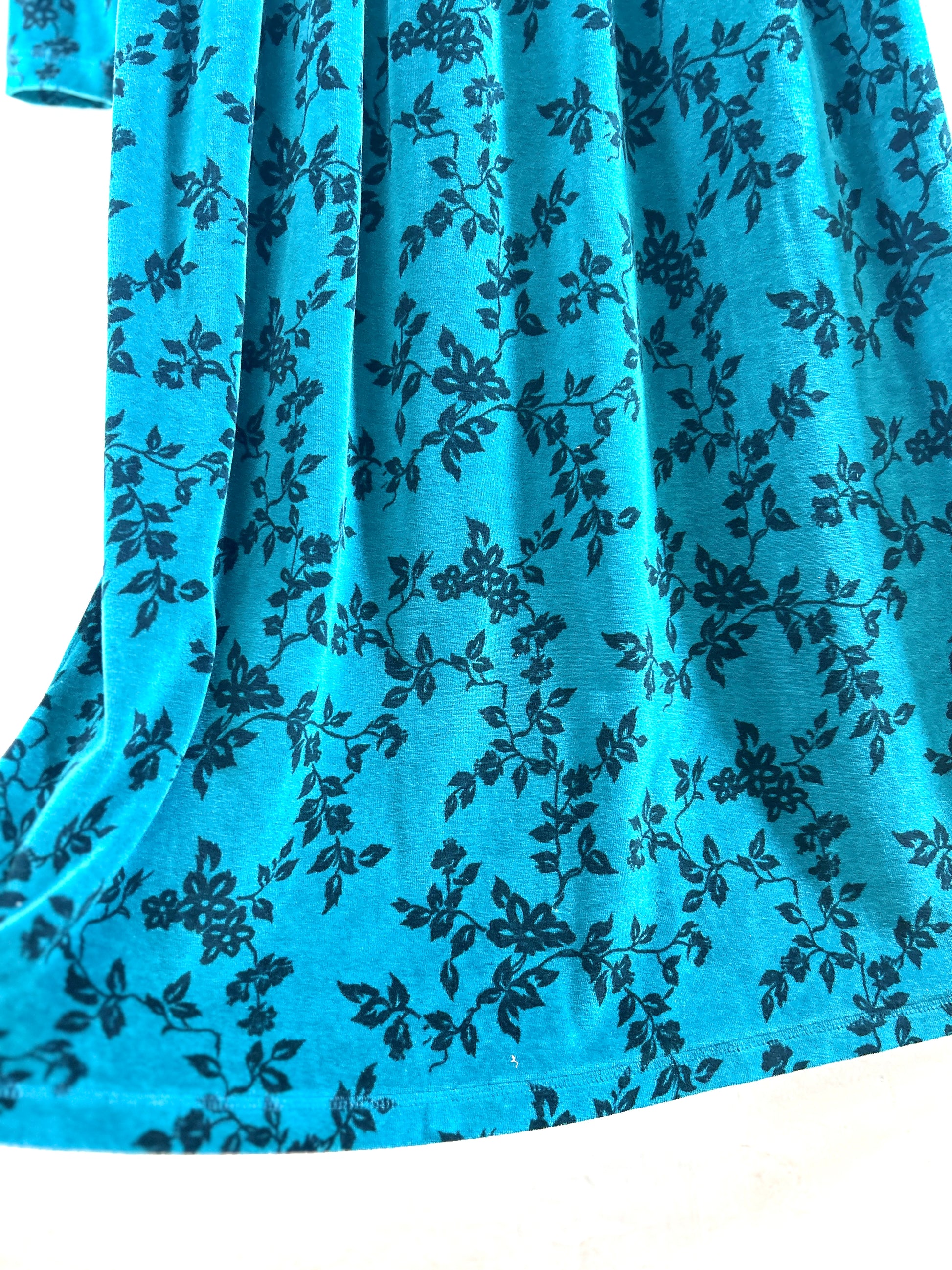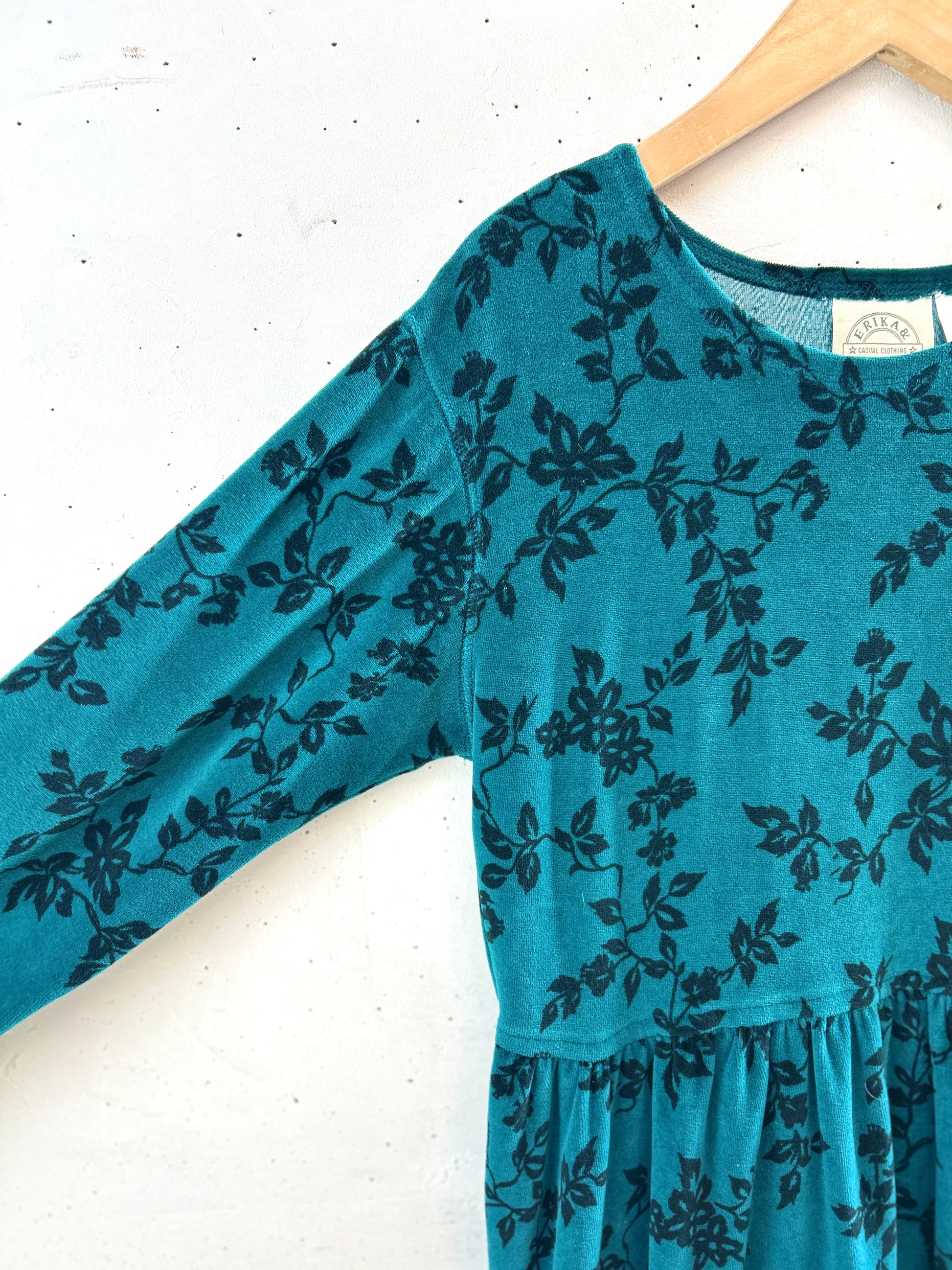 ベロア特有の深いグリーンカラーにブラックの柄が上品で印象的な1着。