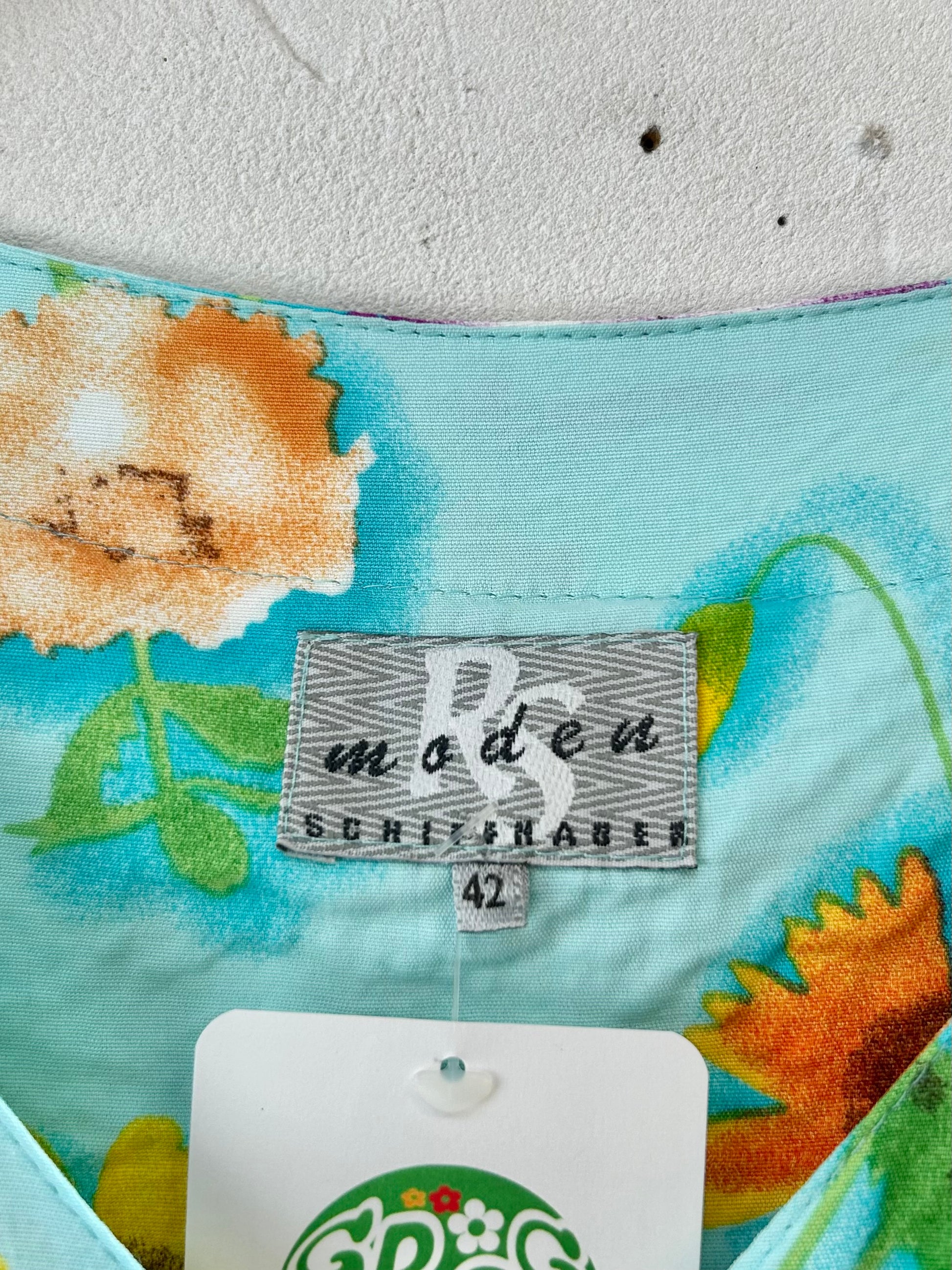 size:表記42、肩幅43cm、身幅52.5cm、ウエスト切替88cm、袖丈26cm、ウエスト切替〜裾93cm、着丈140.5cm