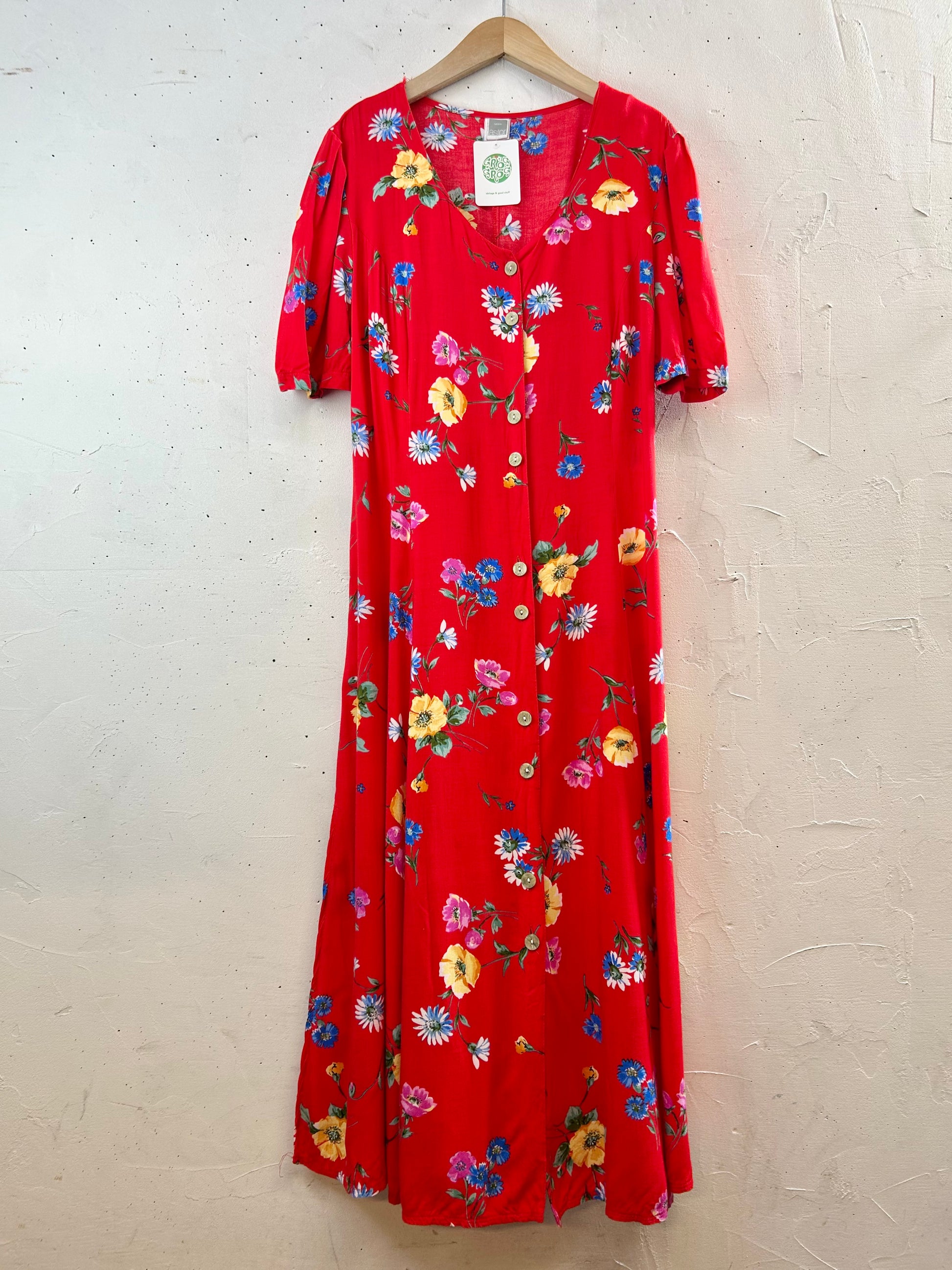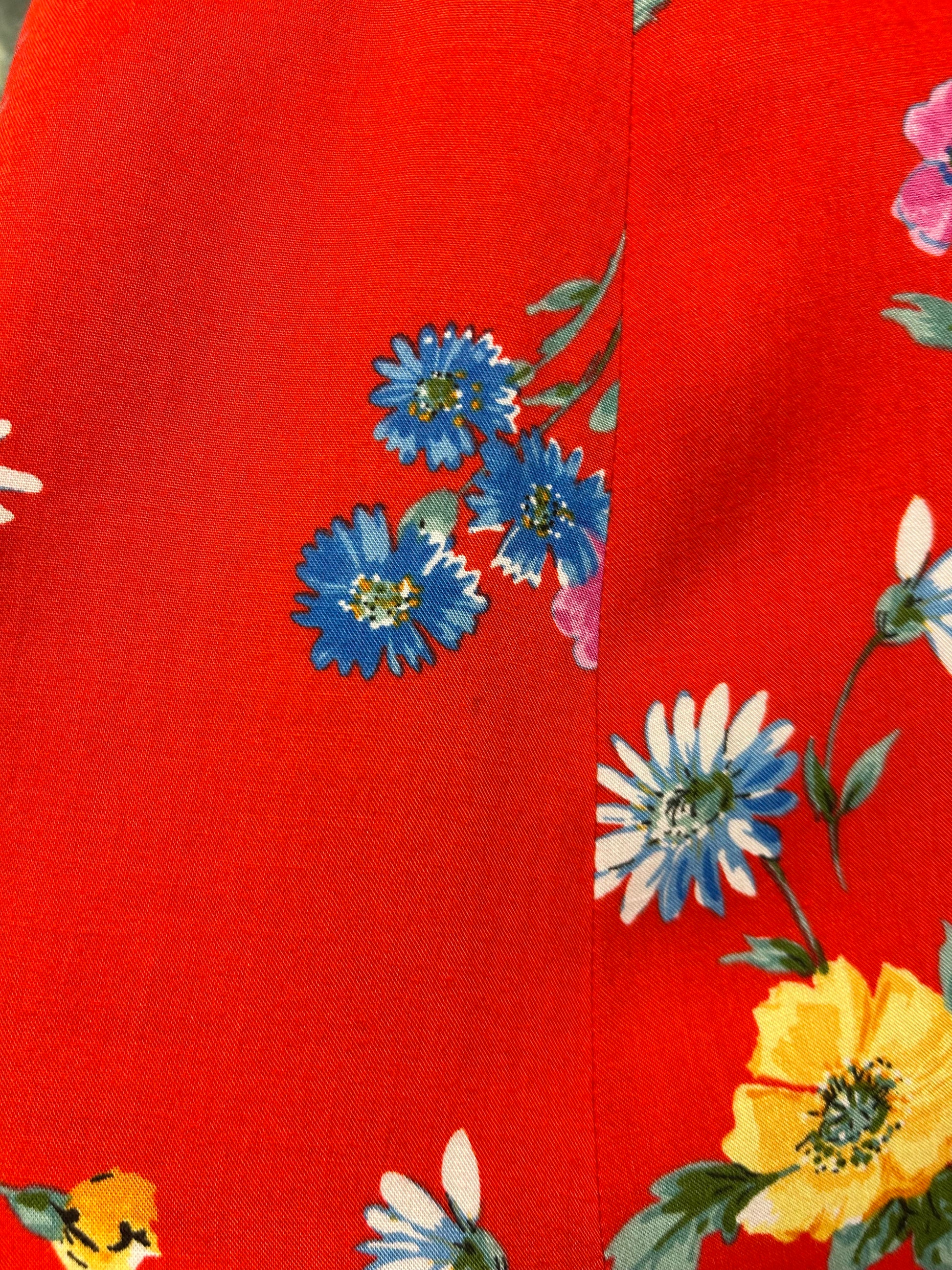 真っ赤なボディにカラフルなフラワーが映え目を惹く1着。