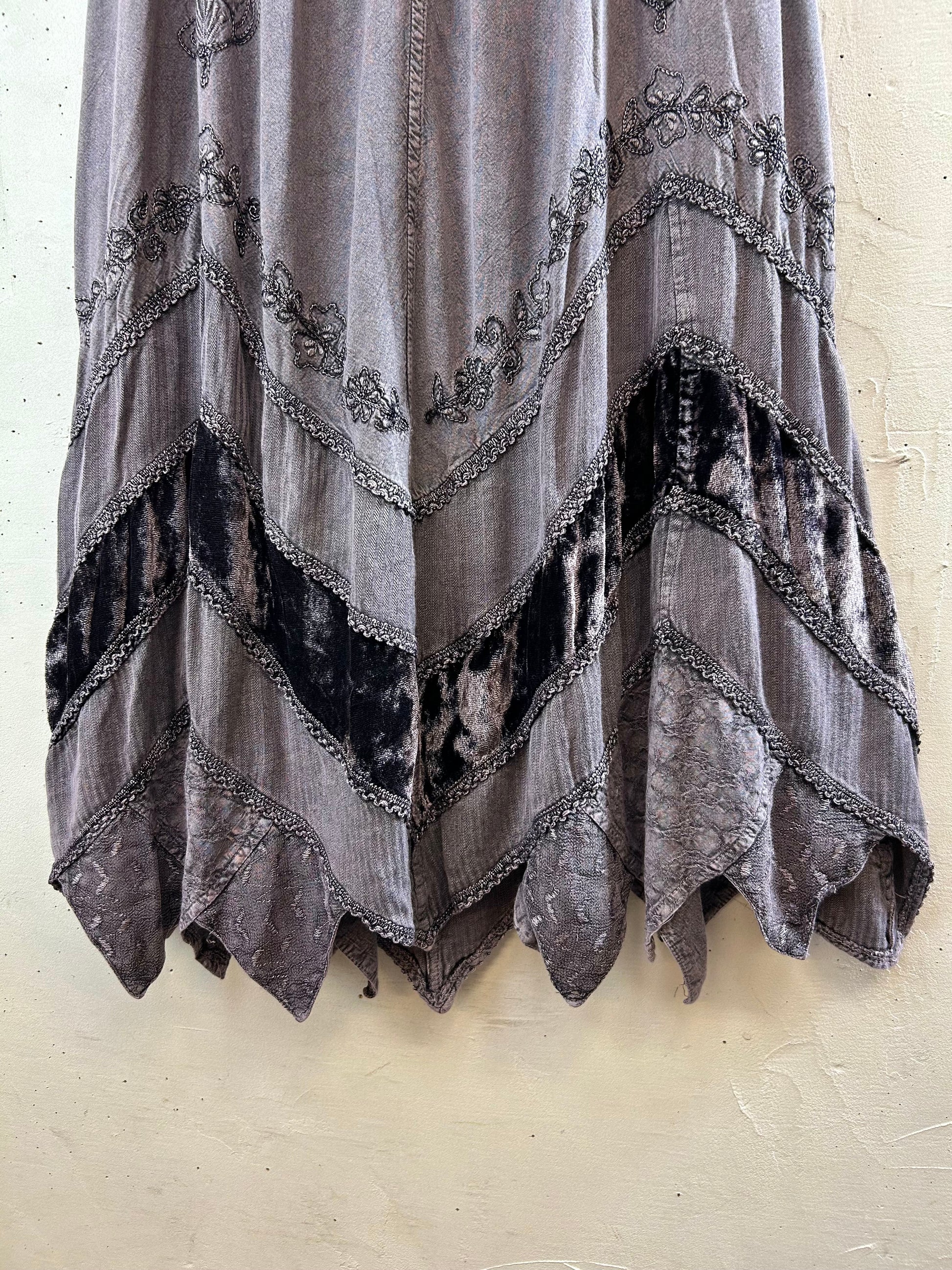 チェーンステッチで施されたフラワーやベロア生地ほ切替など細部まで凝ったデザインが素敵な一着。