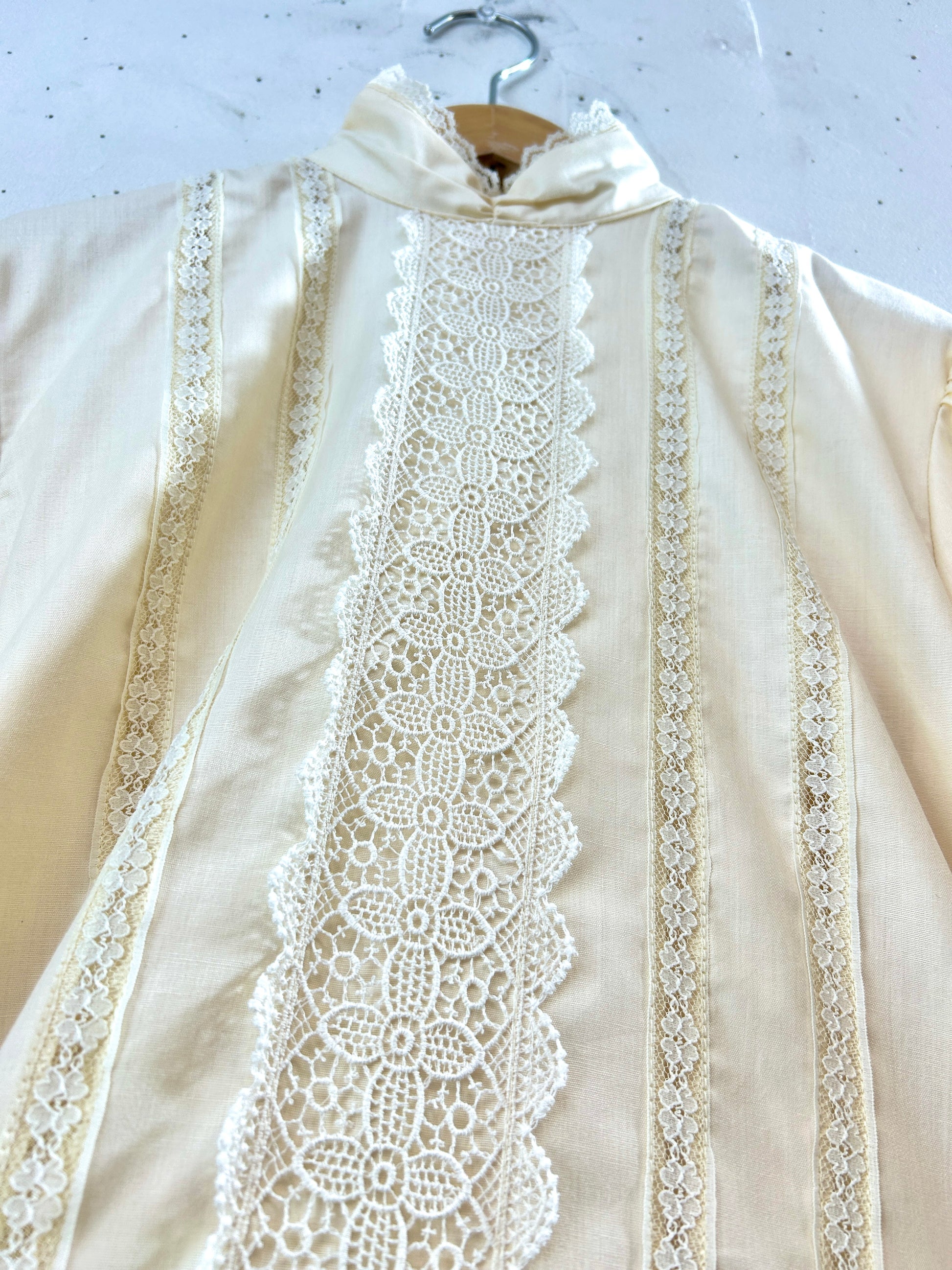 ビンテージアイテムの中でもとても人気のブラウスです。スタンドカラーに縦に施されたレースの装飾も可愛らしく、どこから見ても抜かりないデザインが流石です。