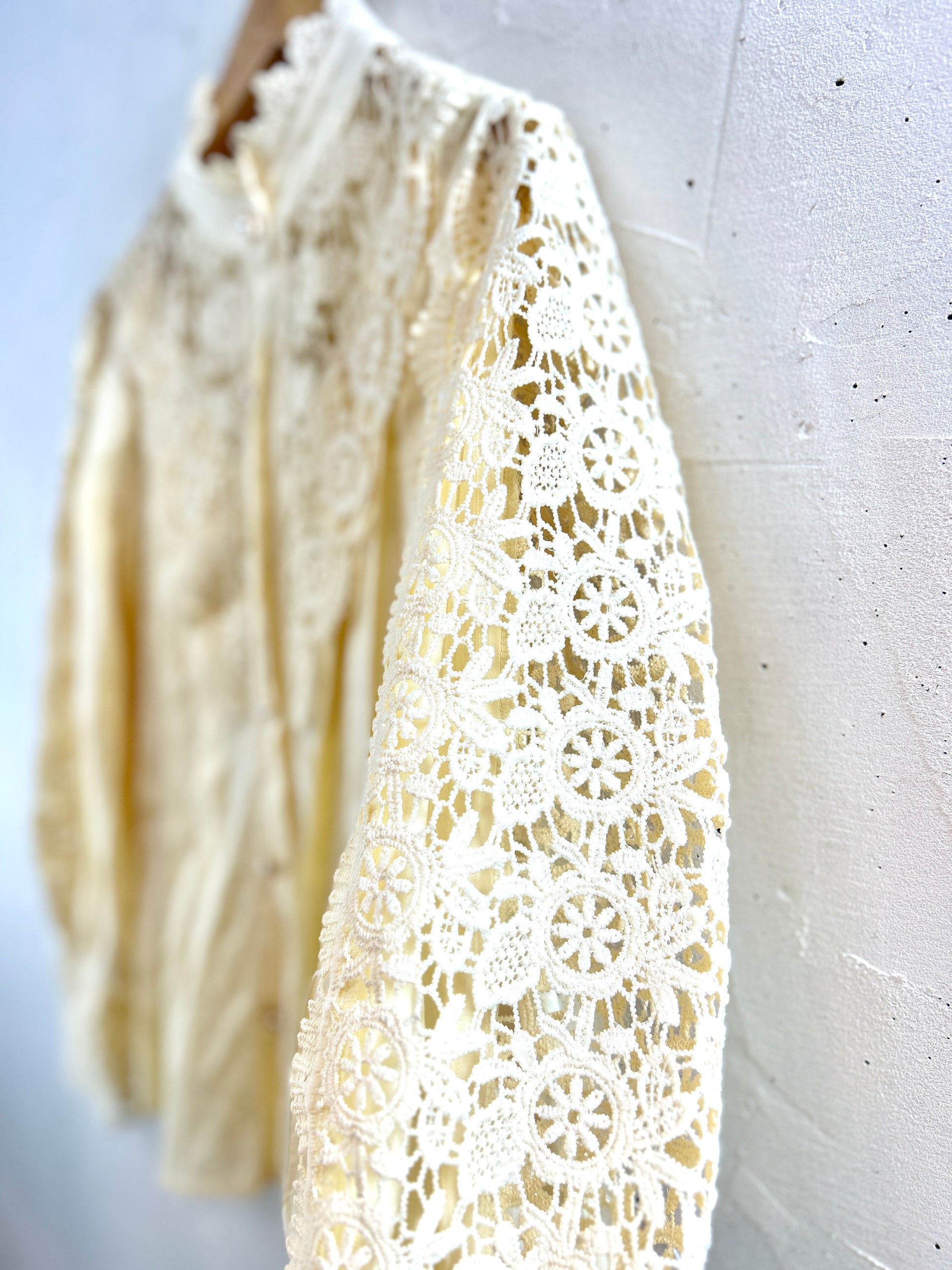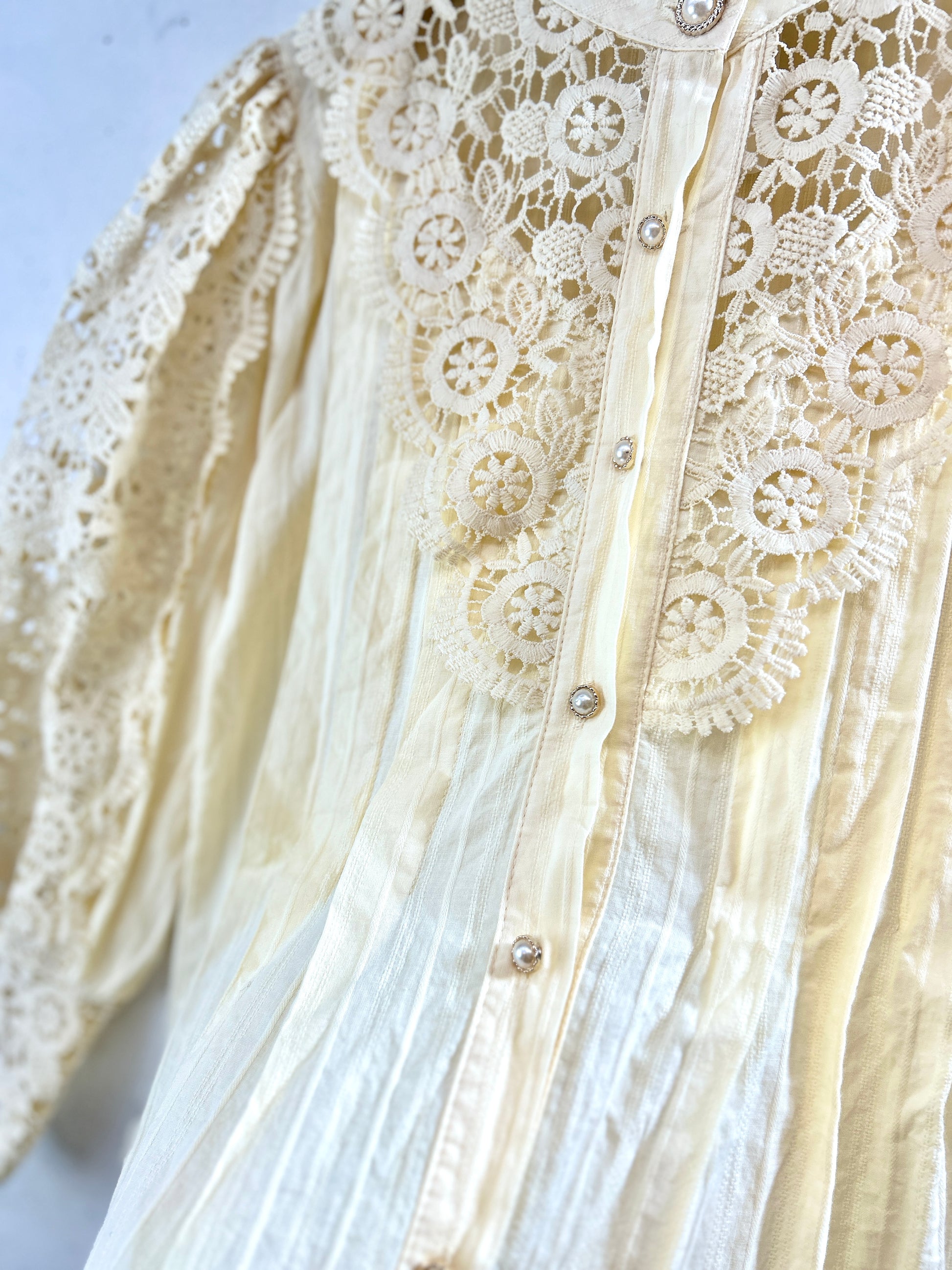 レースが施されたフロントや襟、袖が非常に可愛らしい一着。