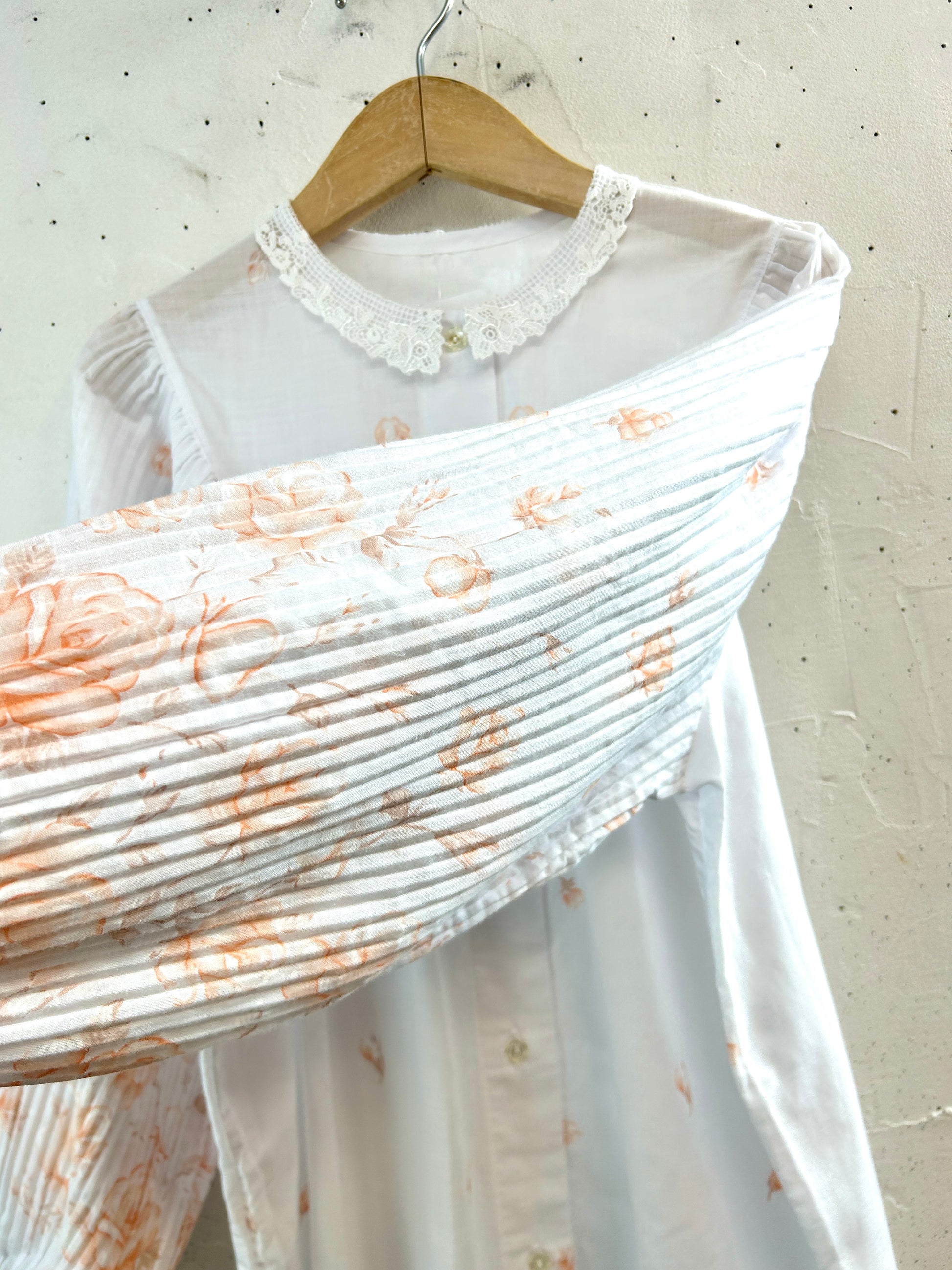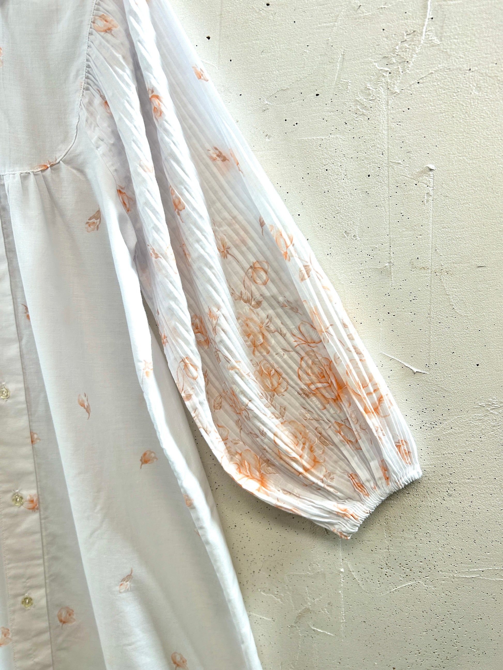 プリーツの入ったボリュームのある袖や、襟周りもレースがつき、さらに袖先や裾にかけてお花のデザインが入り全体のバランスも申し分のない1着。