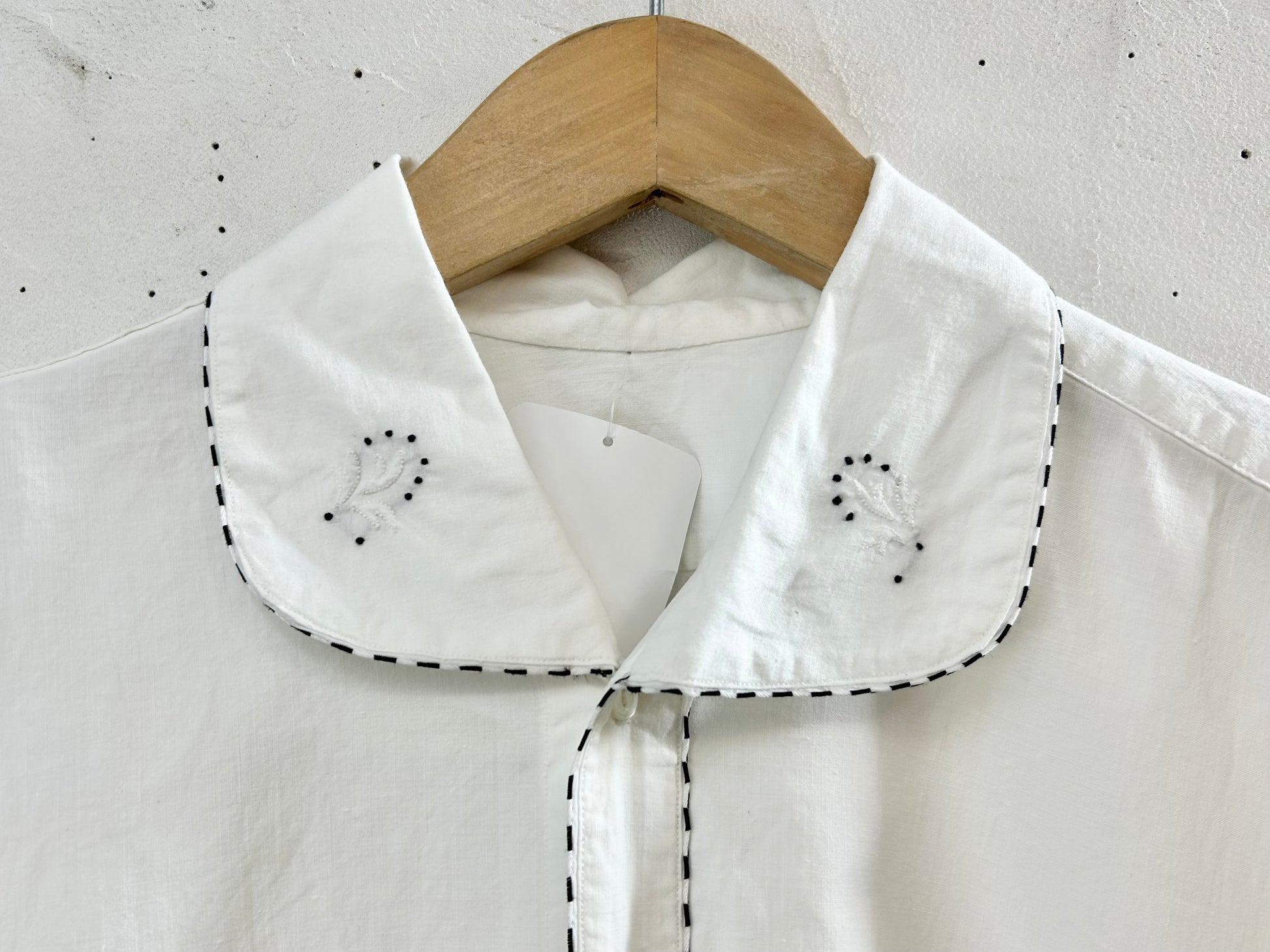 恐らくコットンのハリのある生地に、モノトーンのパイピングがアクセントになった、シンプルながらも個性溢れる一着。