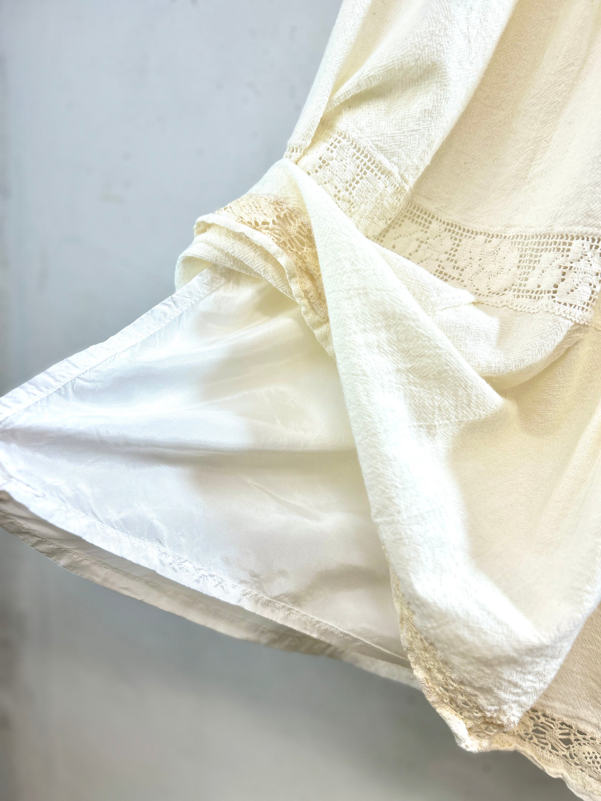 オフホワイトボディに編みレース切り替えを使ったふんわりと可愛い1着。